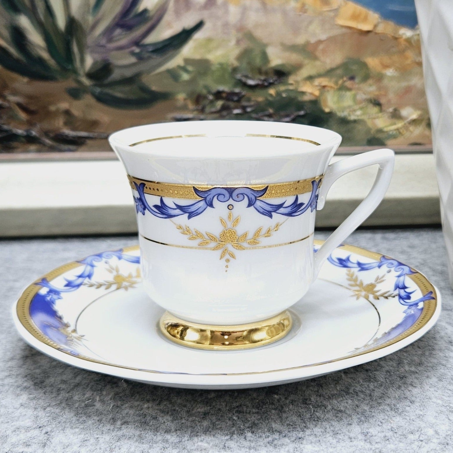 Eine schöne Tasse aus weißem Porzellan, verziert mit goldenen und blauen Details.