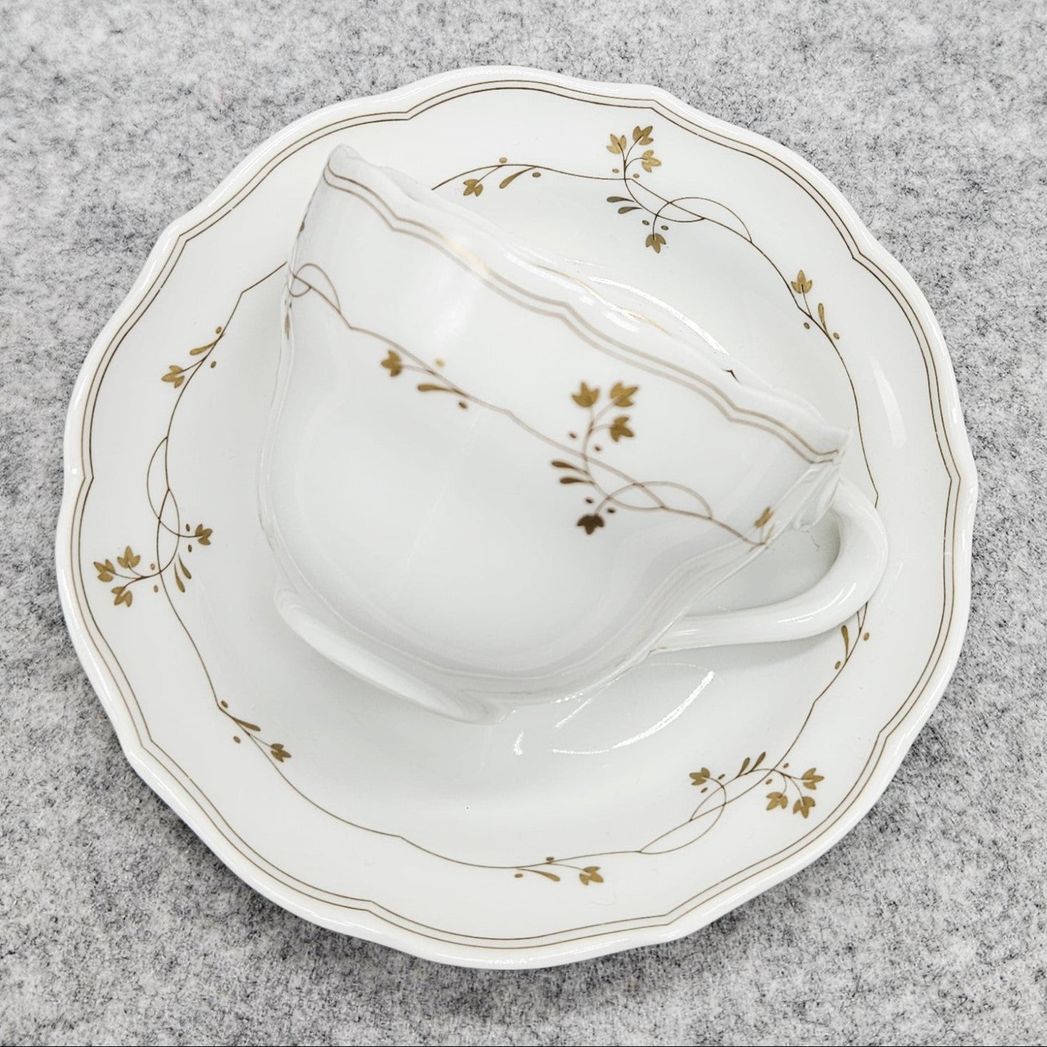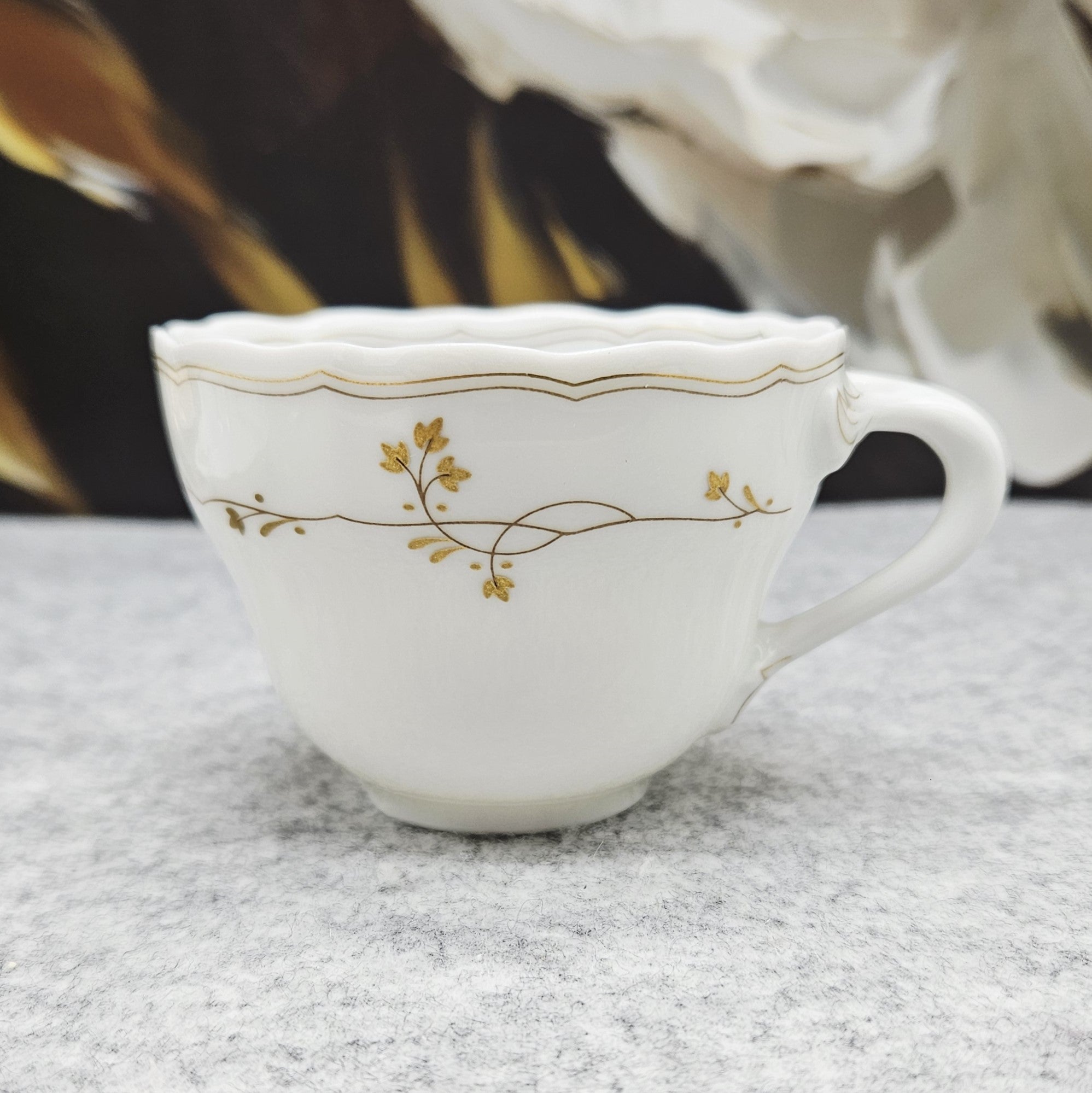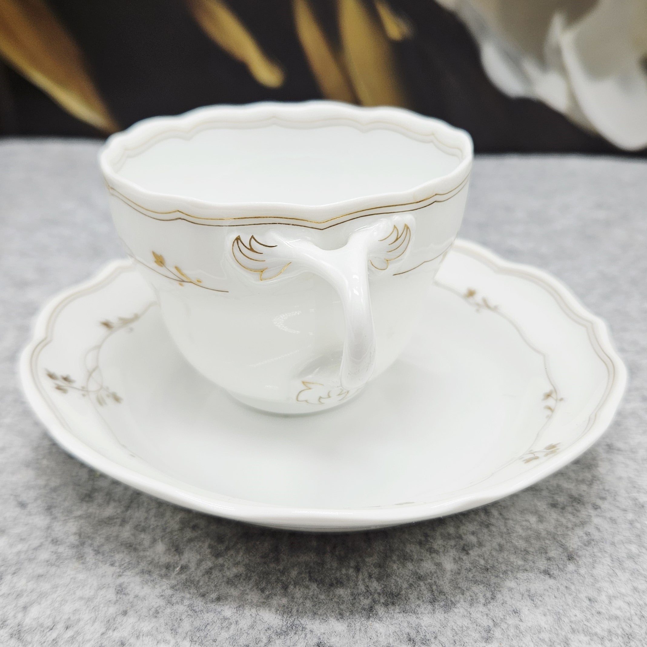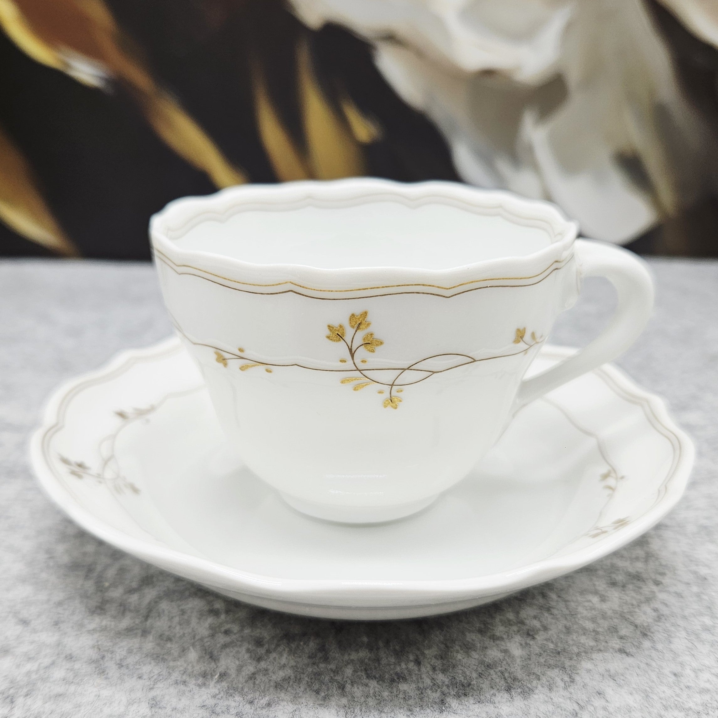 Tasse und Untertasse sind mit einem zarten goldenen Blumendekor und feinen goldenen Linien verziert, die dem Stück einen leicht luxuriösen und exklusiven Touch verleihen und gleichzeitig eine klare, klassische Ästhetik bewahren. Das Dekor ist zurückhaltend, elegant und lässt sich sowohl mit klassischen als auch mit modernen Tafeln kombinieren.