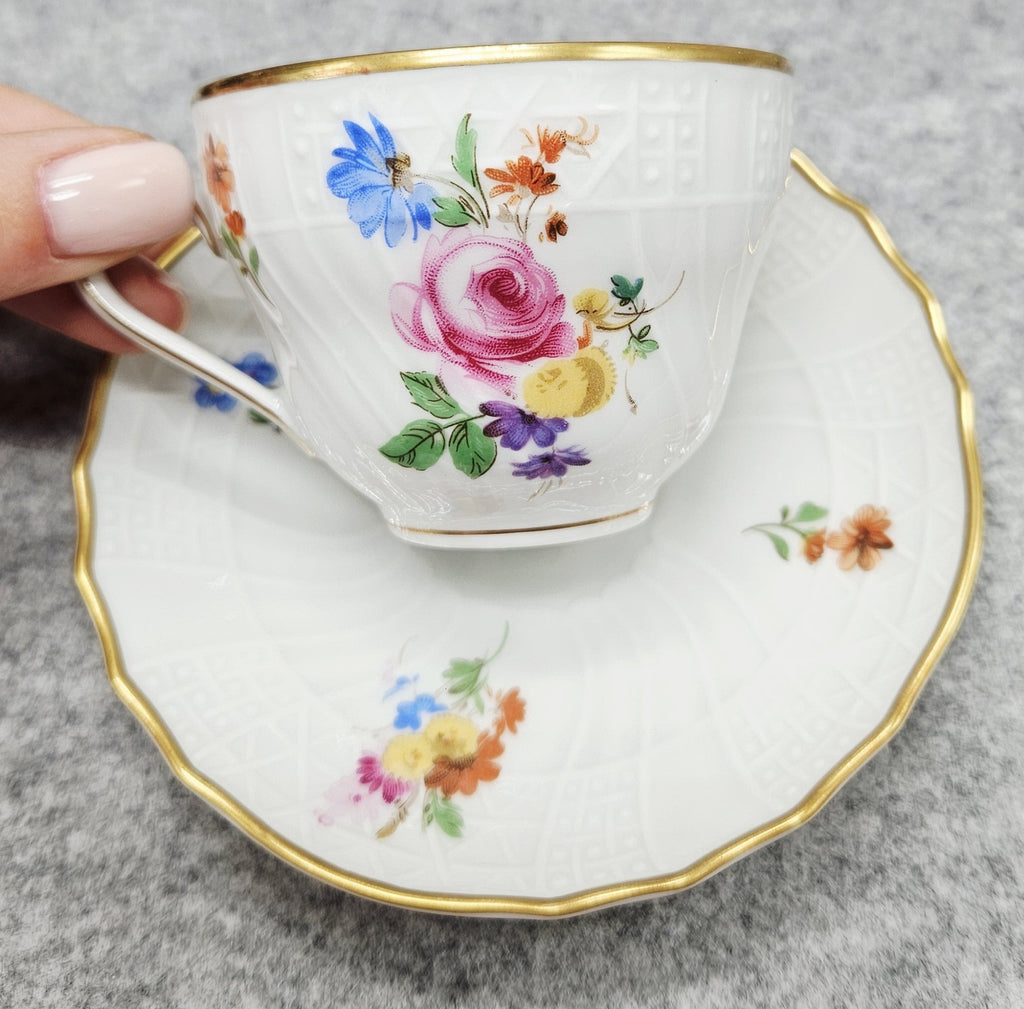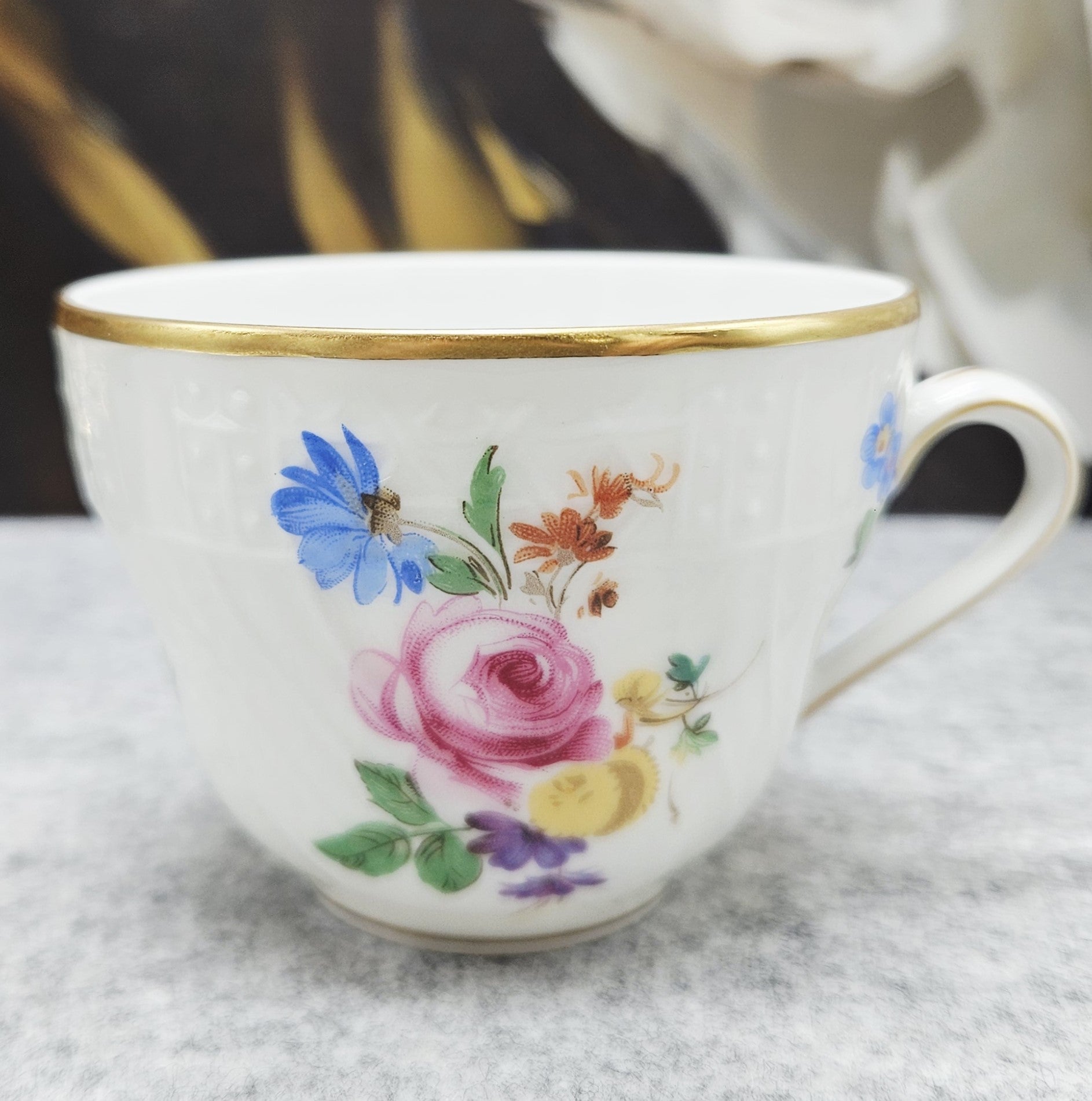 Eine wunderschöne Tasse aus weißem Porzellan, verziert mit Gartenblumenbouquets und vergoldeten Rändern. Die zarte Prägung verleiht der Tasse noch mehr Charakter und Charme. Die Tasse ist mit einem eleganten vergoldeten Henkel verziert.