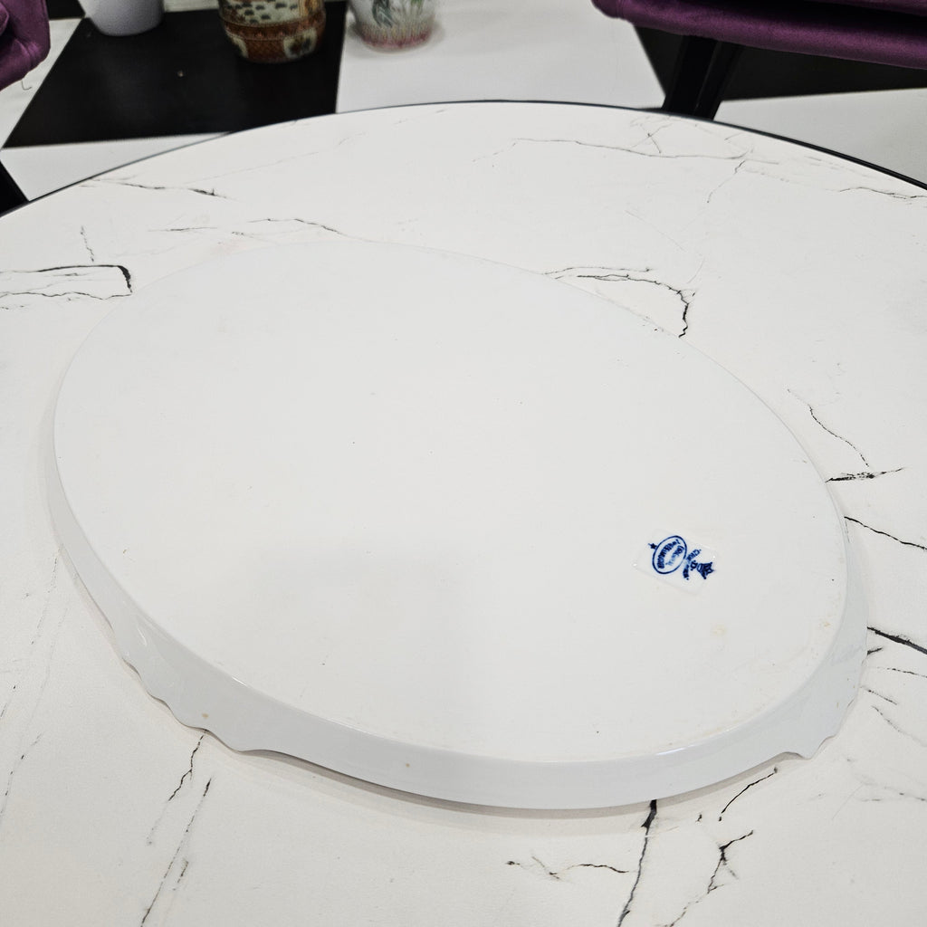 Klassisches Porzellantablett mit blauem Zwiebelmuster von außergewöhnlicher Schönheit. Verziert mit einem traditionellen kobaltblauen Ornament, das Blumen- und Fruchtmotive darstellt. Ovale Form mit zart gewellten Rändern und dekorativen Griffen.