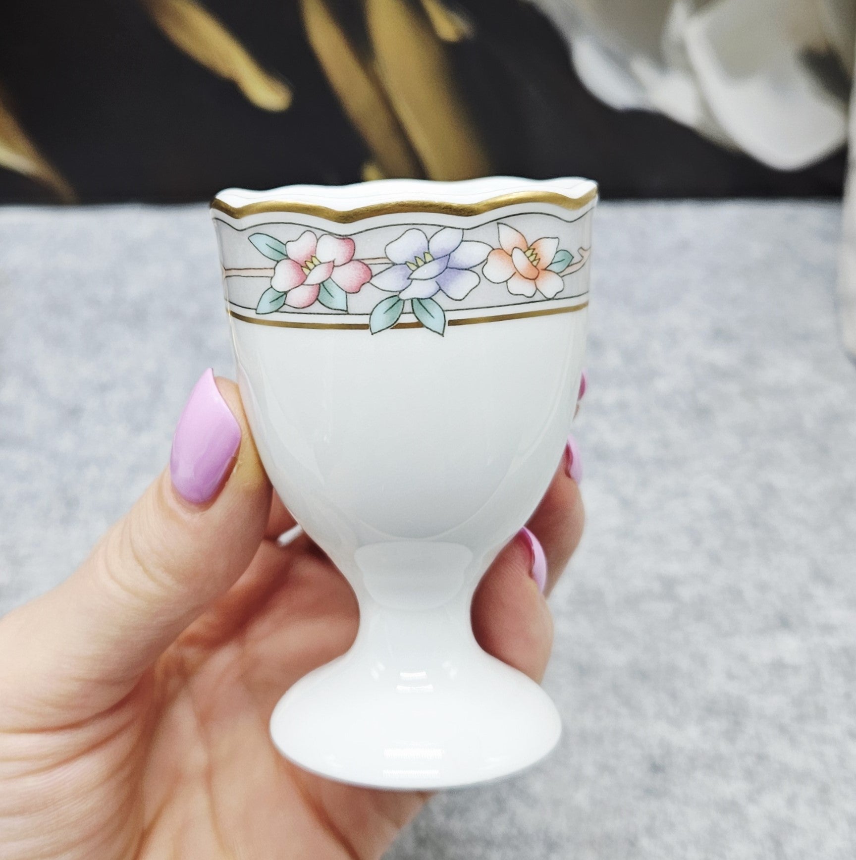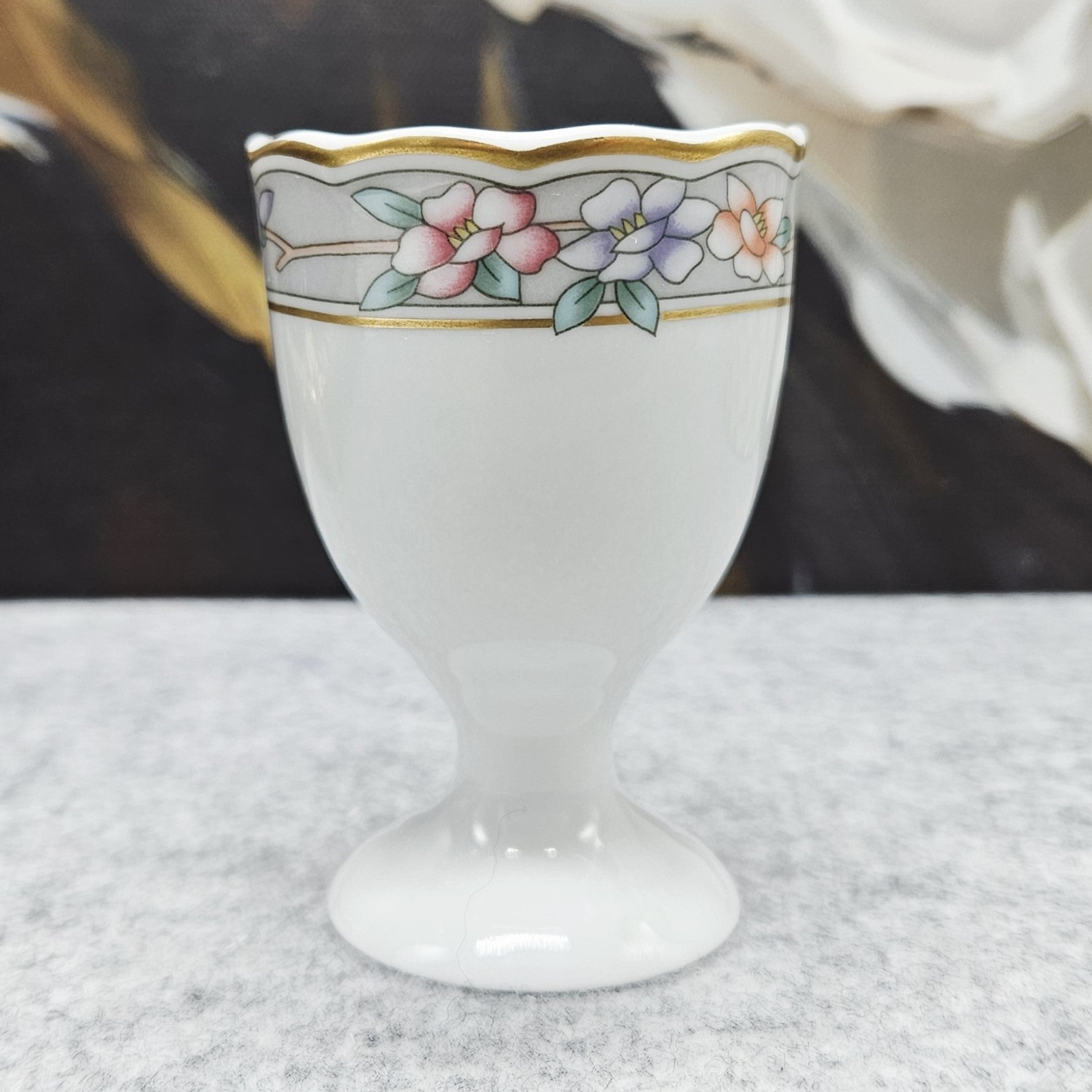 Eleganter Eierbecher aus Hutschenreuther-Porzellan mit zartem pastellfarbenem Blumendekor und einer dünnen Vergoldung. Der leicht gewellte Rand verleiht ihm noch mehr Charme und Raffinesse. Eine perfekte Wahl sowohl für den täglichen Frühstückstisch als auch zur Ergänzung Ihrer Sammlung.