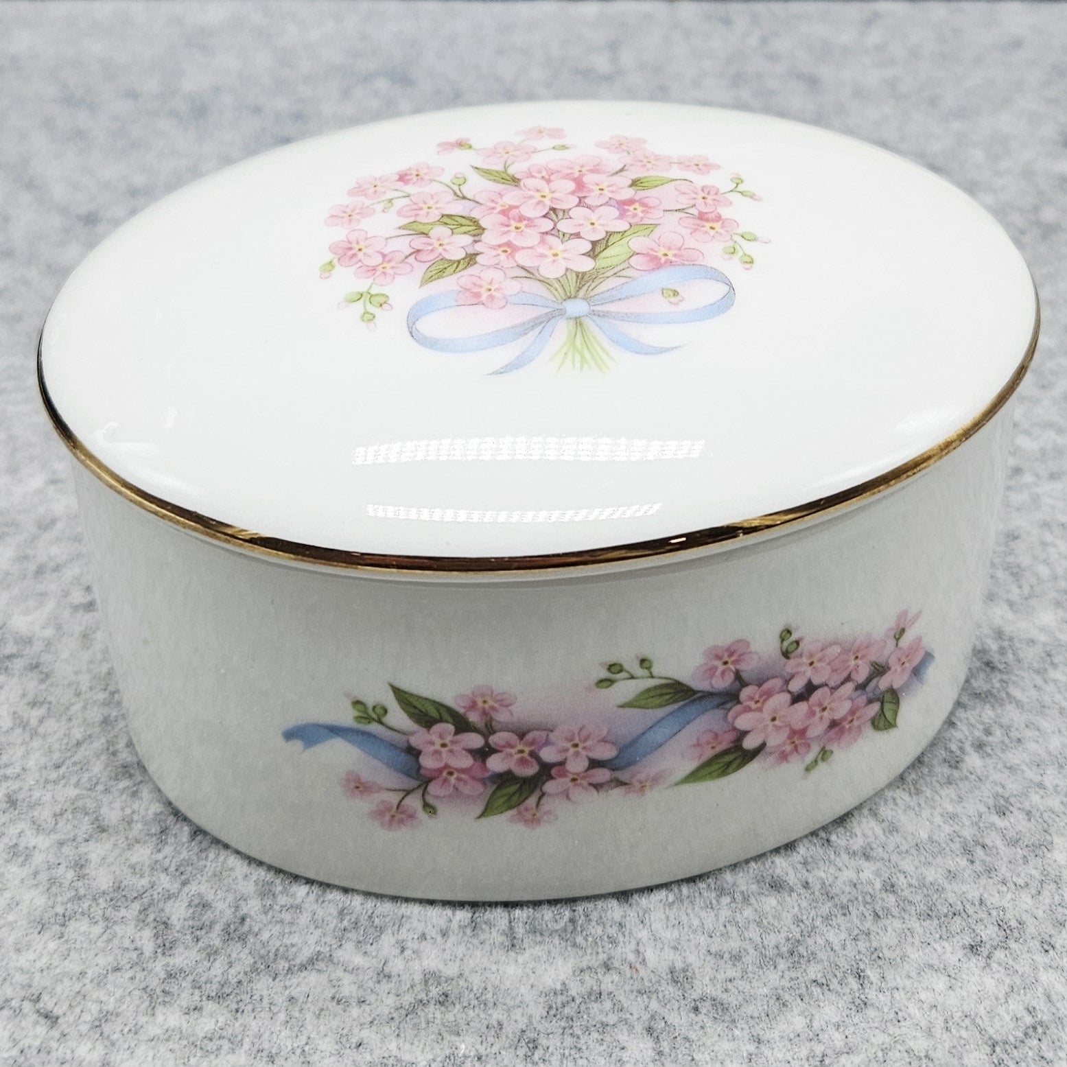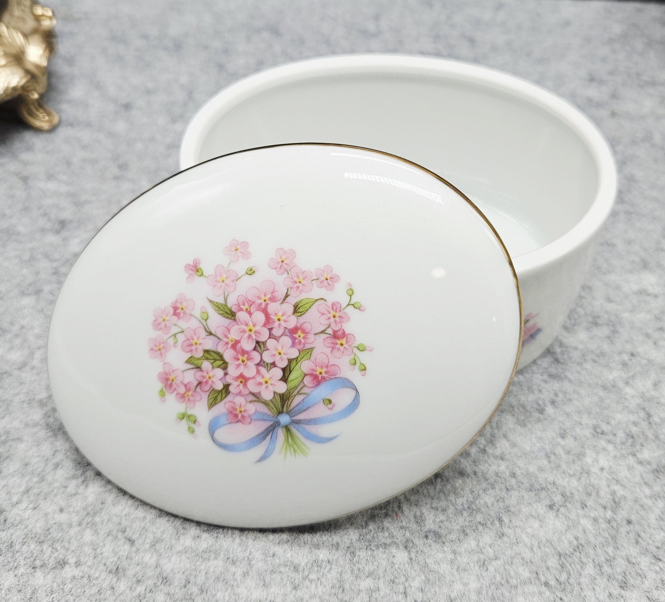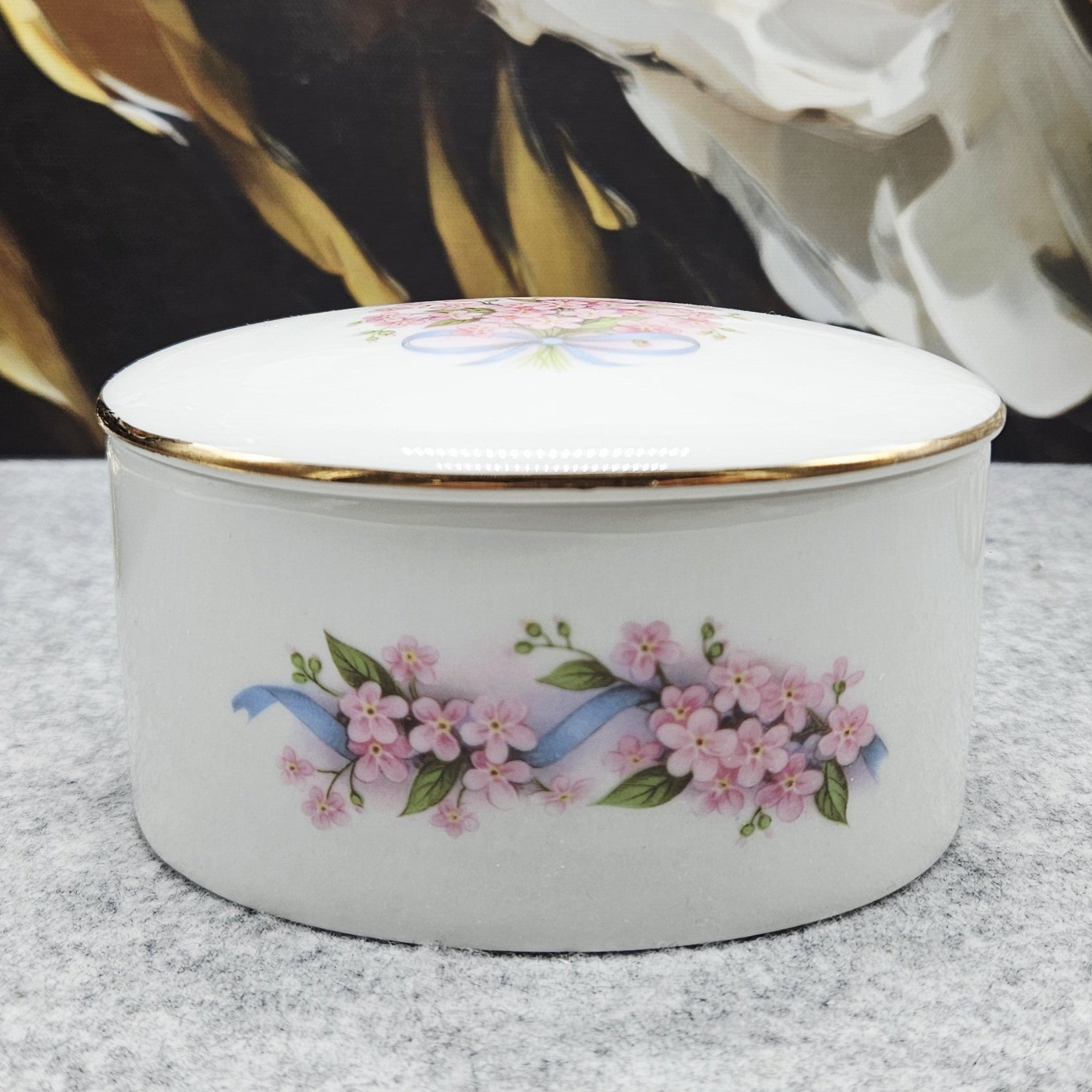 Elegante JOHANN SELTMANN Vohenstrauss Porzellandose mit Deckel, verziert mit rosa Blumen und einem goldenen Band.