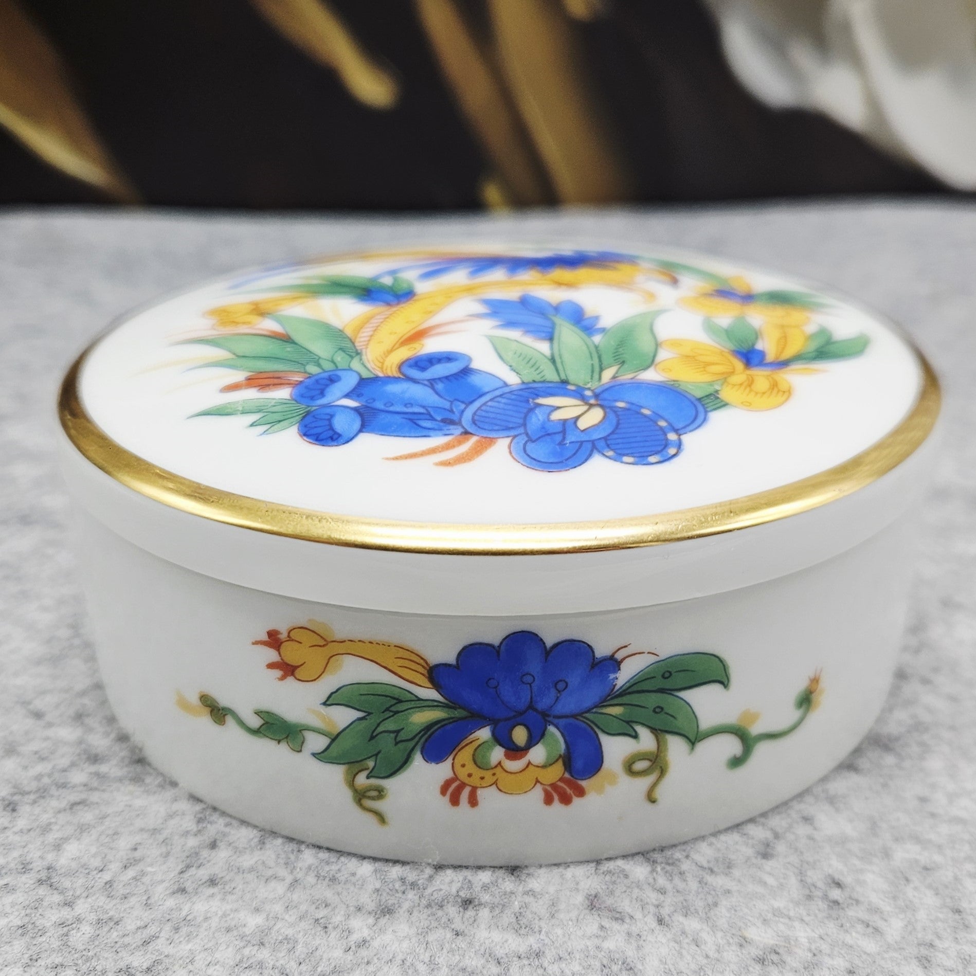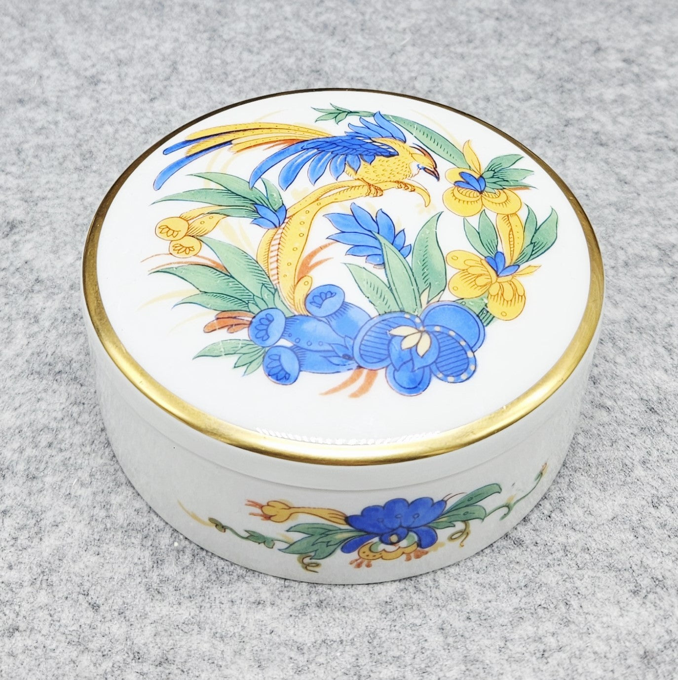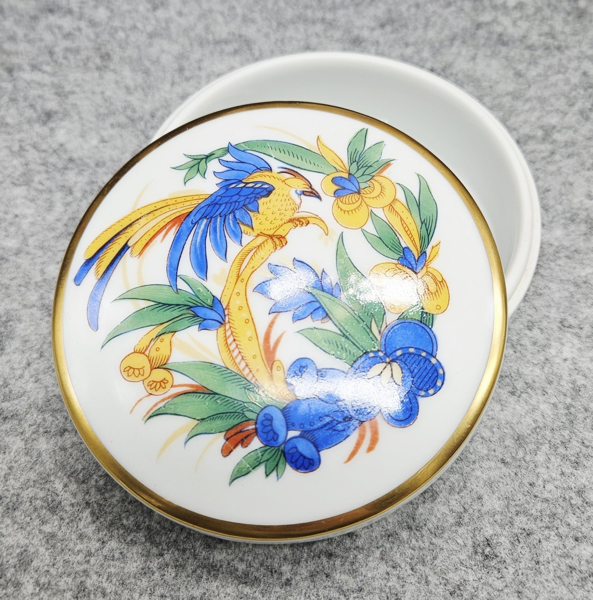 Dieses luxuriöse Dekorationsstück aus Rosenthal-Porzellan ist eine einzigartige Dose, die jedes Interieur aufwertet. Sie ist aus feinstem weißen Porzellan gefertigt, hat eine klassische runde Form und eine subtile Eleganz. Der Deckel ist mit einem exotischen Blumen- und Vogelmotiv in leuchtenden Blau-, Gelb- und Grüntönen verziert, die harmonisch mit einem dünnen goldenen Band kontrastieren.