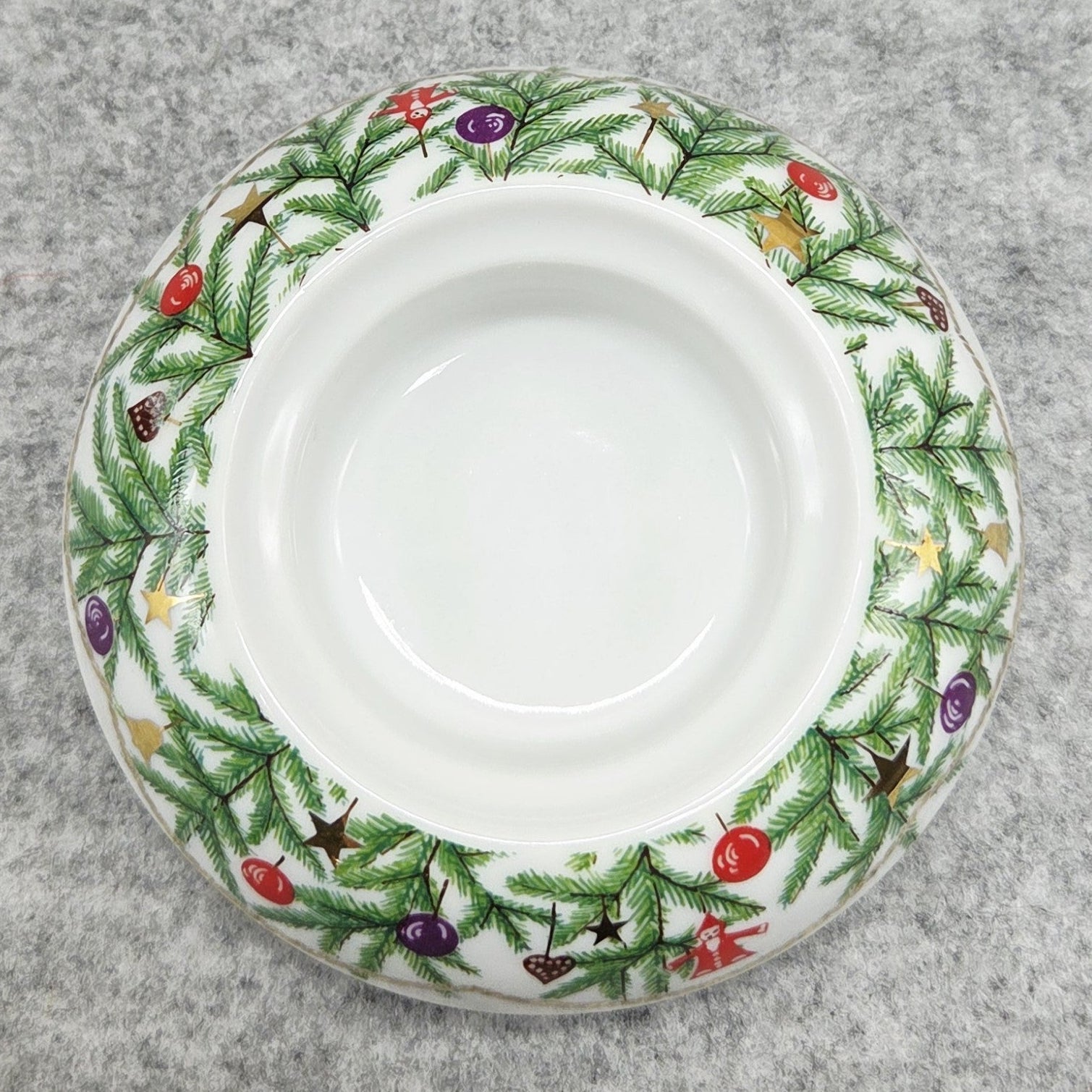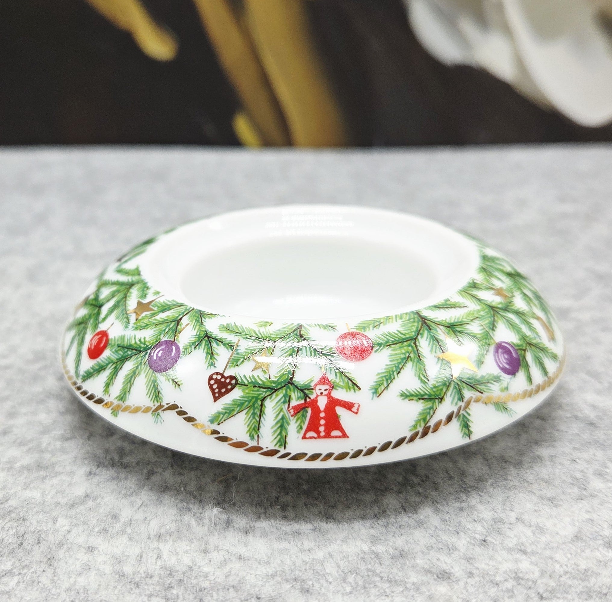 Der Kerzenhalter ist mit festlichen Weihnachtsmotiven wie Tannenzweigen, bunten Blasen, Sternen und zarten Details verziert, die ein gemütliches und warmes Gefühl vermitteln. Das klassische weiße Porzellan fügt sich harmonisch in die Einrichtung ein, während die sorgfältig gearbeiteten Details die hohe Qualität und Ästhetik des Stücks unterstreichen.