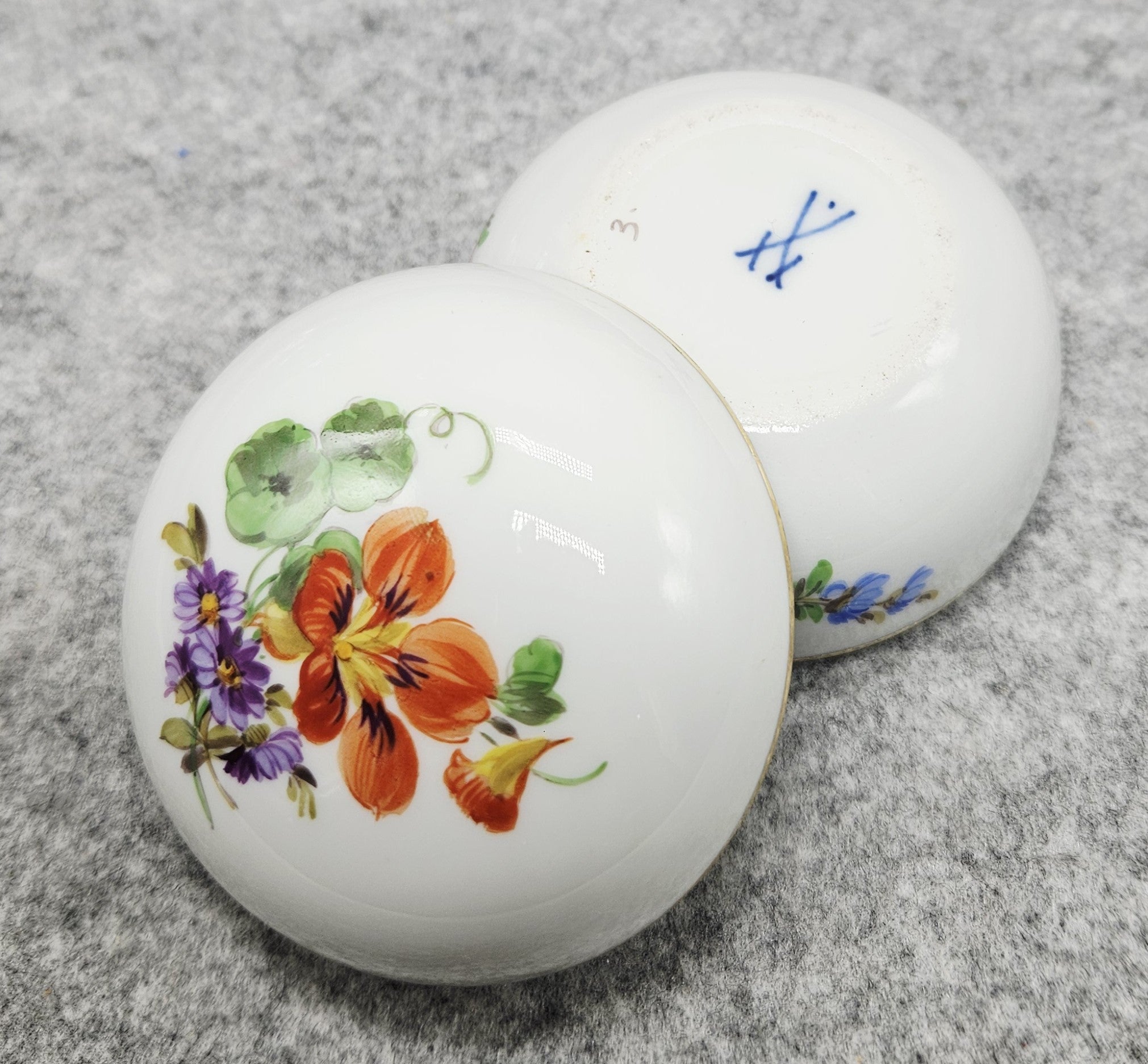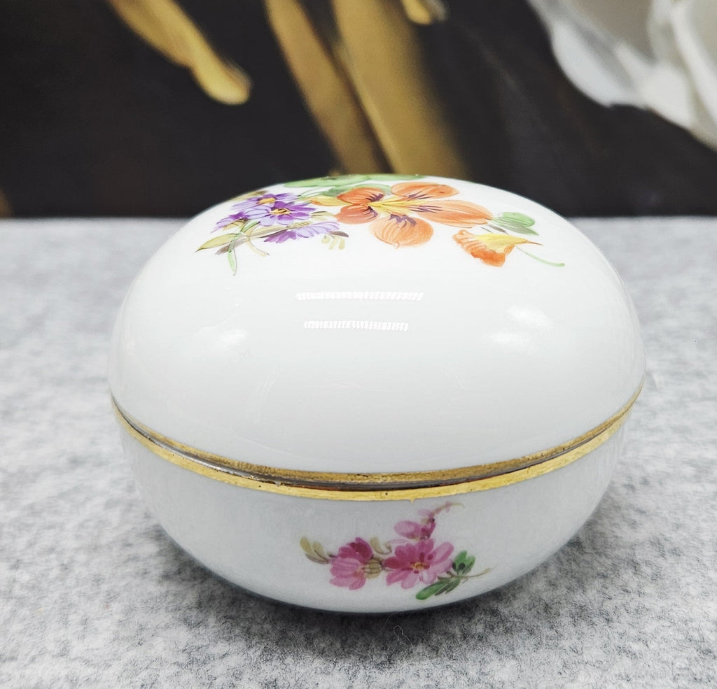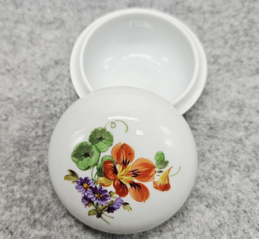 Eine elegante Meissener Porzellandose mit einer handgemalten Blumenkomposition - leuchtend orange, violett und grüne Blattdetails erzeugen den lebendigen, klassischen Charakter der Meissener Botanikmalerei. Die glatte Form des weißen Porzellans und die dezenten goldenen Akzente unterstreichen die raffinierte Ästhetik und traditionelle Qualität der Manufaktur.