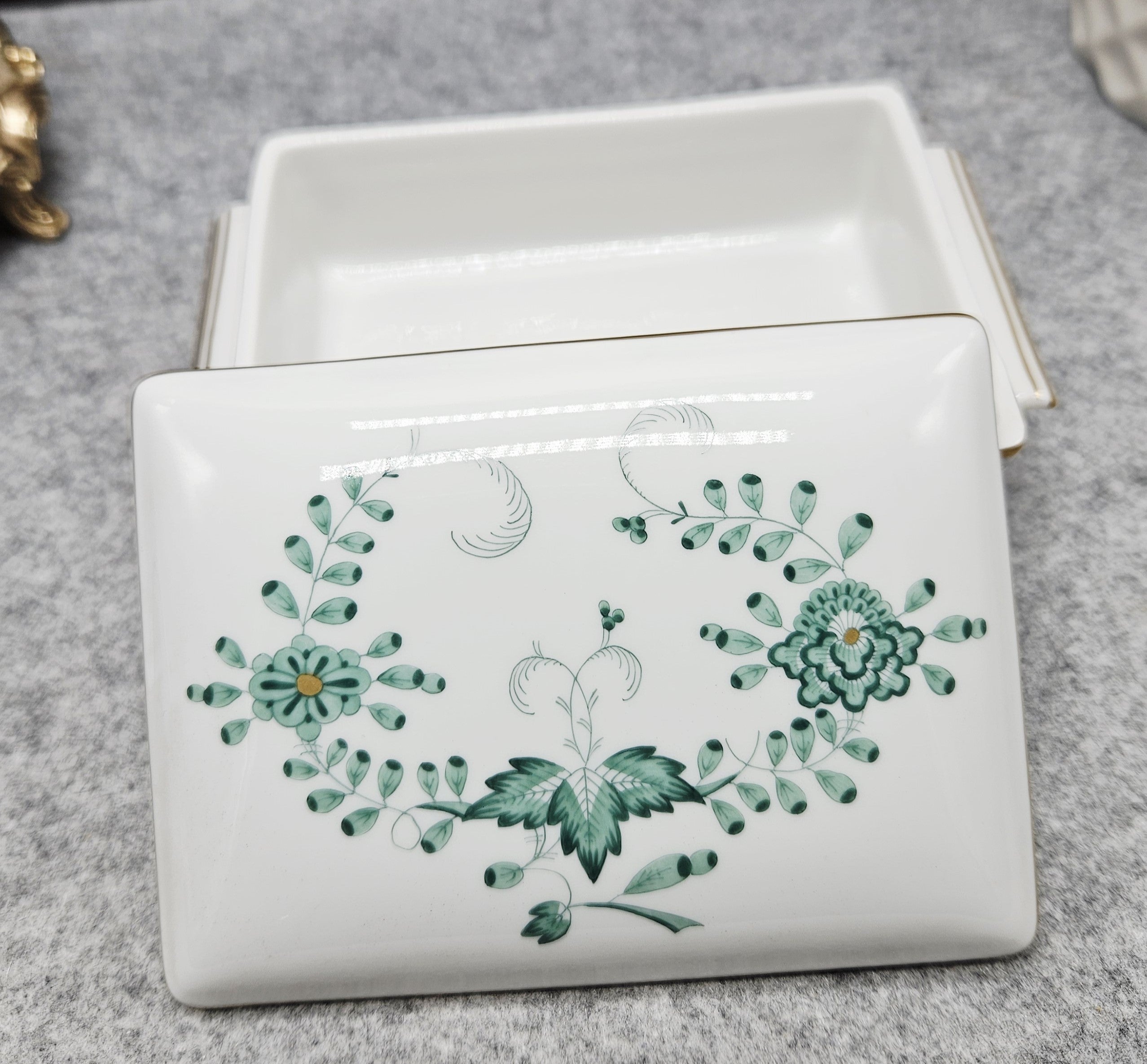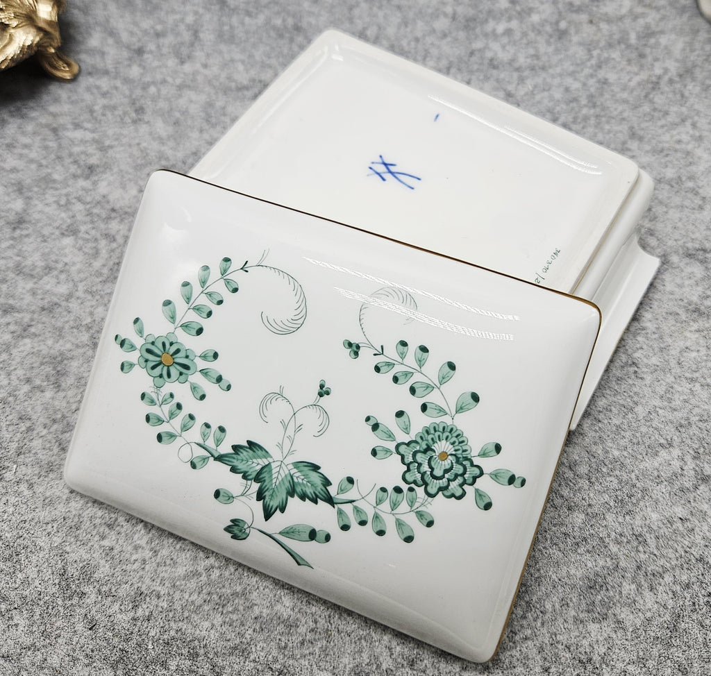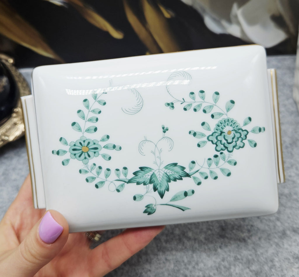 Beeindruckende Dose aus weißem Meissener Porzellan mit Deckel. "Green Indian"-Kollektion.