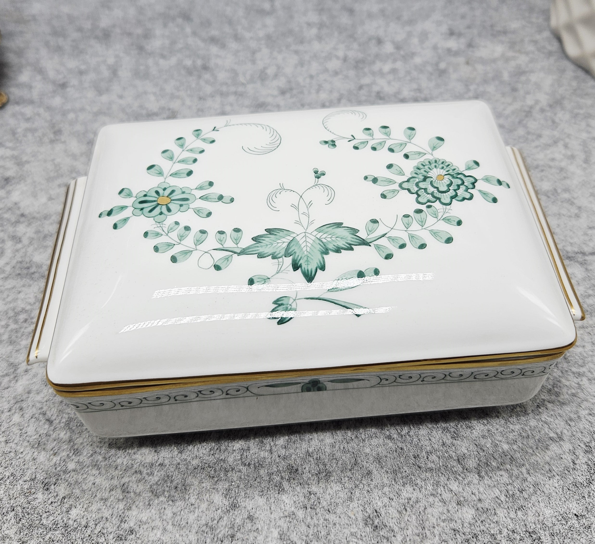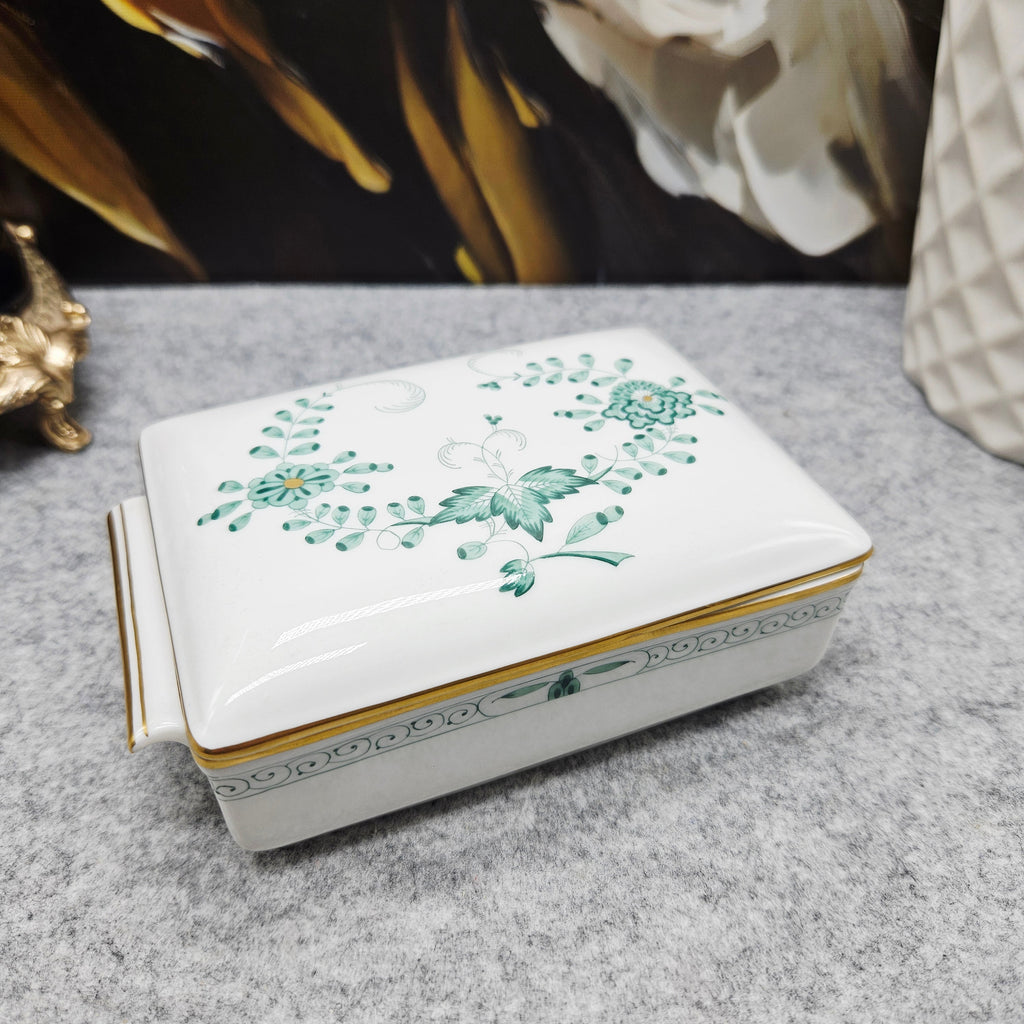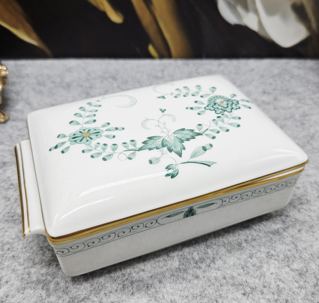 Beeindruckende Dose aus weißem Meissener Porzellan mit Deckel. "Green Indian"-Kollektion.