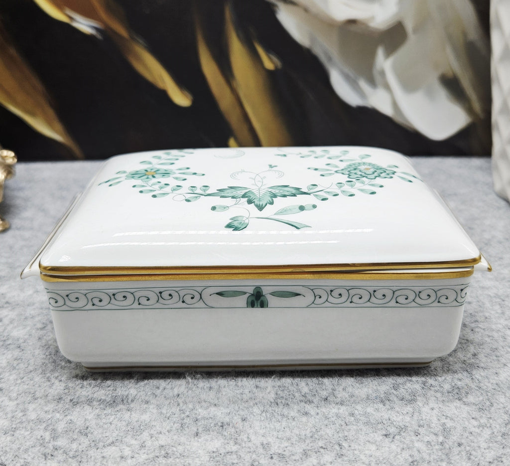 Handbemalte, vergoldete, königlich-weiße Meissener Porzellandose mit Deckel. Sammlung "Green Indian".