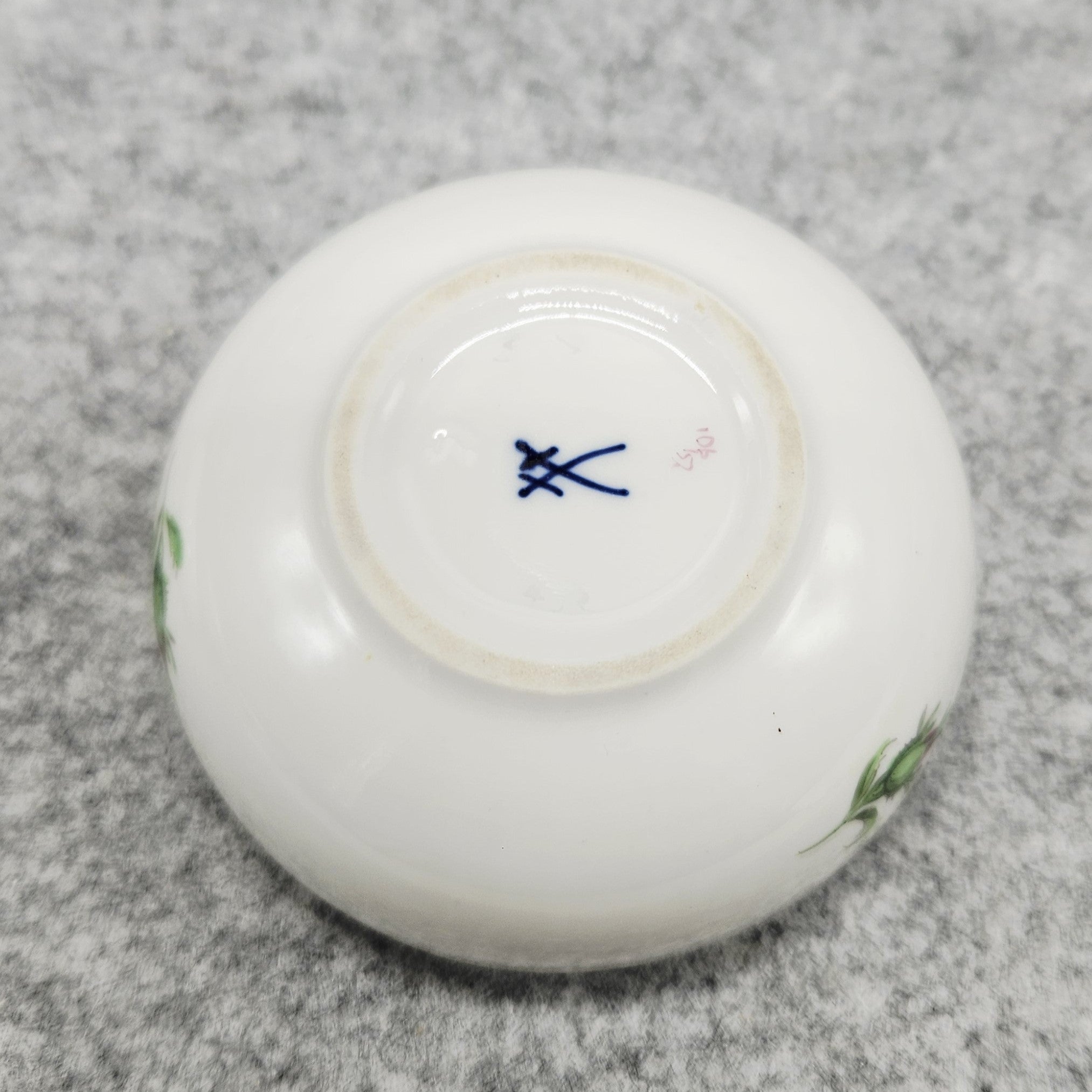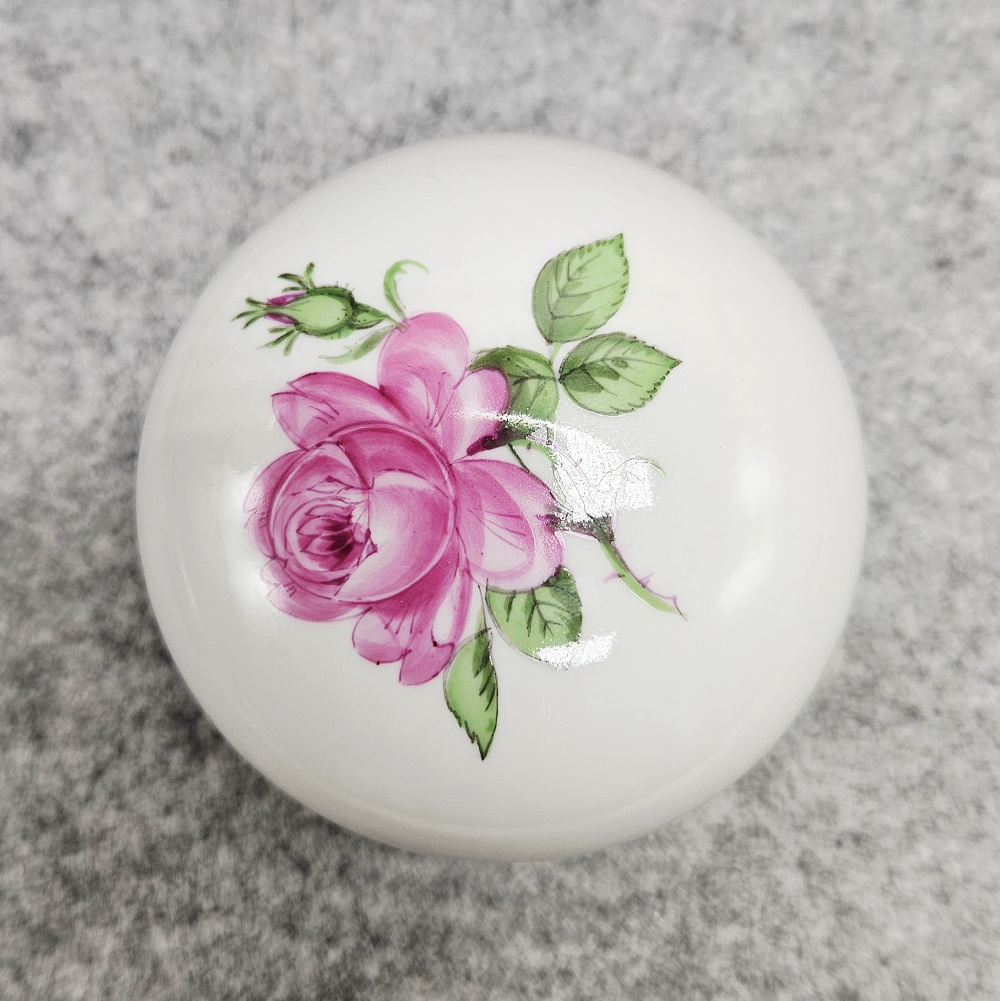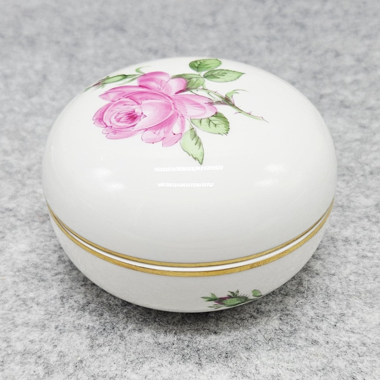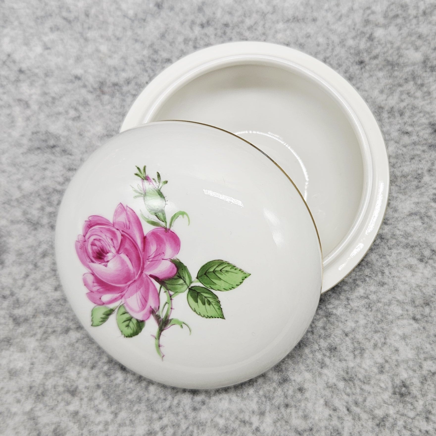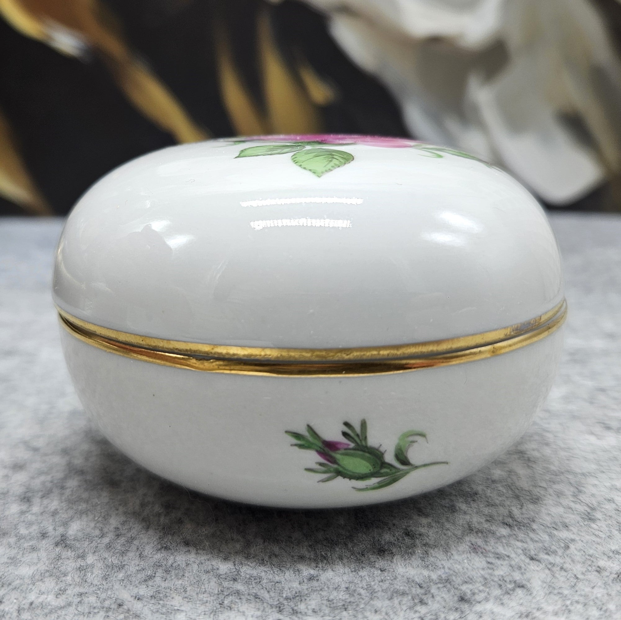 Kleine, klassische Dose aus weißem Meissener Porzellan mit Deckel, verziert mit einer handgezeichneten Rose (Durchmesser ~7,7 cm)