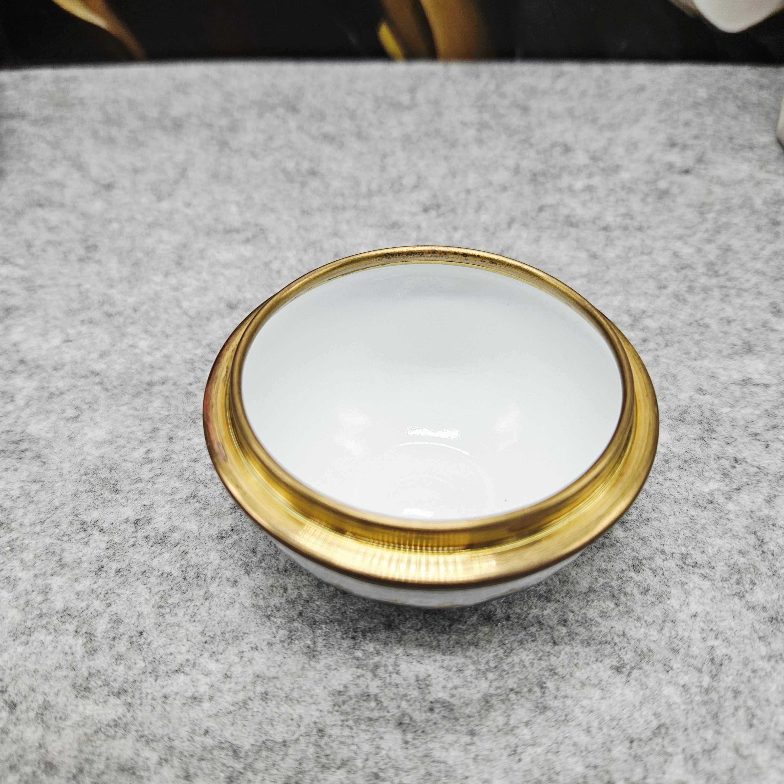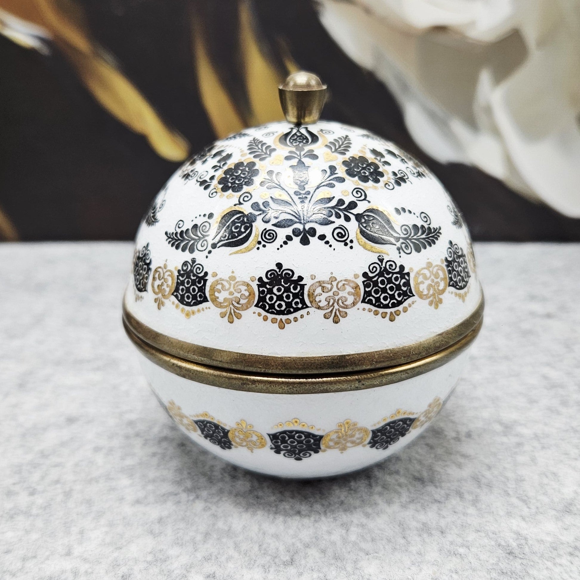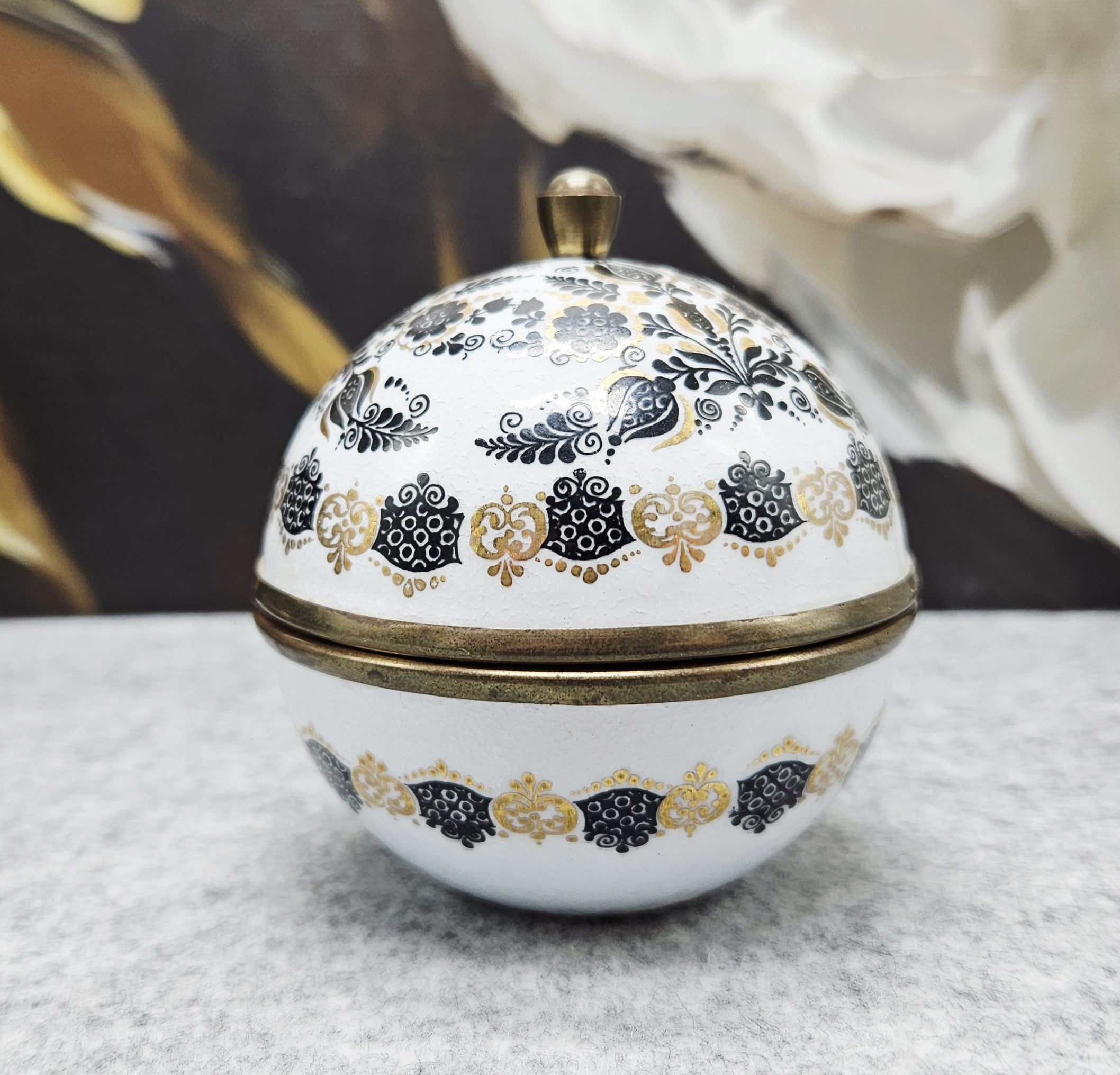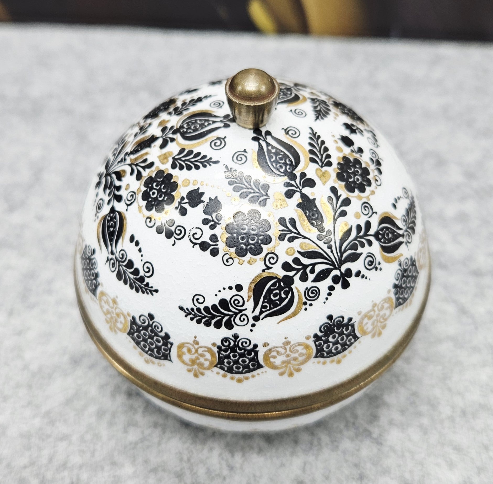 Der Deckel ist mit einem kleinen Metallgriff verziert und der Rand ist mit einem messingfarbenen Rand eingefasst, der dem klassischen Design einen luxuriösen und authentischen Touch verleiht. Jedes Muster ist handgefertigt, so dass jedes Stück einzigartig und leicht unterschiedlich ist.
