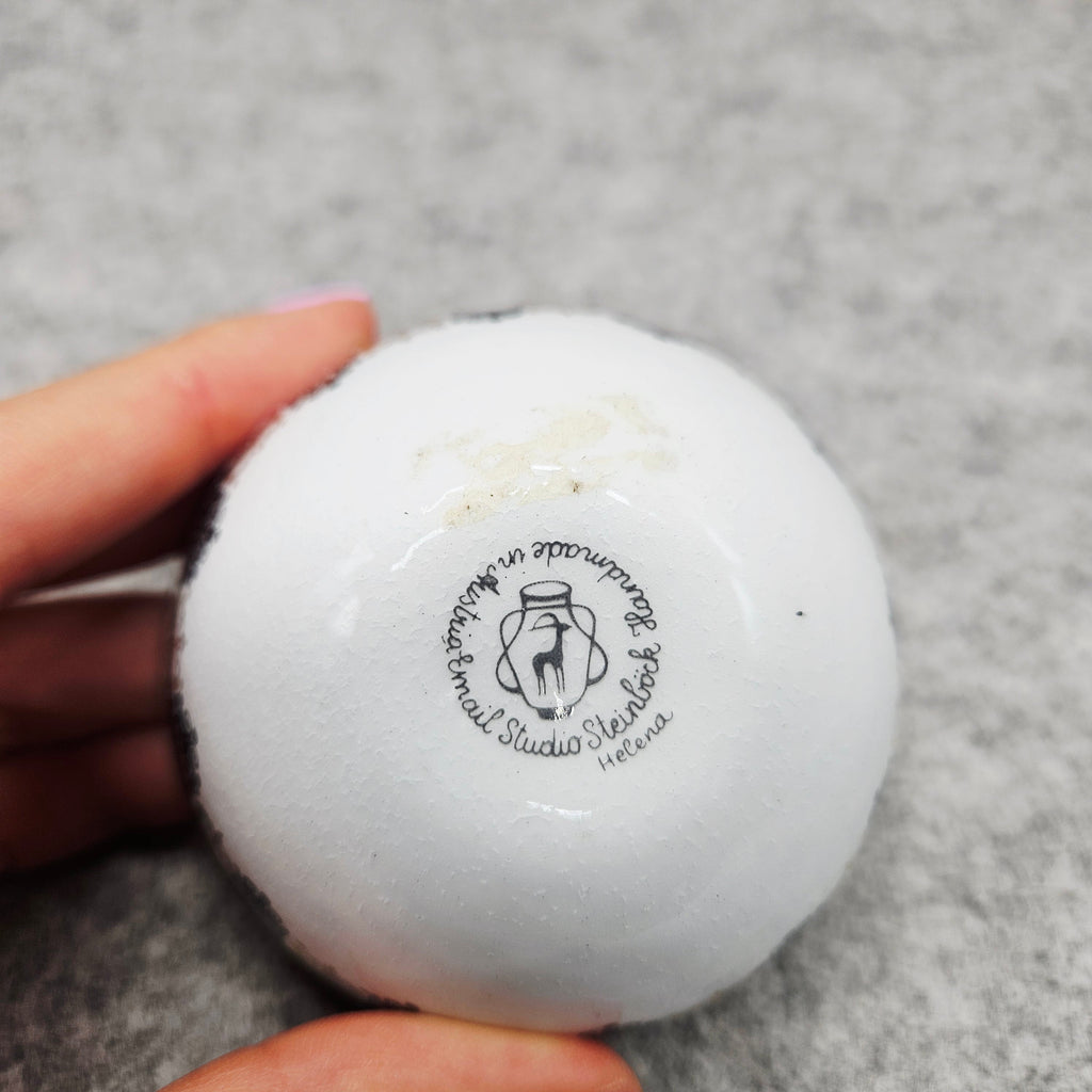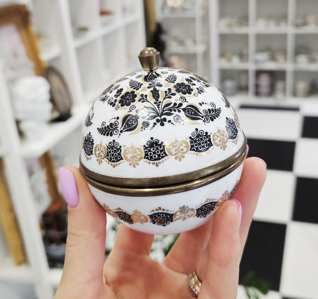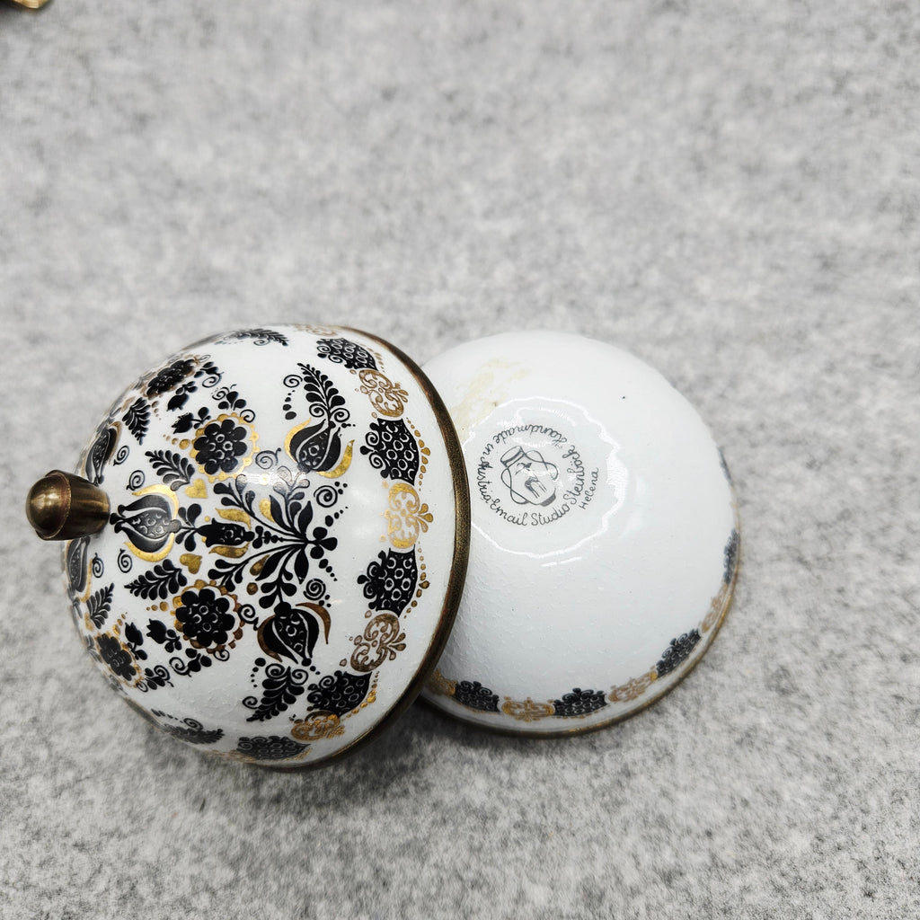 Die Original Studio Steinböck - Emaille-Dose Helena, handgefertigt in exklusivem Design. Die runde, gewölbte Dose ist mit zarten schwarz-goldenen Blumen- und Ornamentmustern verziert.