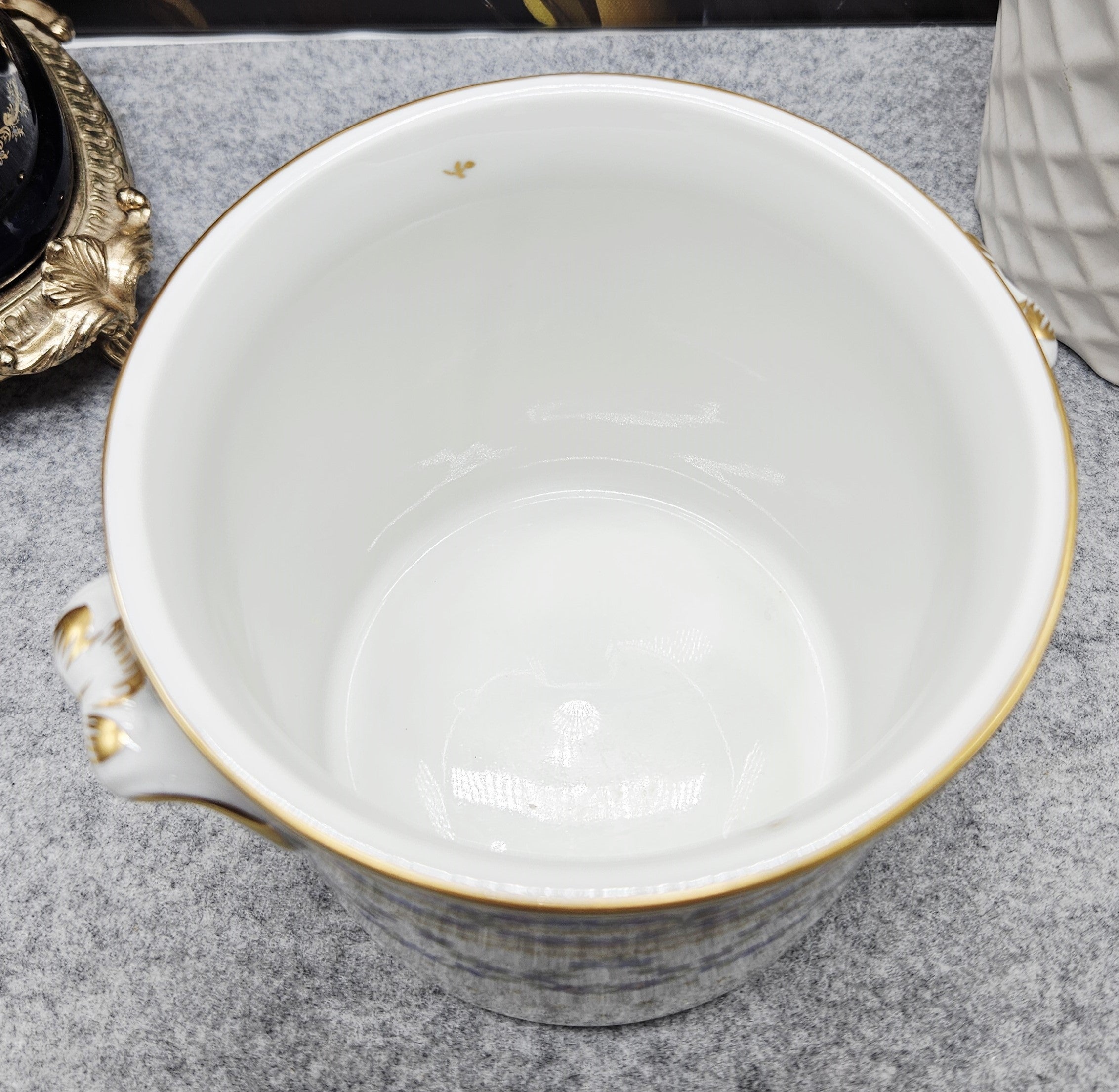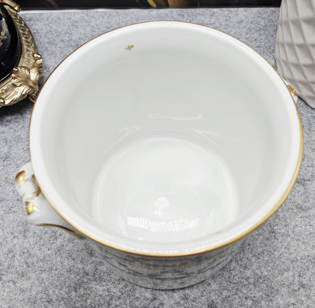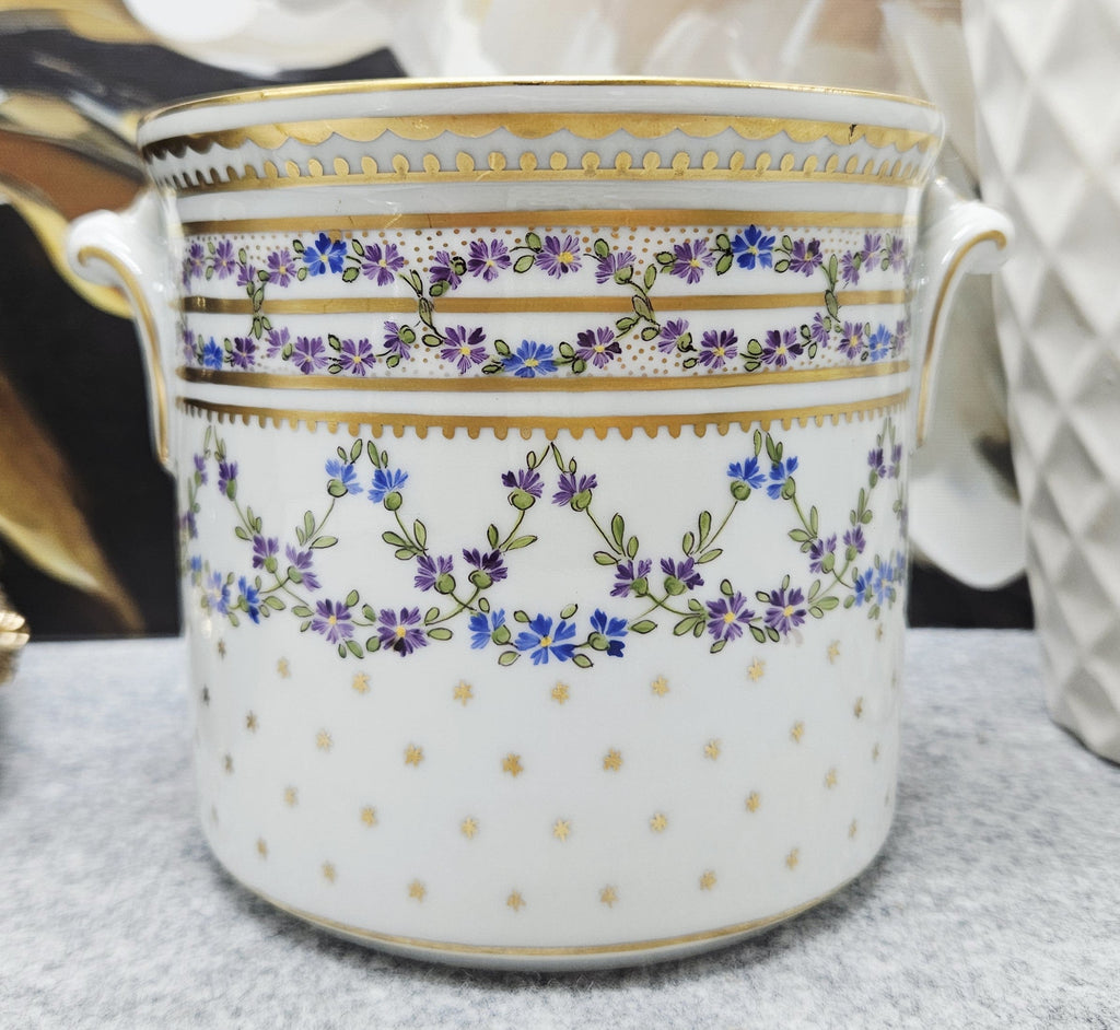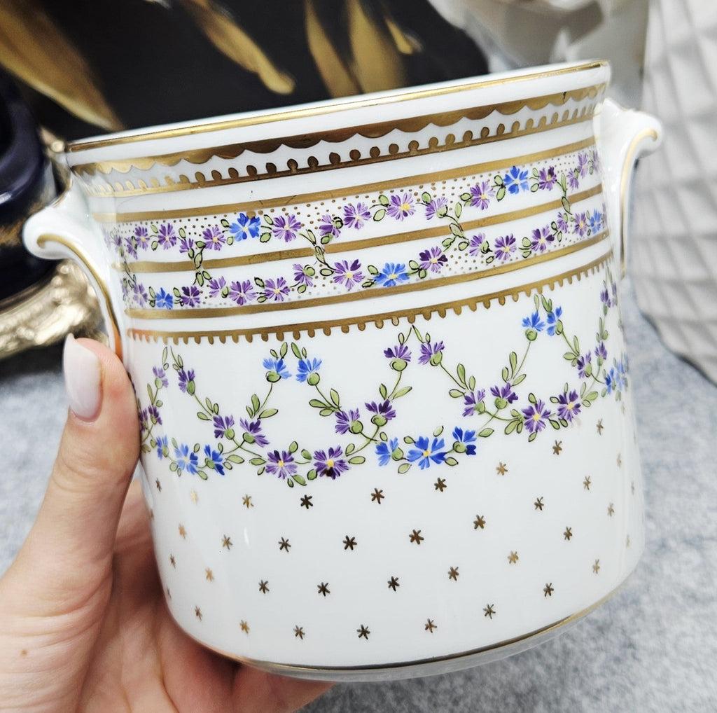 Ein raffinierter Blumentopf aus Dresdner Porzellan von Potschappel, verziert mit zarten, handgemalten Girlanden aus blauen und violetten Blumen, umgeben von feinen goldenen Sternmotiven. Der Deckel ist mit eleganten geometrischen Linien mit floralen Bändern und 24-karätigen Goldakzenten verziert, die ihm einen luxuriösen und exklusiven Touch verleihen.