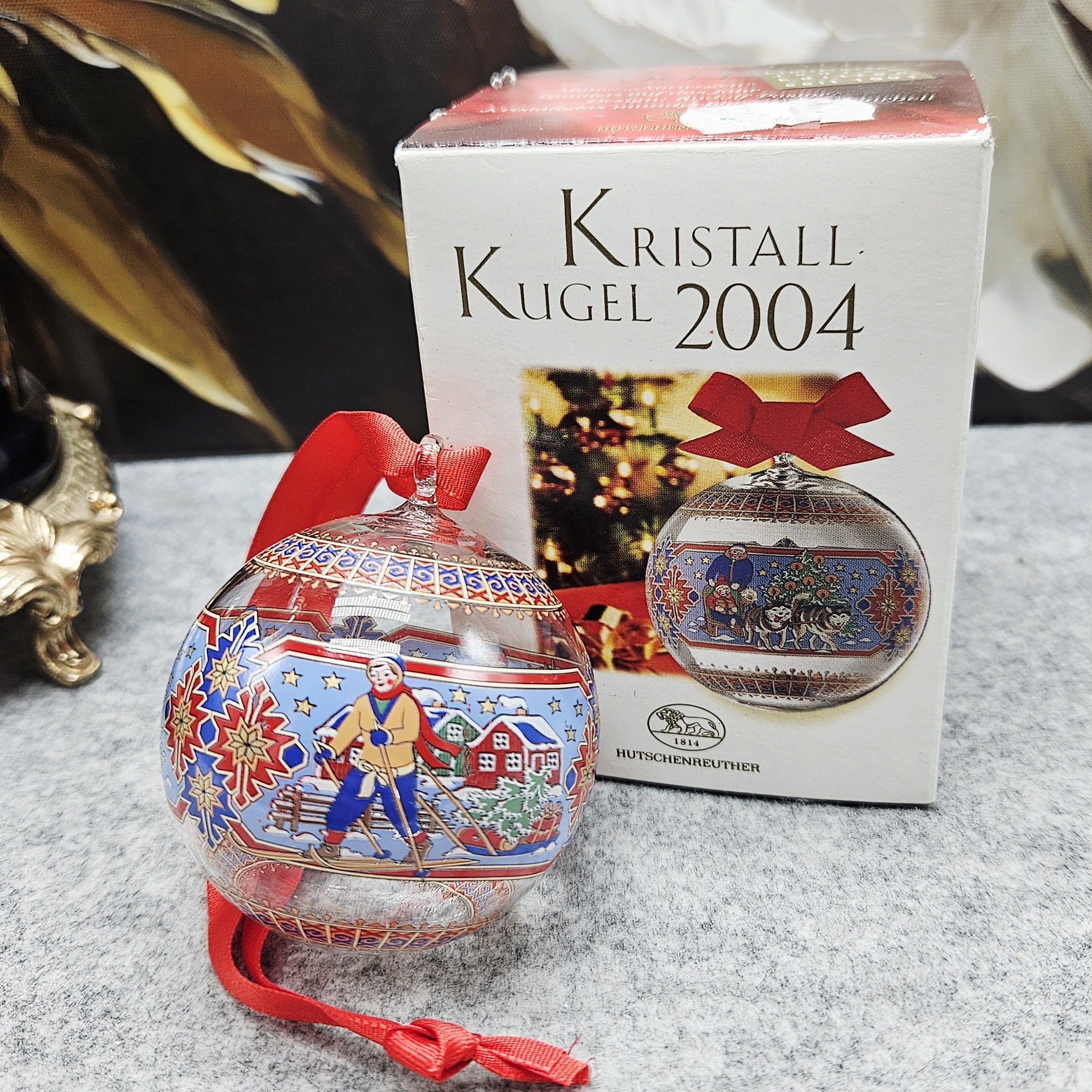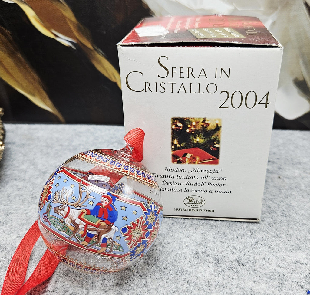 Sammlerstück Hutschenreuther Kristall Kugel 2004 Weihnachtsspielzeug aus Glas mit Originalverpackung. Die handgefertigte Kristallkugel ist mit dem farbenfrohen Rudolf-Pastor-Motiv "Norwegen" verziert - eine Winterlandschaft, Schneeschlitten, Rentiere und leuchtende traditionelle Sternenmotive sorgen für eine echte Märchen- und Altweihnachtsstimmung. Das intensiv rote Band zum Aufhängen und das hochwertige Glas machen dieses Spielzeug zu einem eleganten Akzent am Weihnachtsbaum. Dieses limitierte Sammlerstück ist Teil der Hutschenreuther-Serie - ein perfektes Geschenk für Sammler, Weihnachtsliebhaber und alle, die klassisches deutsches Design und Tradition schätzen.