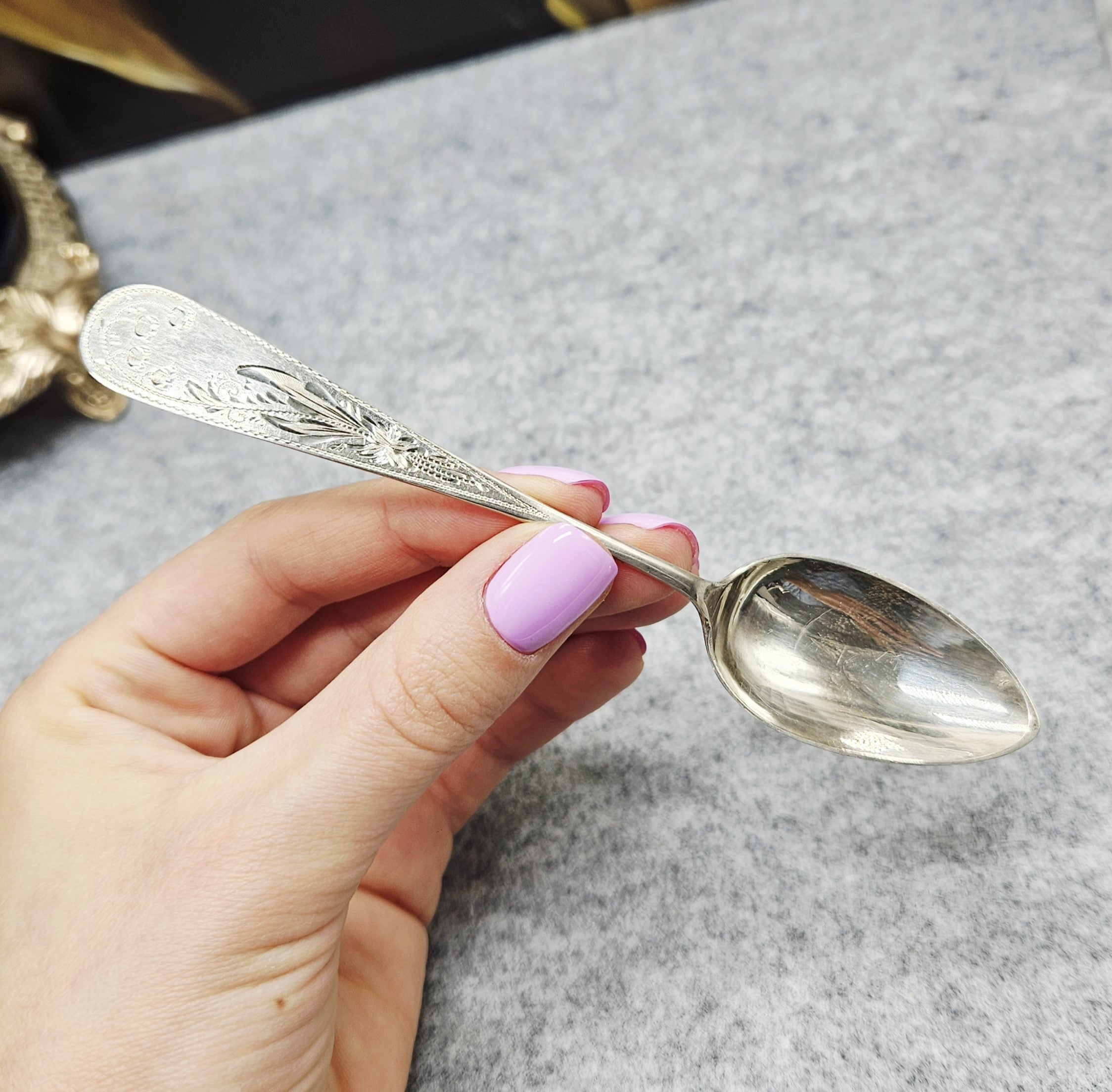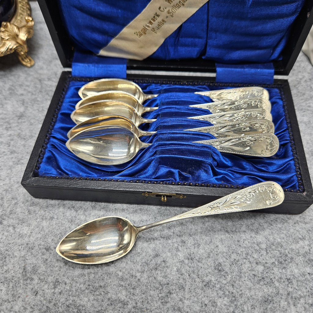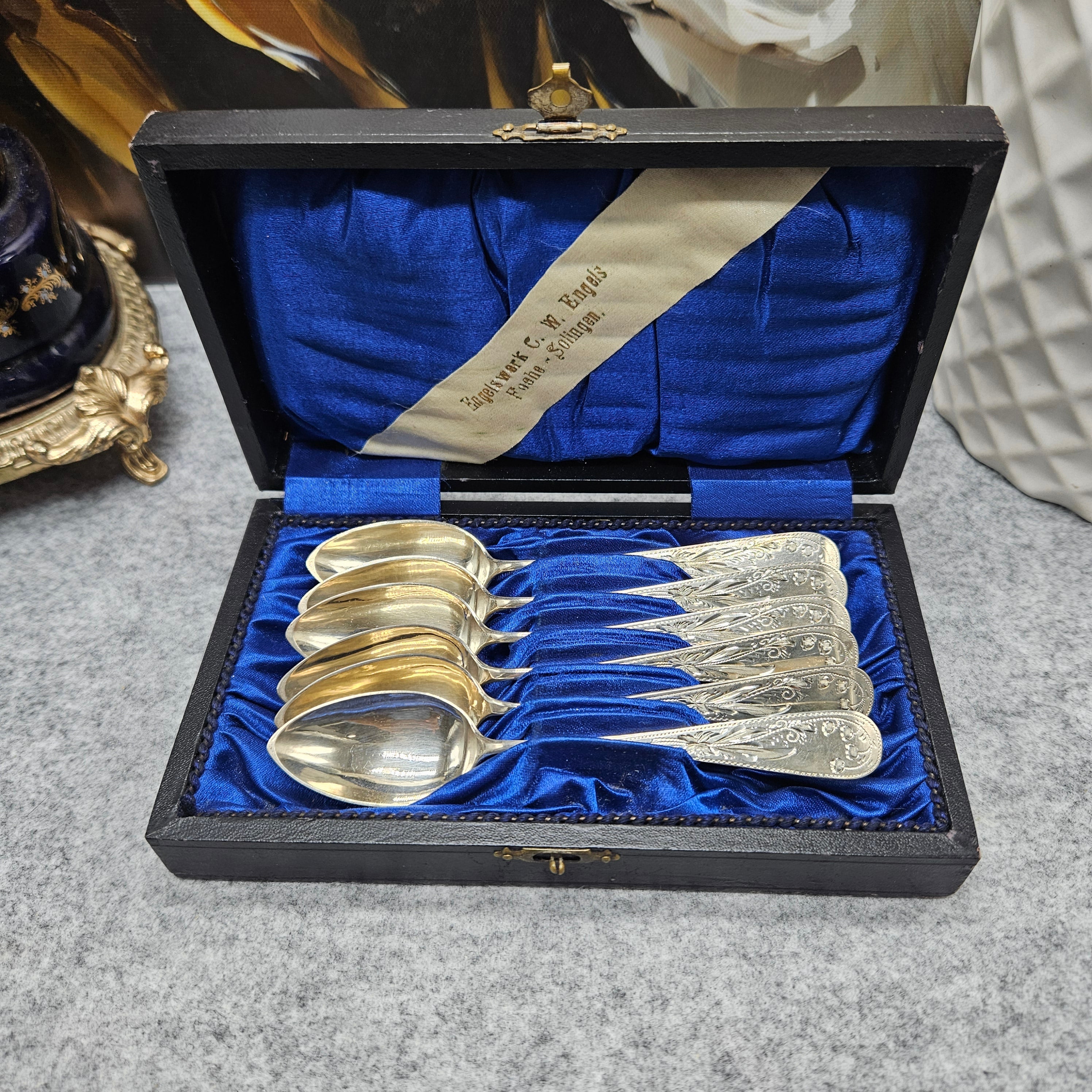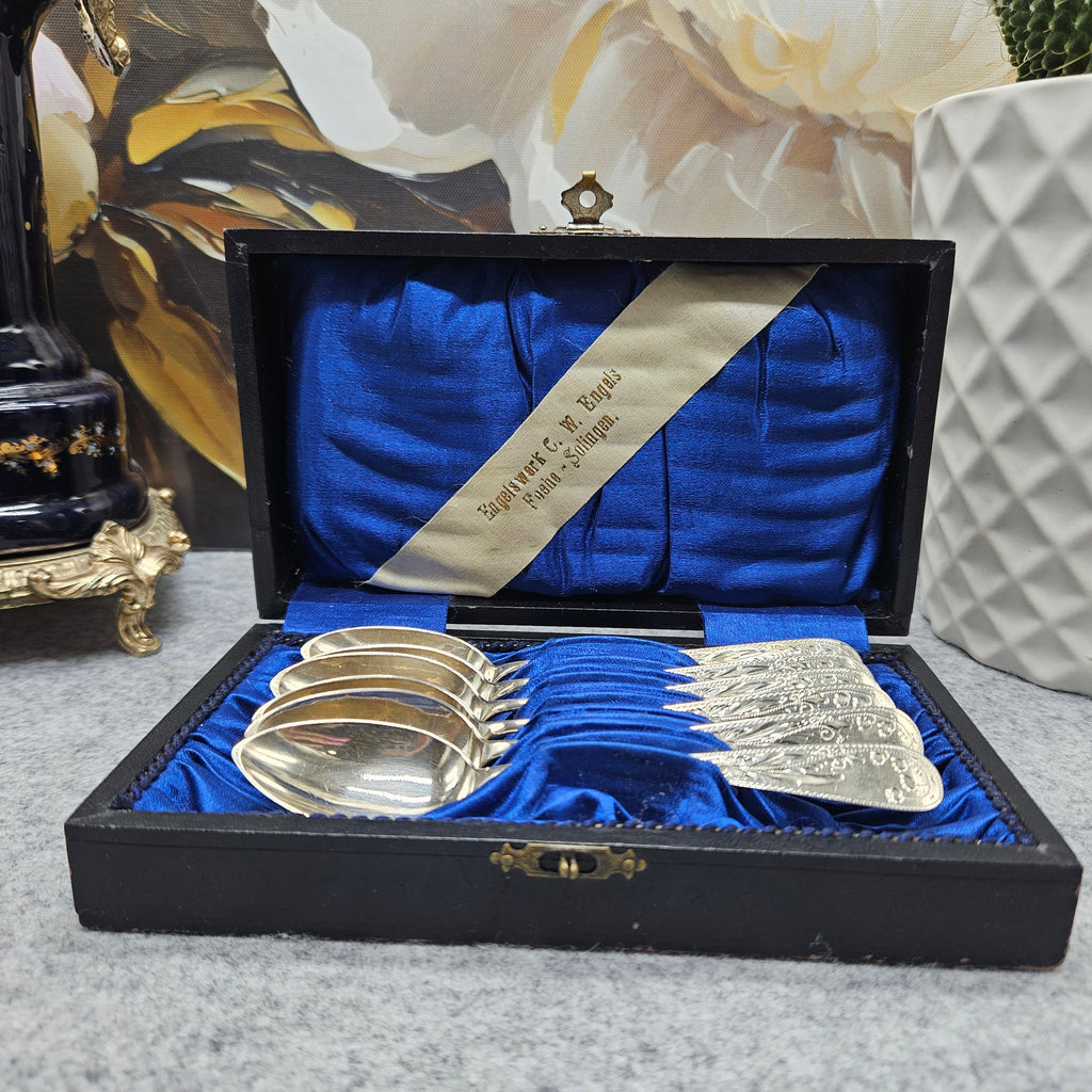 Exklusiver, antiker Satz von 6 Silberlöffeln in originaler Luxusbox.