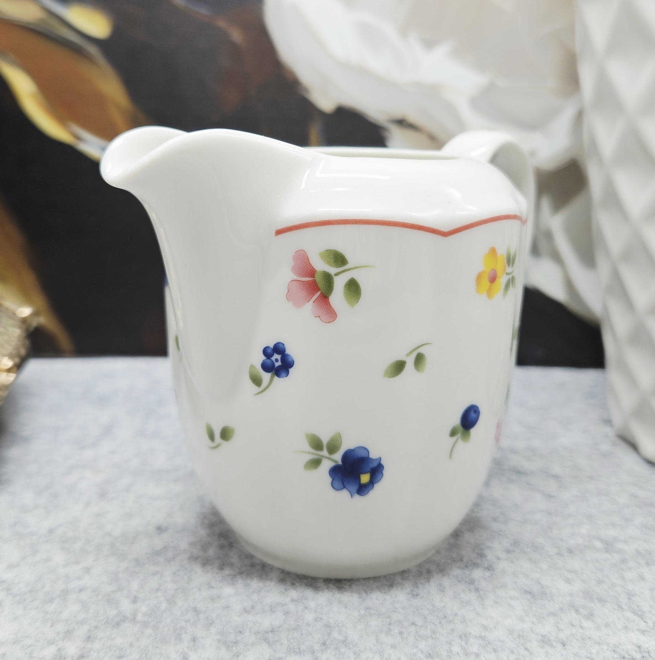 Krug aus deutschem Porzellan "TCM Qualitätsporzellan Germany". Die Kanne ist mit bunten Blumenmotiven und einem zartrosa Rand verziert.