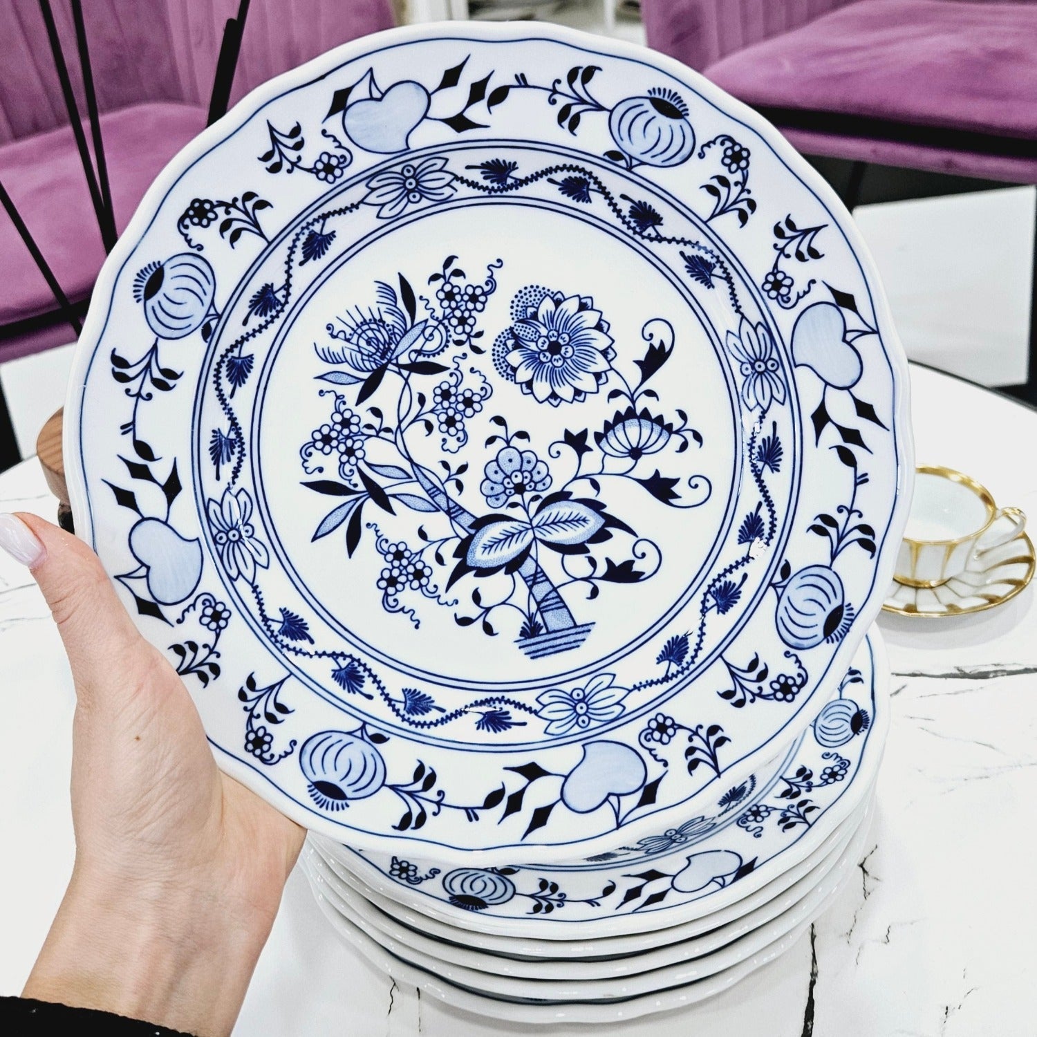 Das historische Zwiebelmuster wurde Mitte des 18. Jahrhunderts in der Manufaktur Meissen in Deutschland geschaffen und ist zu einem der berühmtesten Ornamente des europäischen Porzellans geworden. Inspiriert wurde es von orientalischen chinesischen Porzellanmotiven wie Granatäpfeln, Pfirsichen, Bambus und Chrysanthemen, die die Europäer an Zwiebeln erinnerten - daher der Name.