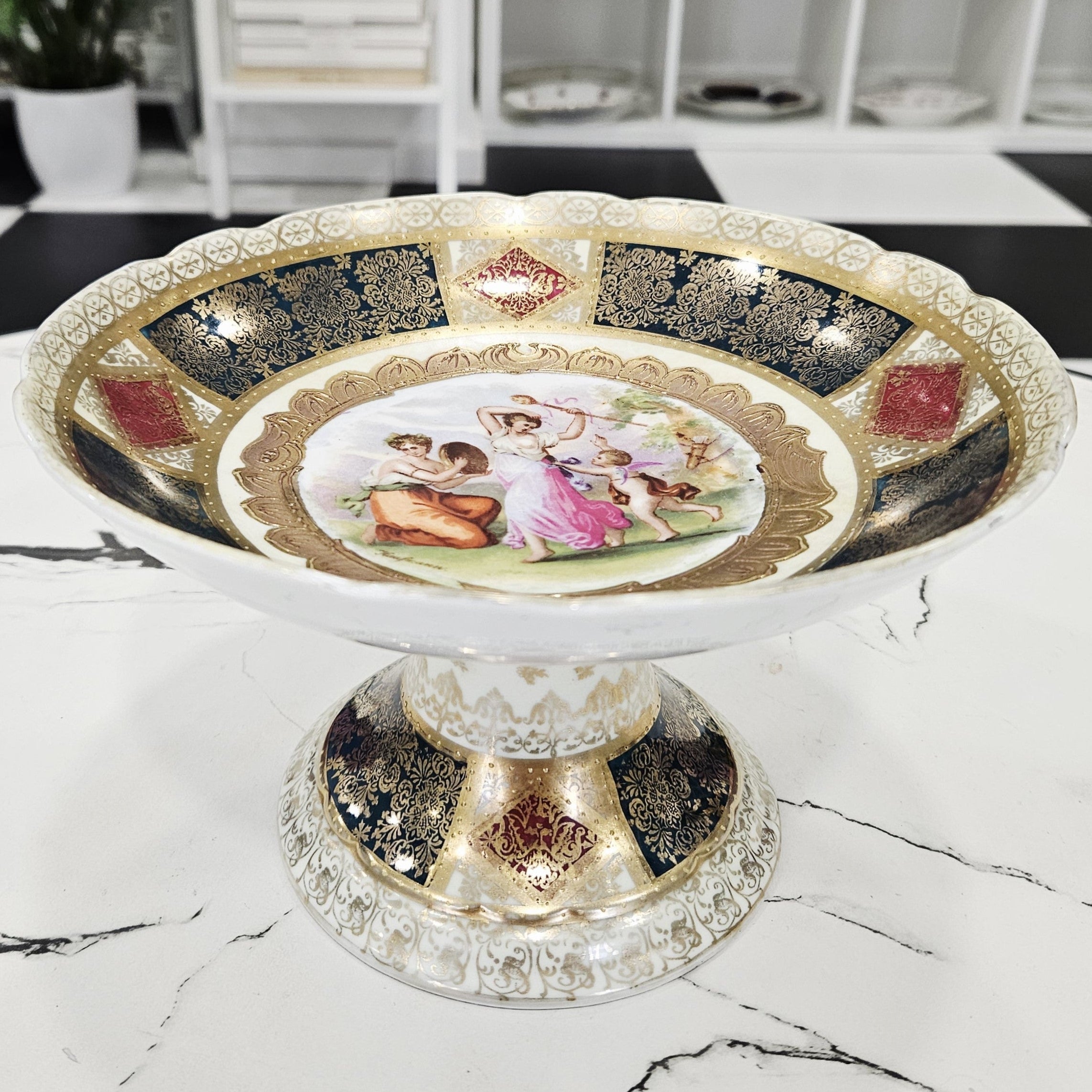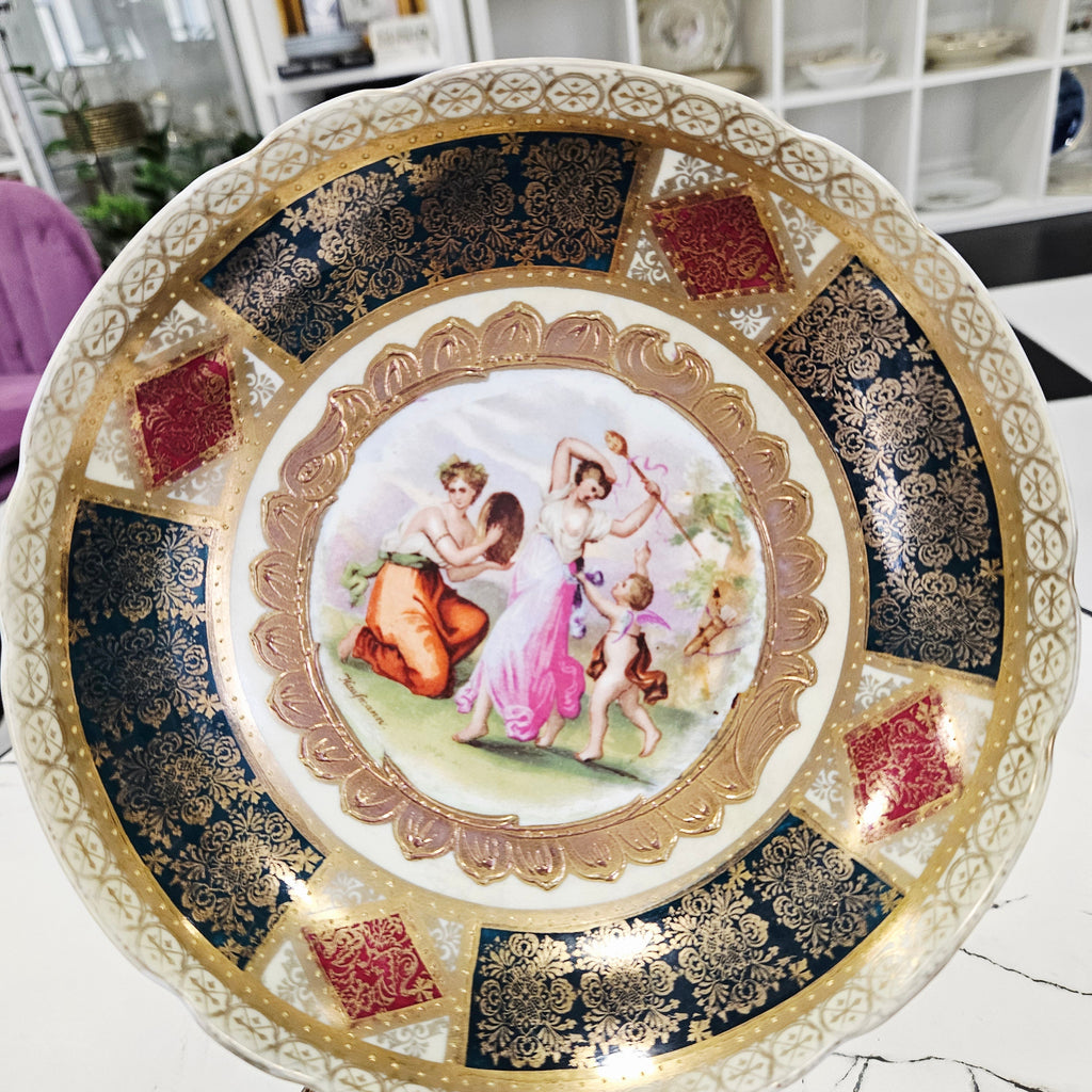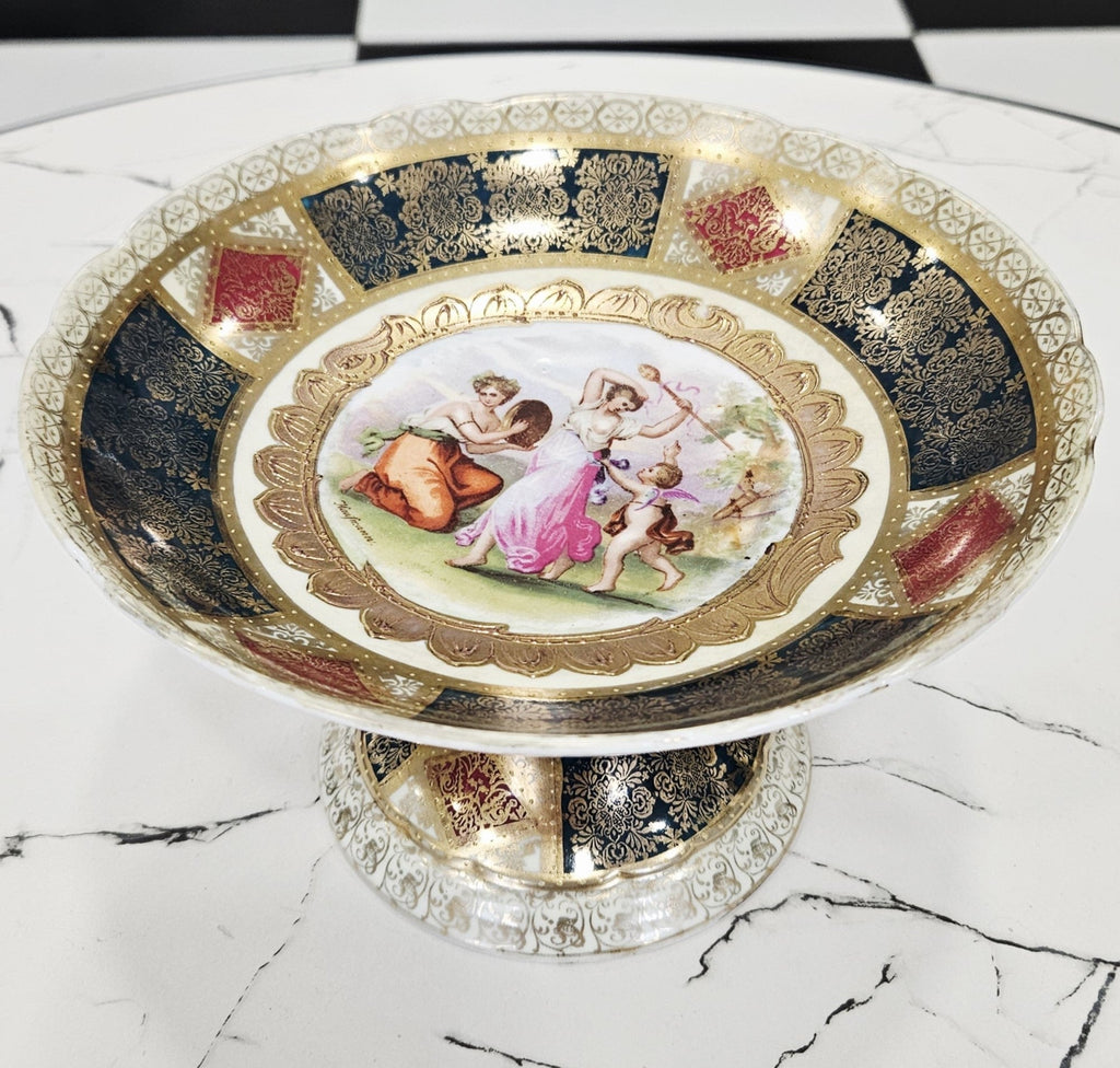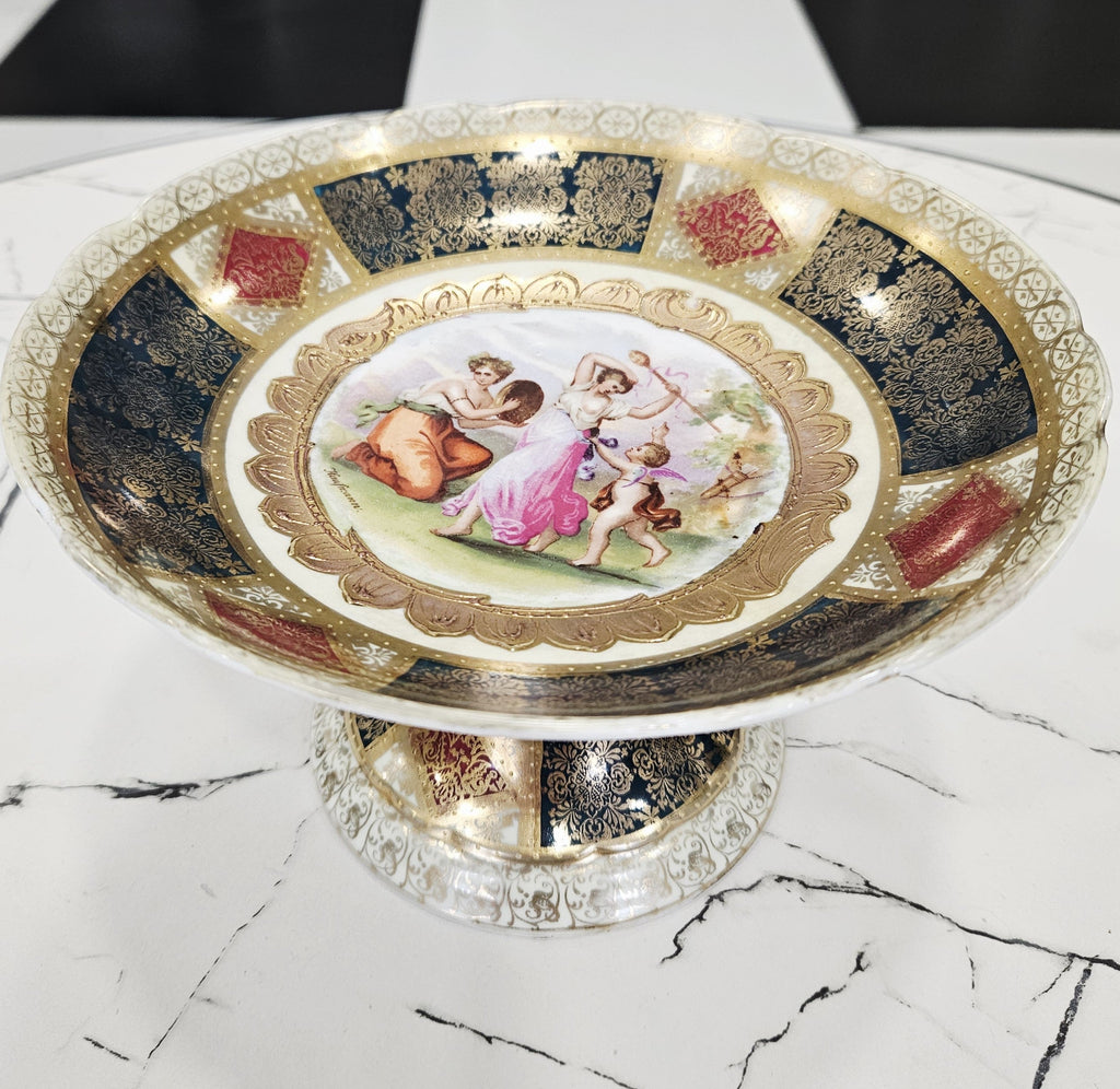 Außergewöhnliche antike Bonbon-/Obstschale auf einem Fuß, hergestellt in der Königlichen Wiener Manufaktur. In der Mitte befindet sich ein Kauffmann-Stück, das mythologische Figuren mit Amor darstellt. Die Komposition wird von Feldern in sattem Grün und Rot umrahmt, die mit zarten goldgeprägten Ornamenten verziert sind.