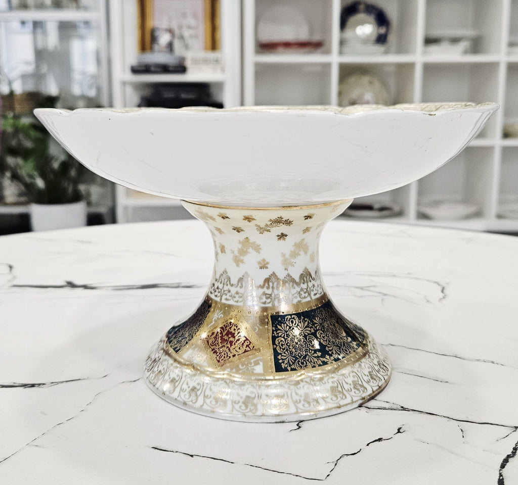 Die breite Schale ruht auf einem anmutig geformten Fuß, der ebenfalls reich mit goldenen Details verziert ist.