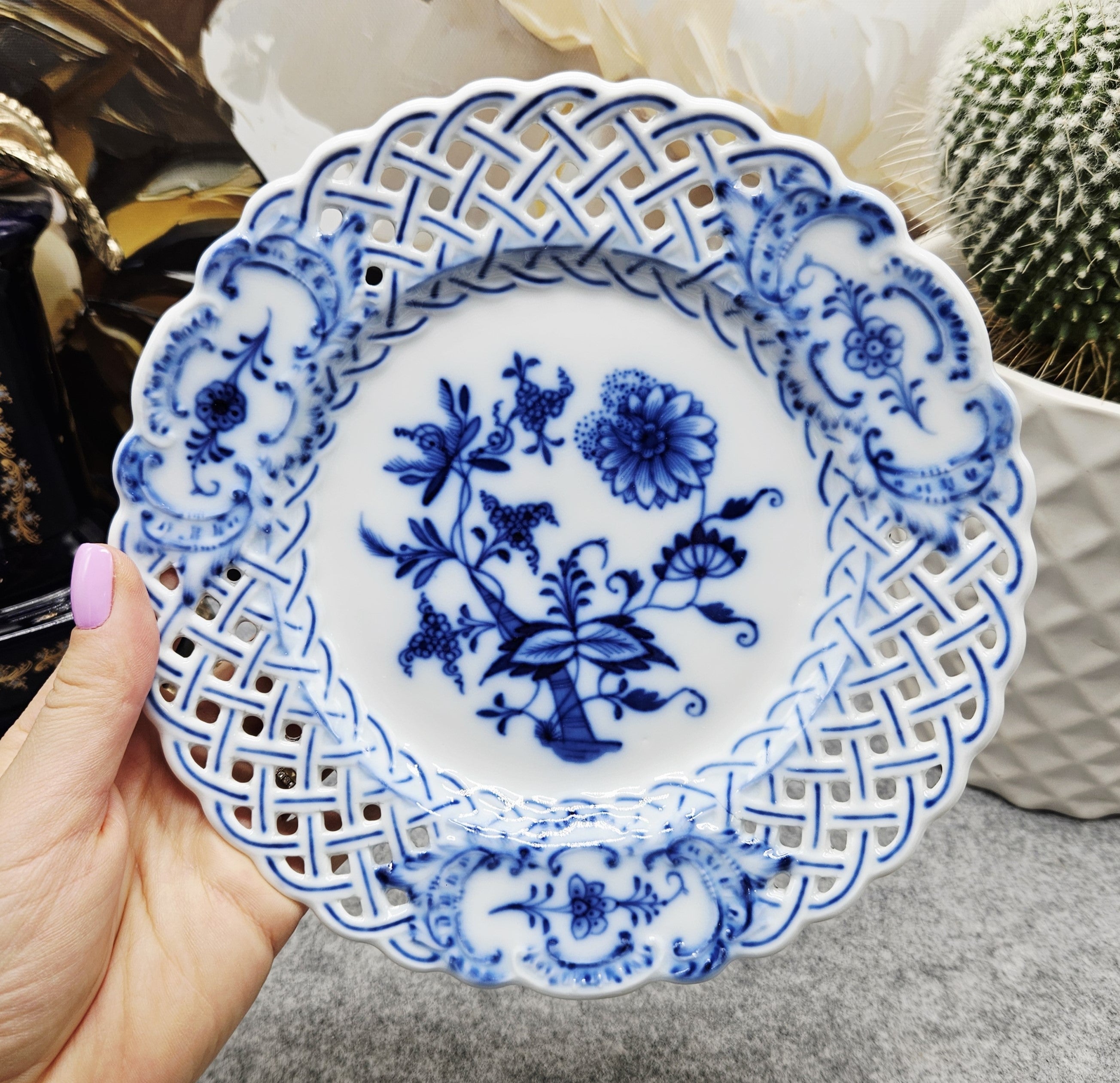 Antiker Porzellanteller von außergewöhnlicher Schönheit, geschaffen von Carl Teichert in der Manufaktur von . Dekoriert mit dem klassischen "Zwiebelmuster", einer der berühmtesten Kreationen Meißens, inspiriert von ostasiatischen Blumen- und Fruchtmotiven. Das Muster ist zart mit einer kobaltblauen Unterglasur bemalt, die nur für die besten Produkte von Carl Teichert Meissen charakteristisch ist.