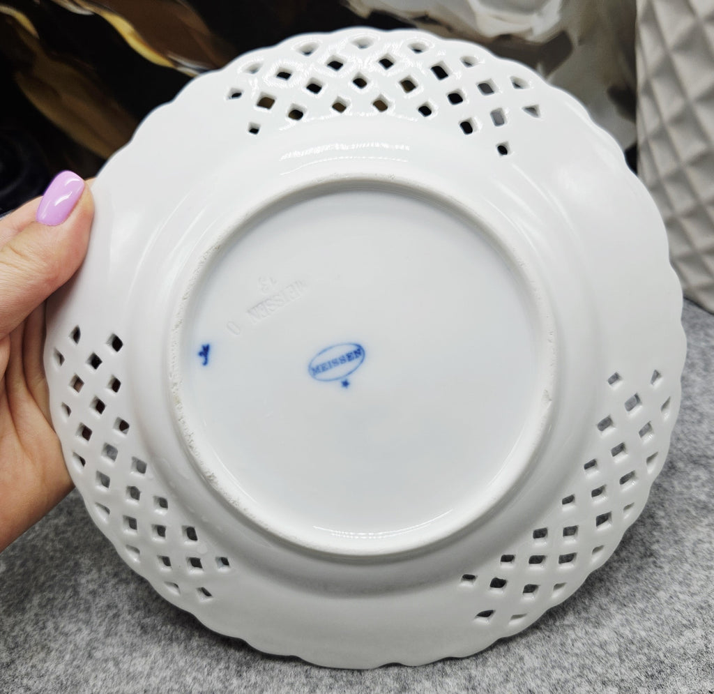 Der durchbrochene Rand mit einem Flechtornament verleiht dem Teller einen leichten und aristokratischen Charme, während die akribische Musterung von der tadellosen Handwerkskunst der Manufaktur zeugt.