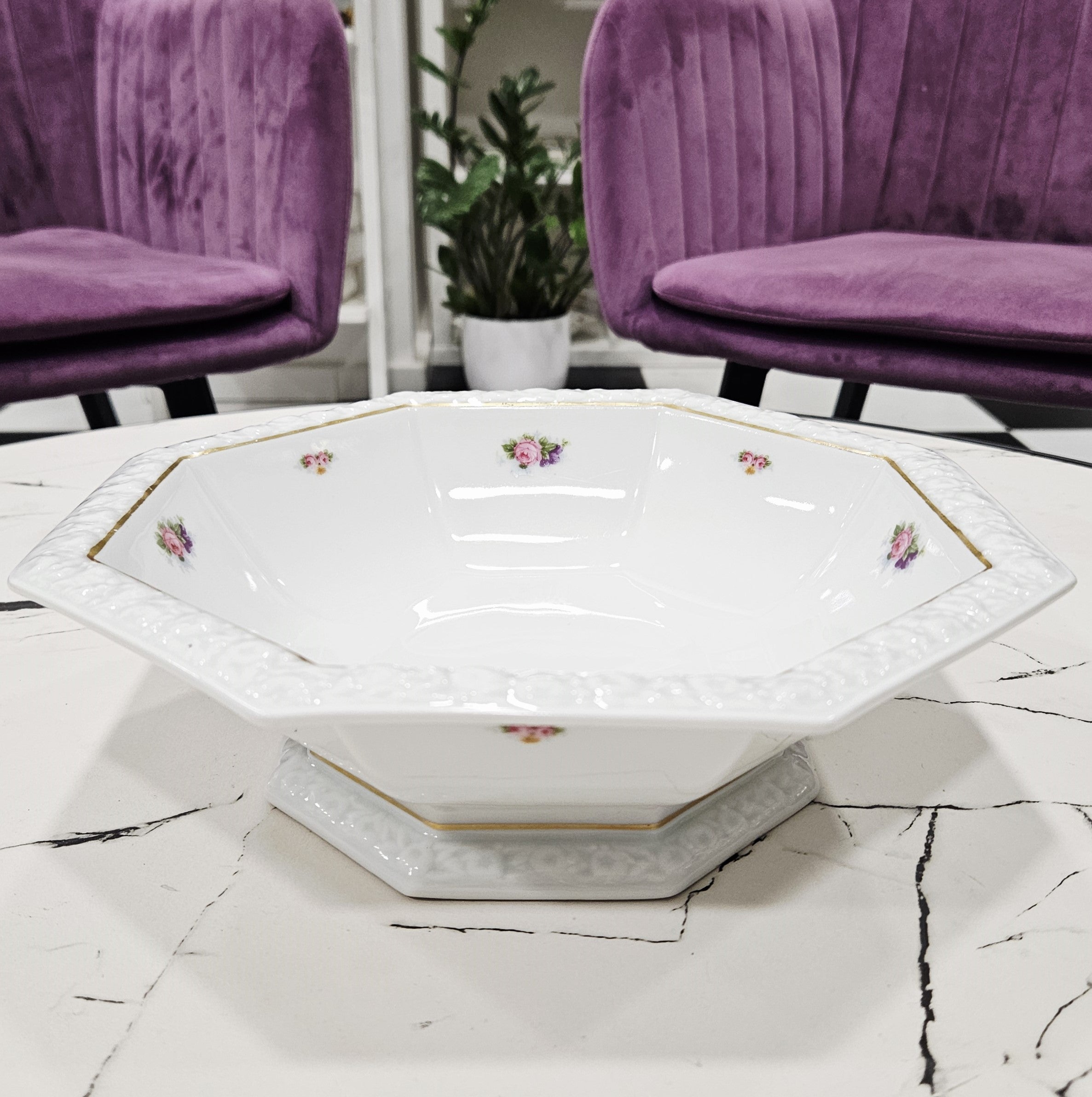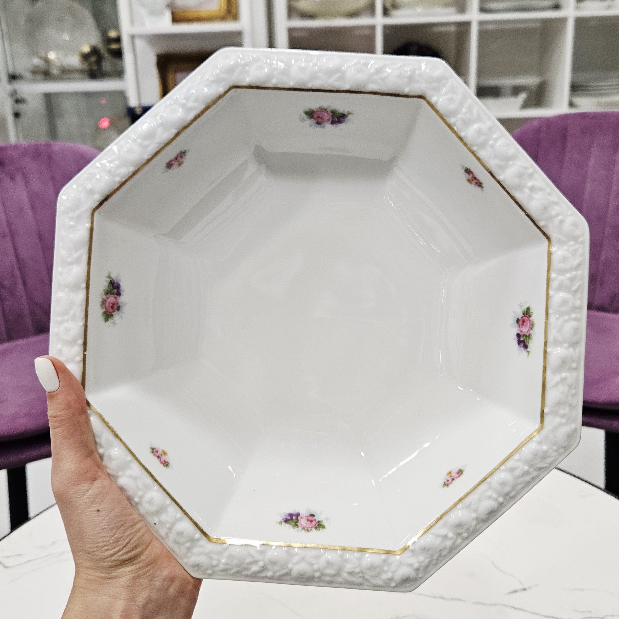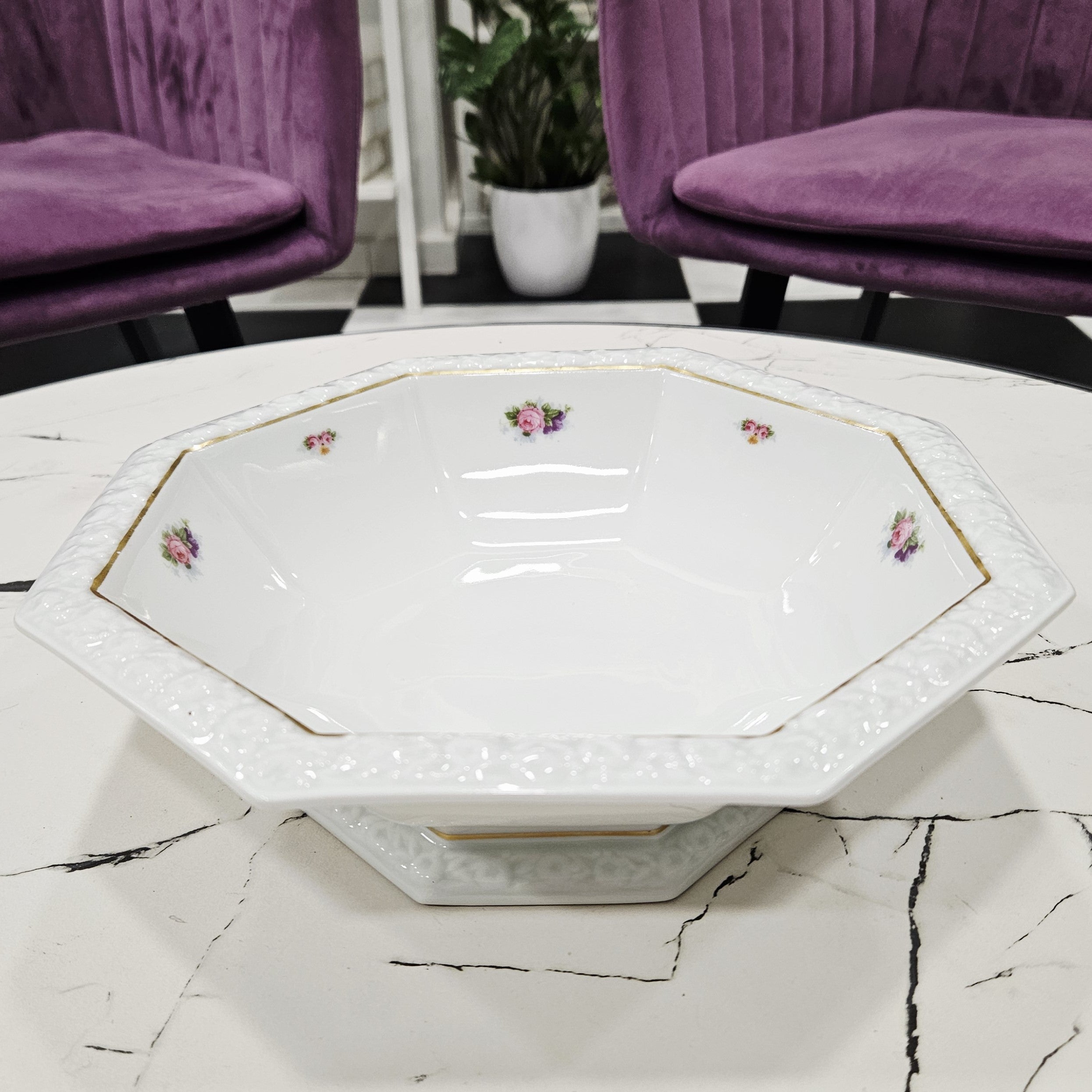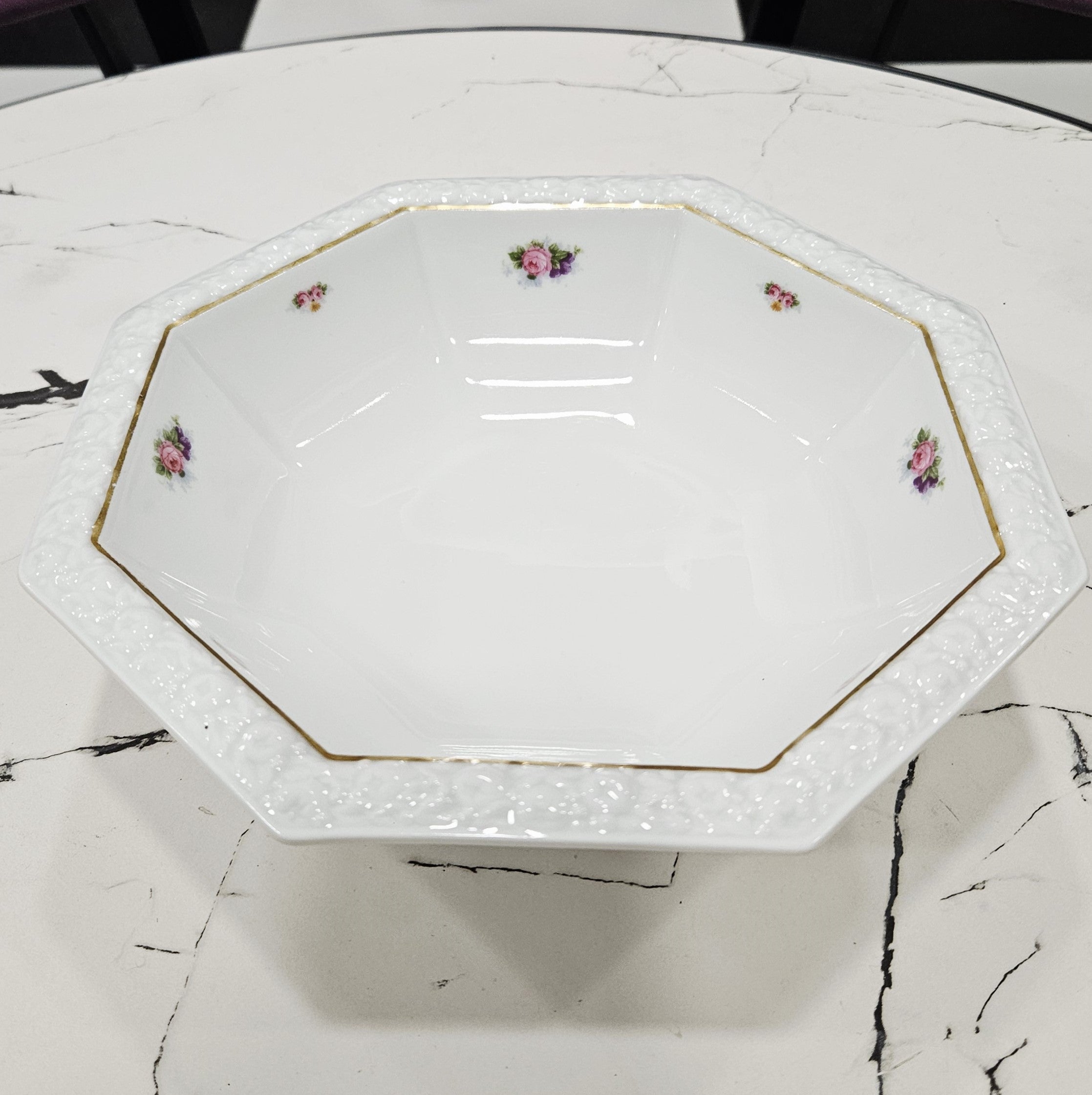 Exklusive Schale aus Porzellan für Salate oder andere Gerichte aus der Kollektion Rosenthal, Maria,verziert mit geprägten Rändern, Goldlinien und Blumenkompositionen.