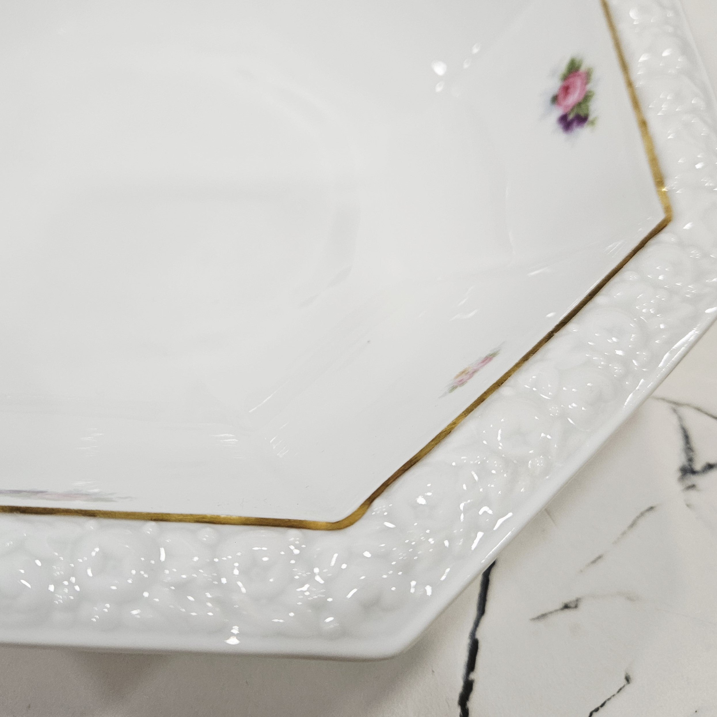 Die Ränder sind mit feinen Rosenblättern aus Porzellan verziert - die zarte, geprägte Spitzenornamentik, für die die Kollektion berühmt ist.