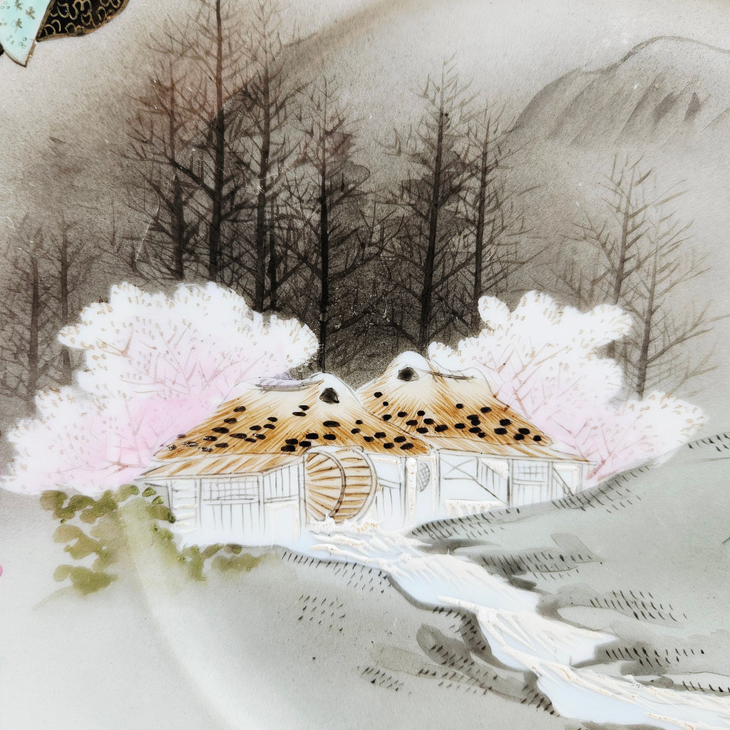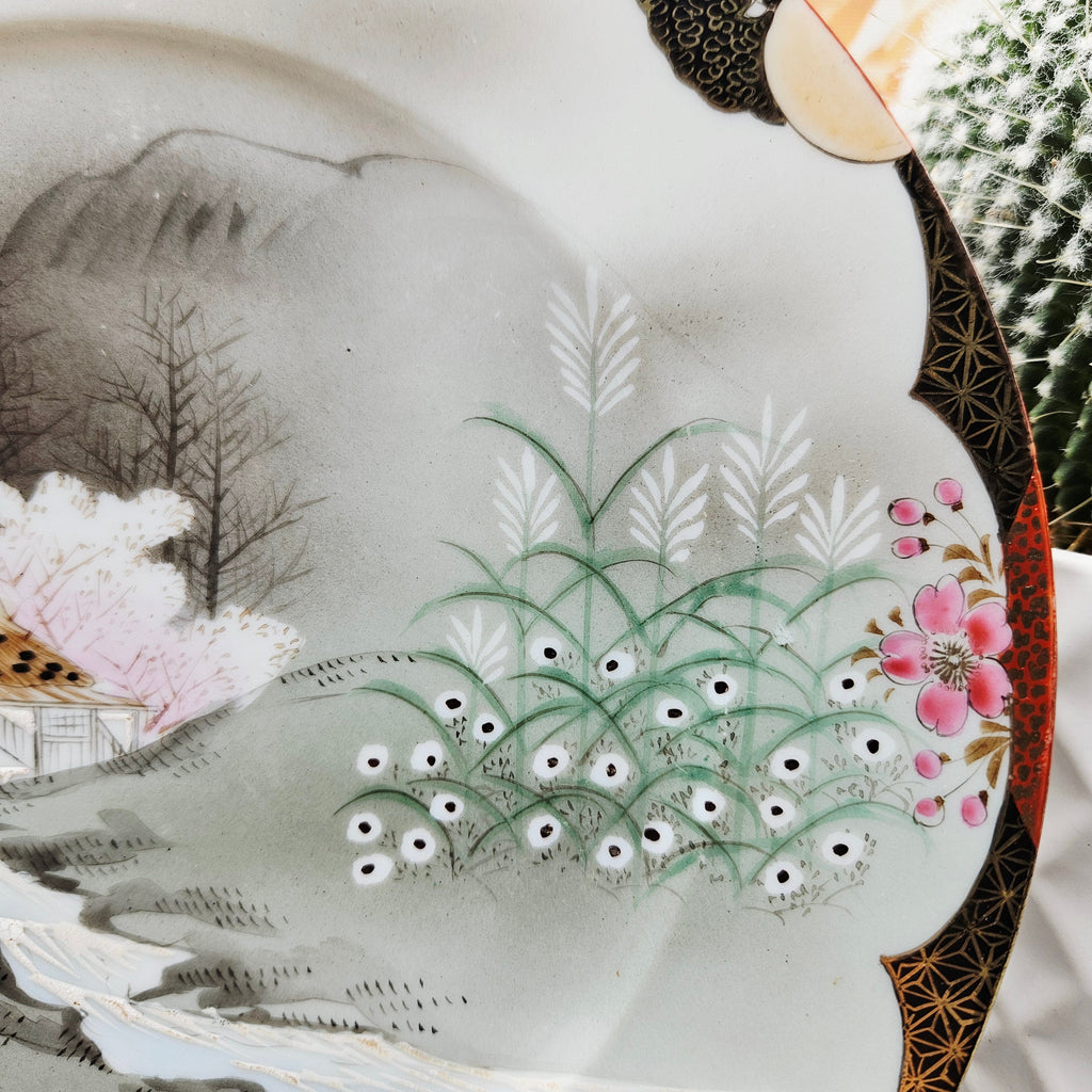 Ein exquisiter, handdekorierter japanischer Porzellanteller mit einer zarten Landschaft aus Bergen, traditionellen Häusern, einem fließenden Bach und Motiven von Sakura und Wildblumen. Die Komposition ist in sehr sanften Pastellfarben gehalten, die Rosa-, Grün- und Erdtöne kombinieren, und die Ränder sind mit geometrischen Ornamenten in Schwarz und Gold verziert.