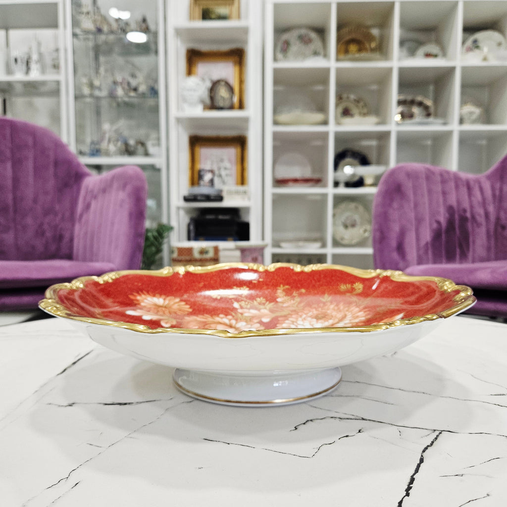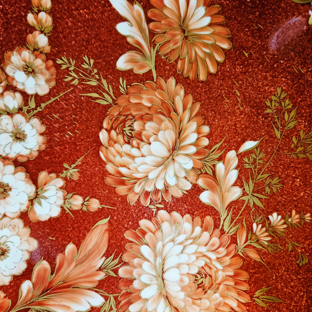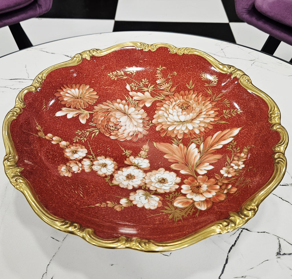 Die handgemalte Komposition mit Blüten in satten Tönen auf rotem Grund wird durch 24 Karat Golddetails und einen geprägten Goldrand zart ergänzt.