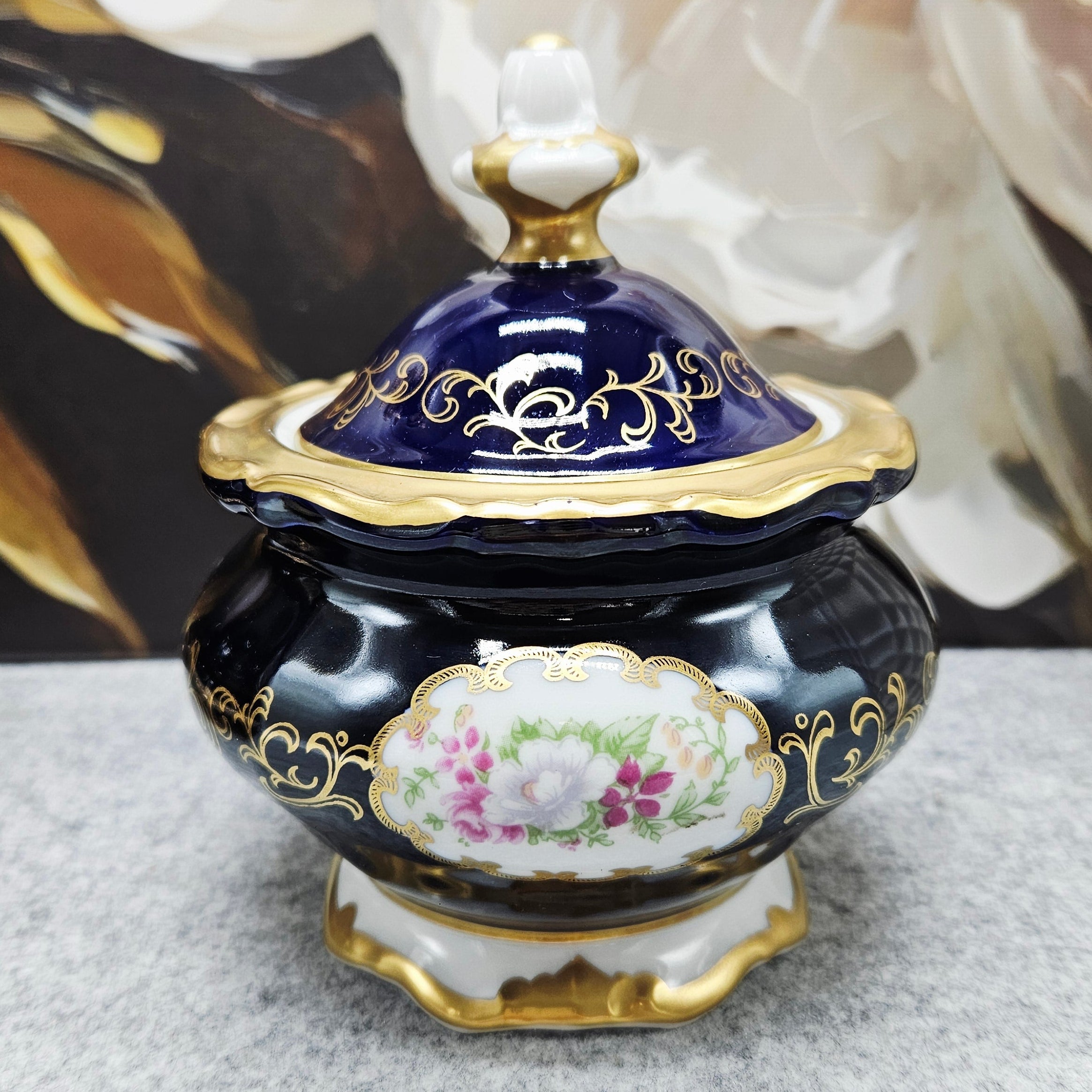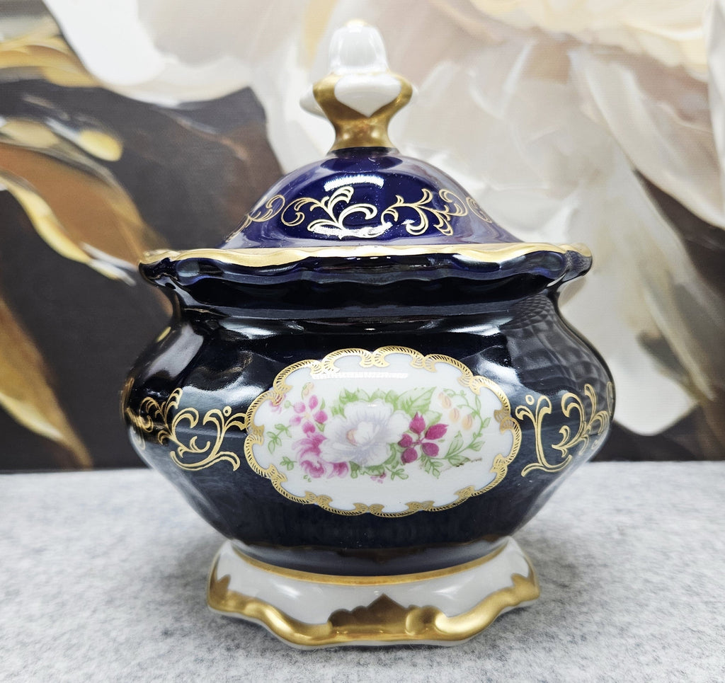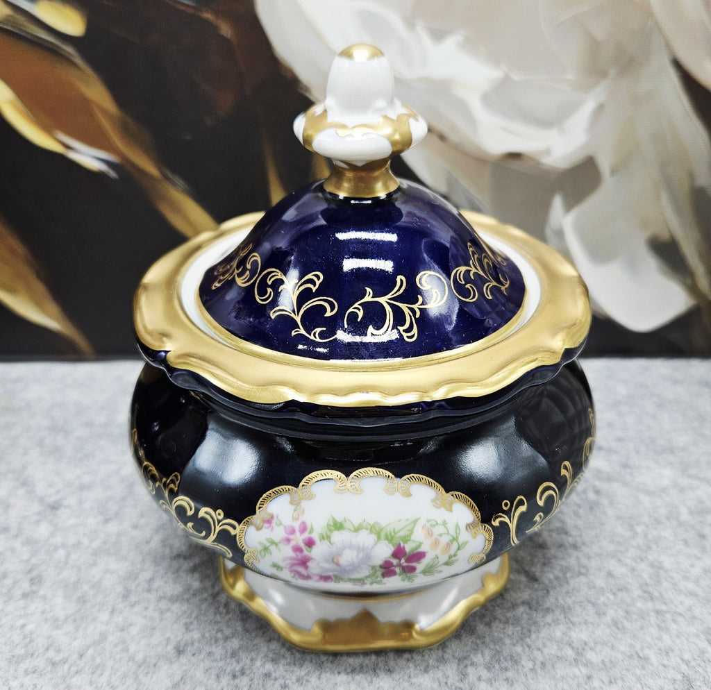 Eine kleine Porzellandose aus der Weimarer Republik von außergewöhnlicher Schönheit, ein Beispiel für klassische Eleganz und deutsche Handwerkskunst. Sie ist aus hochwertigem Porzellan gefertigt und mit einer tief kobaltblauen Glasur, von Hand aufgetragenen 24-karätigen Goldornamenten und einem romantischen Blumenmotiv im zentralen Medaillon verziert.