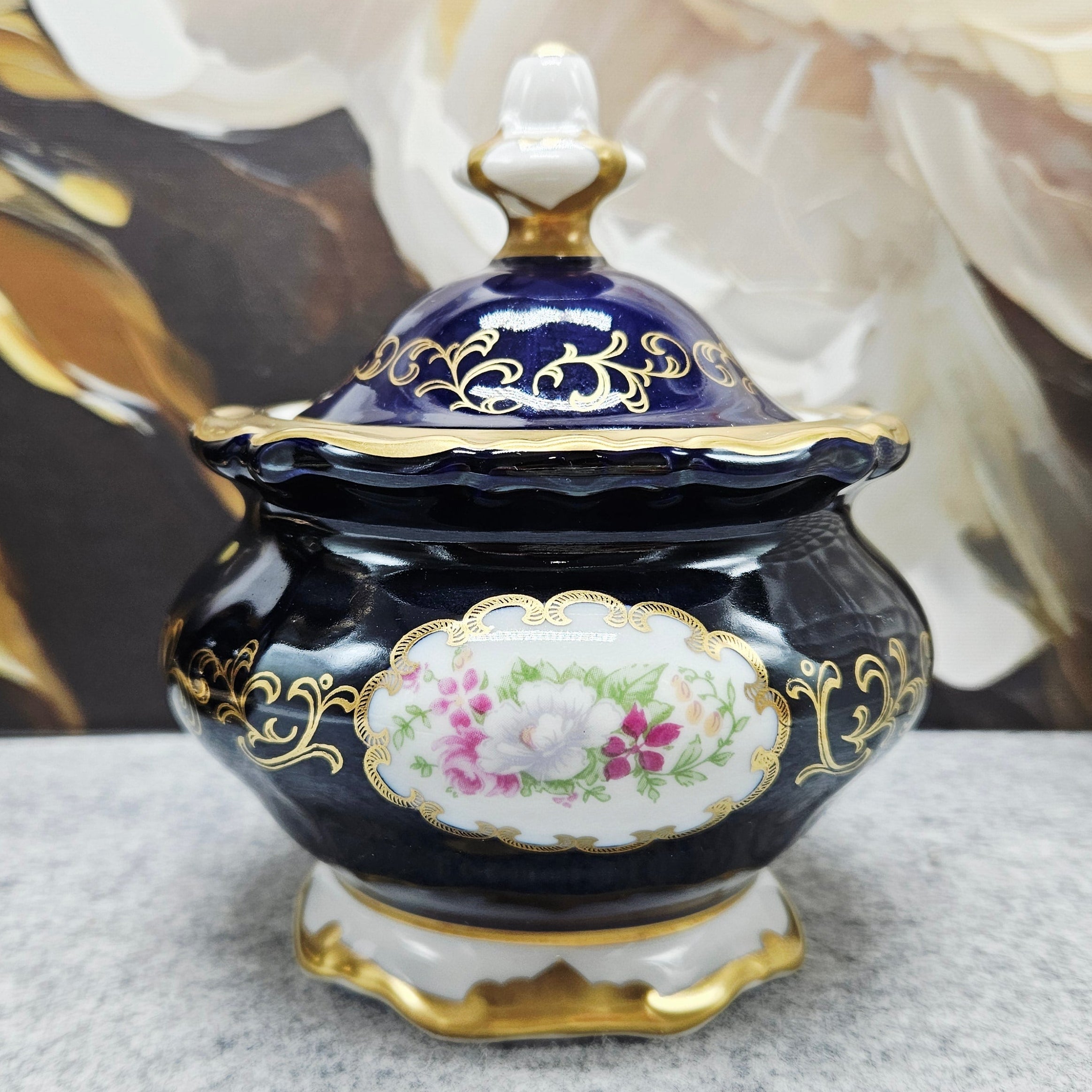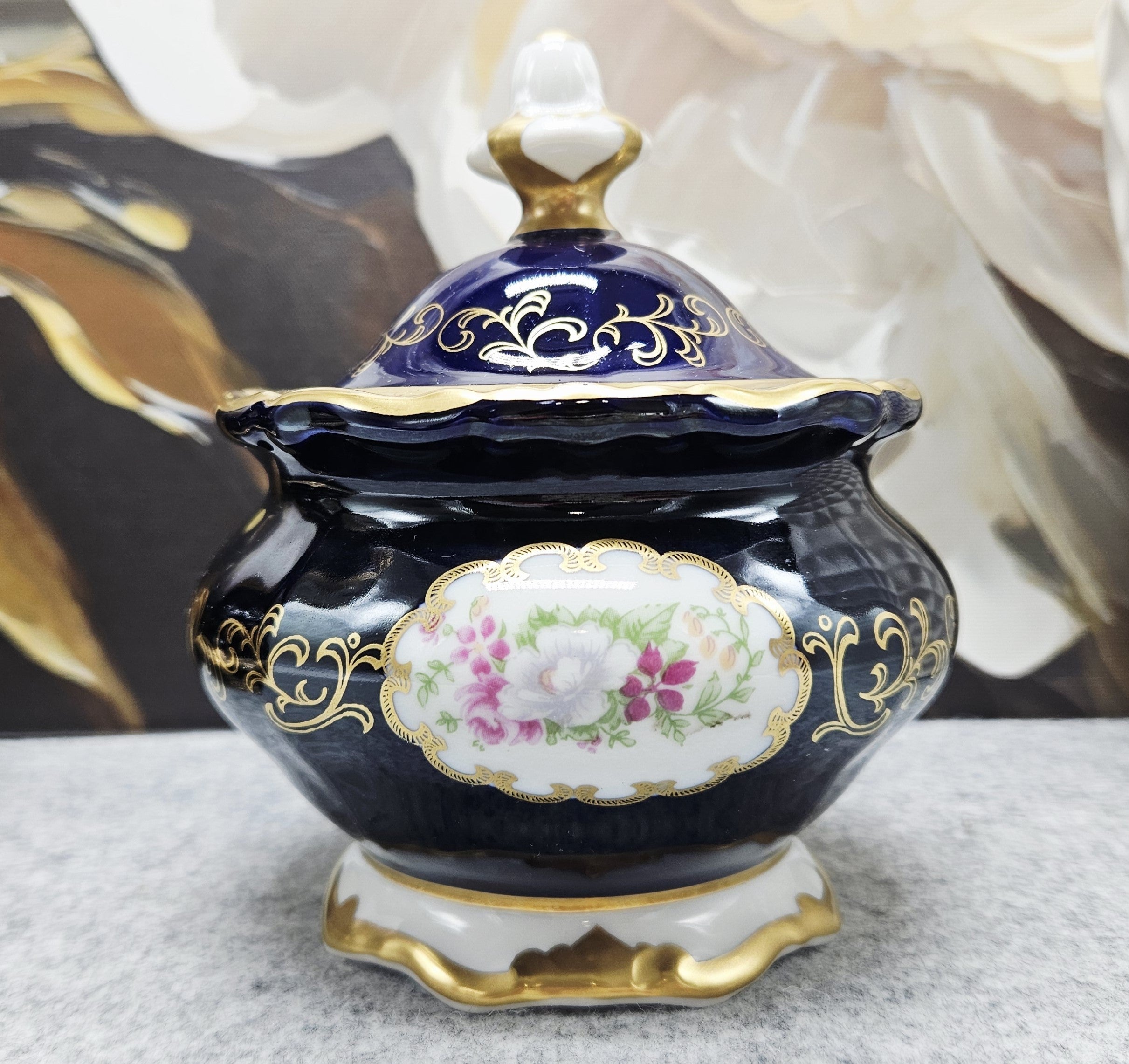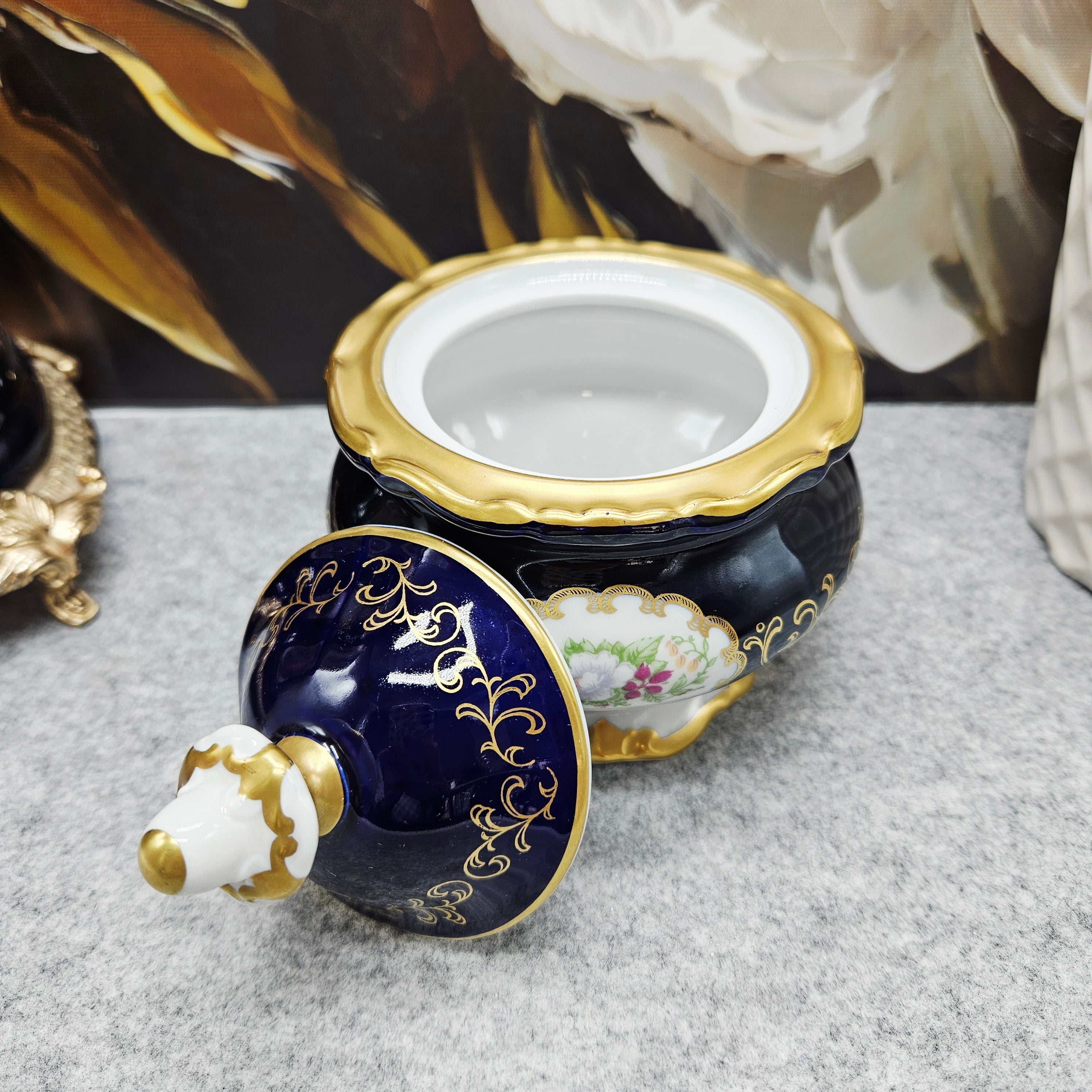 Eine kleine Porzellandose aus der Weimarer Republik von außergewöhnlicher Schönheit, ein Beispiel für klassische Eleganz und deutsche Handwerkskunst. Sie ist aus hochwertigem Porzellan gefertigt und mit einer tief kobaltblauen Glasur, von Hand aufgetragenen 24-karätigen Goldornamenten und einem romantischen Blumenmotiv im zentralen Medaillon verziert.