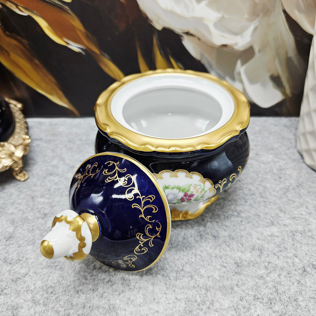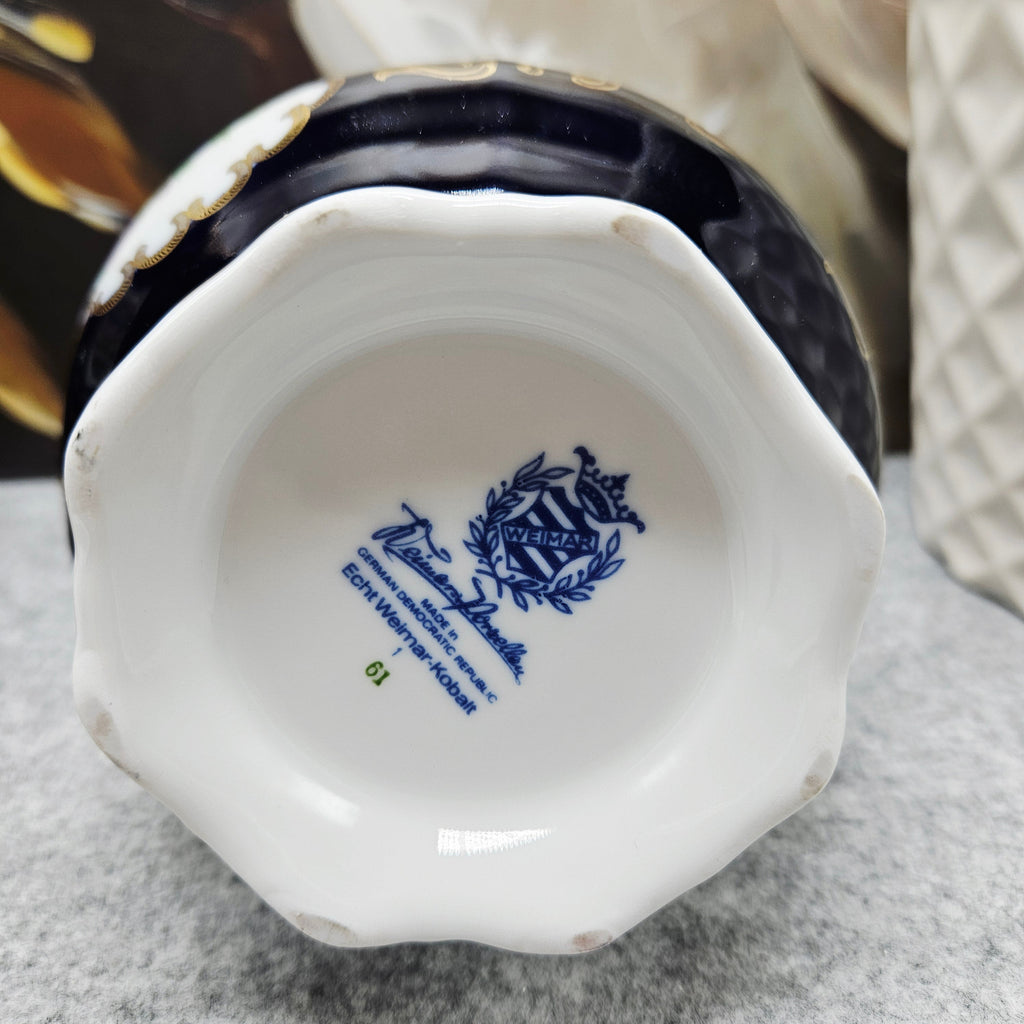Das Modell Echt Weimar Cobalt ist bekannt für seinen prächtigen Kontrast zwischen sattem Kobalt und glänzendem Gold. Diese Bonbondose verkörpert den traditionellen Stil der Weimarer Manufaktur und verbindet deutsche Präzision, barockes Dekor und zeitlose Ästhetik.