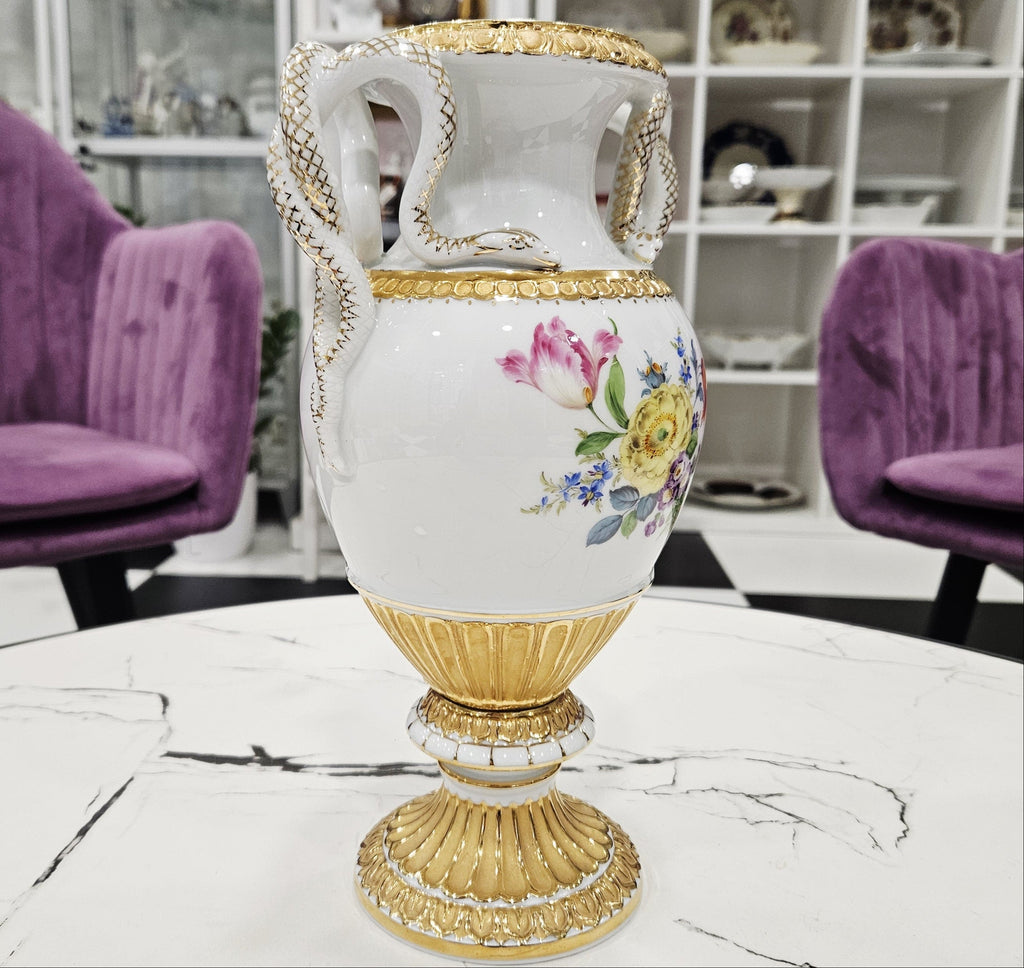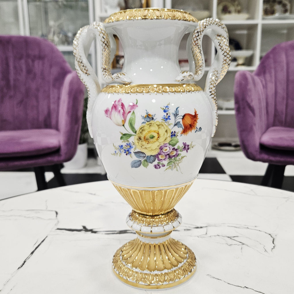 Eine atemberaubend schöne, sehr seltene, luxuriöse, reich vergoldete Blumenvase aus Meissener Porzellan mit exquisiten schlangenförmigen Henkeln (27,5 cm).