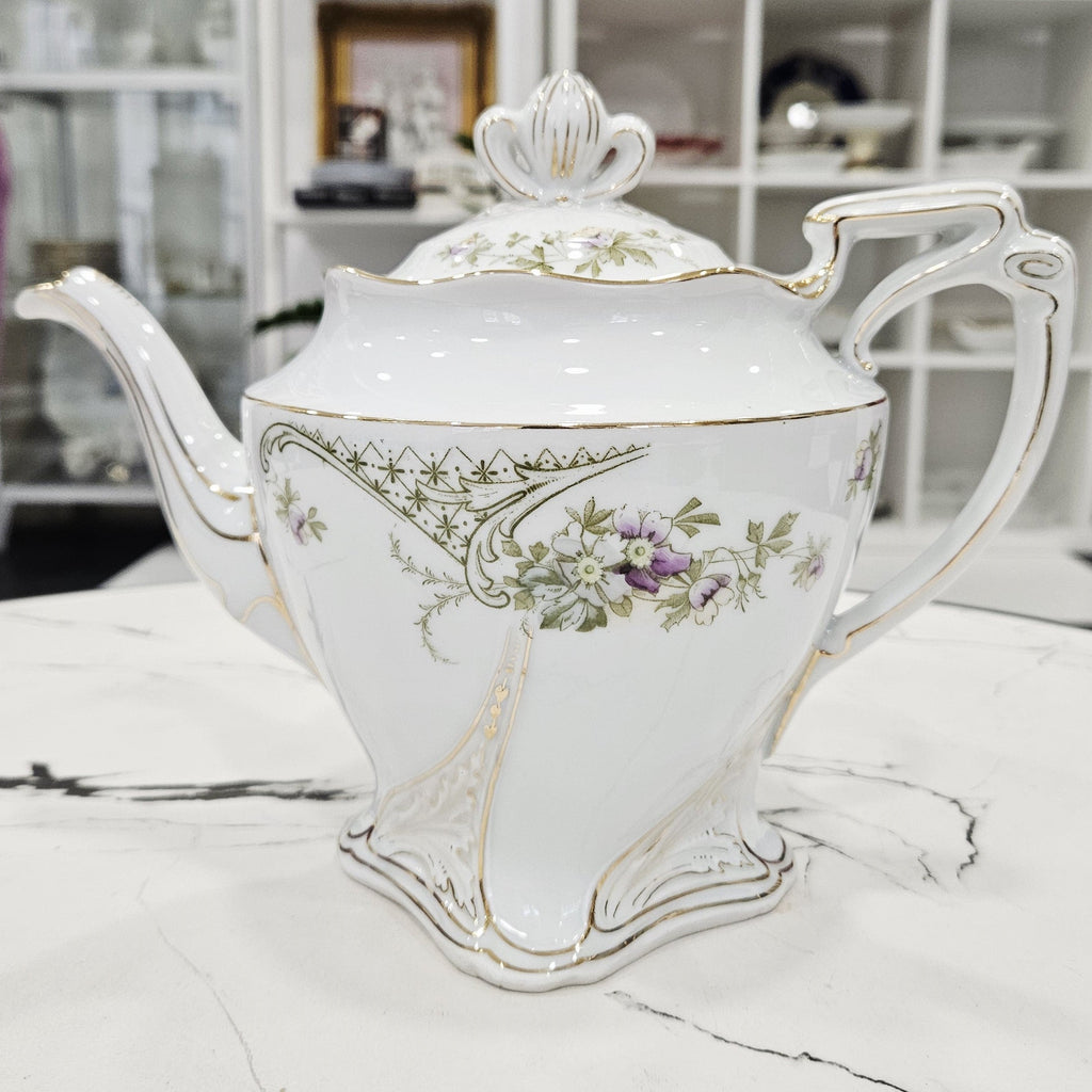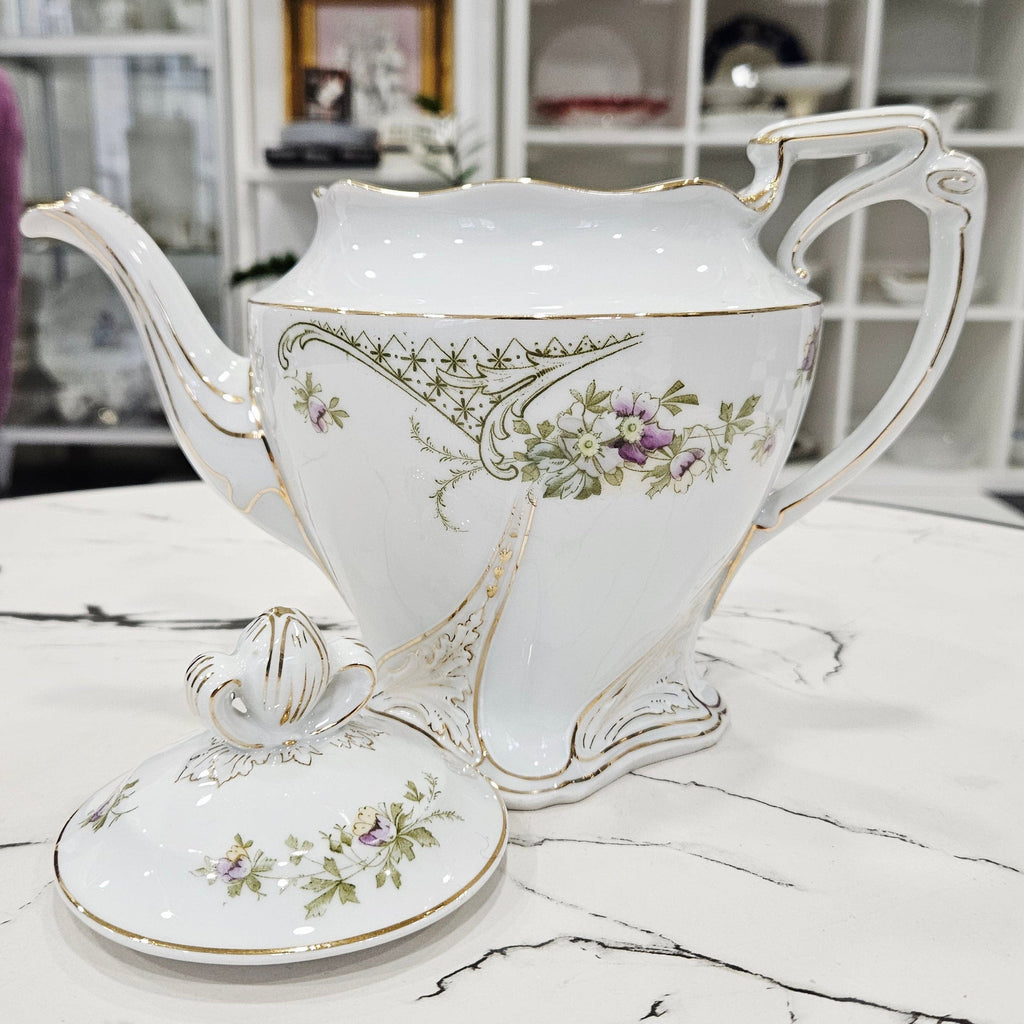 Elegante antike Porzellan-Teekanne mit floralen Ornamenten und vergoldeten Details