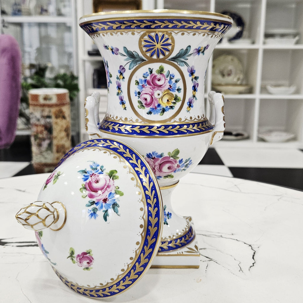 Antike Potschappel Dresden Porzellanvase mit Deckel, Rosenmotiven und Goldornamenten
