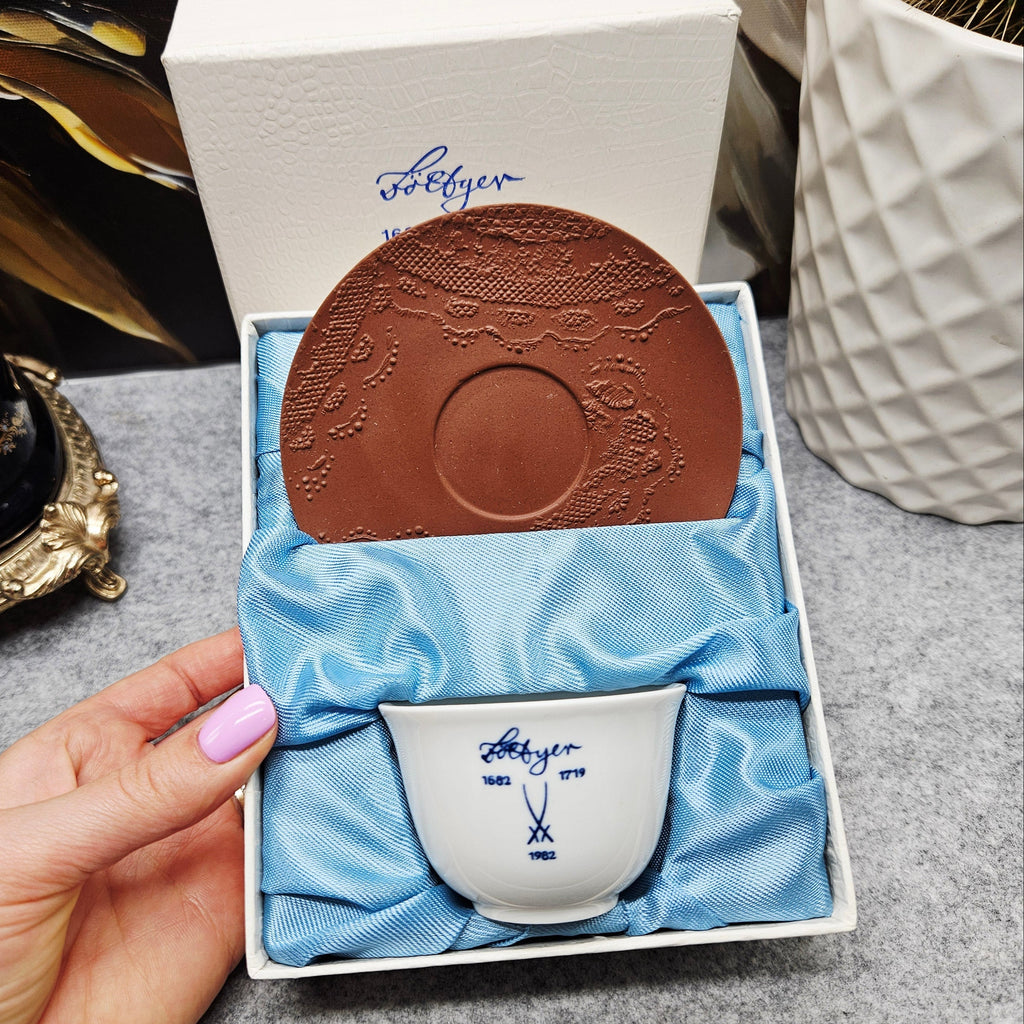 Eine schöne Meissener Jubiläumstasse mit Untertasse "Koppchen" von 1982 in einer Schachtel (80ml.)