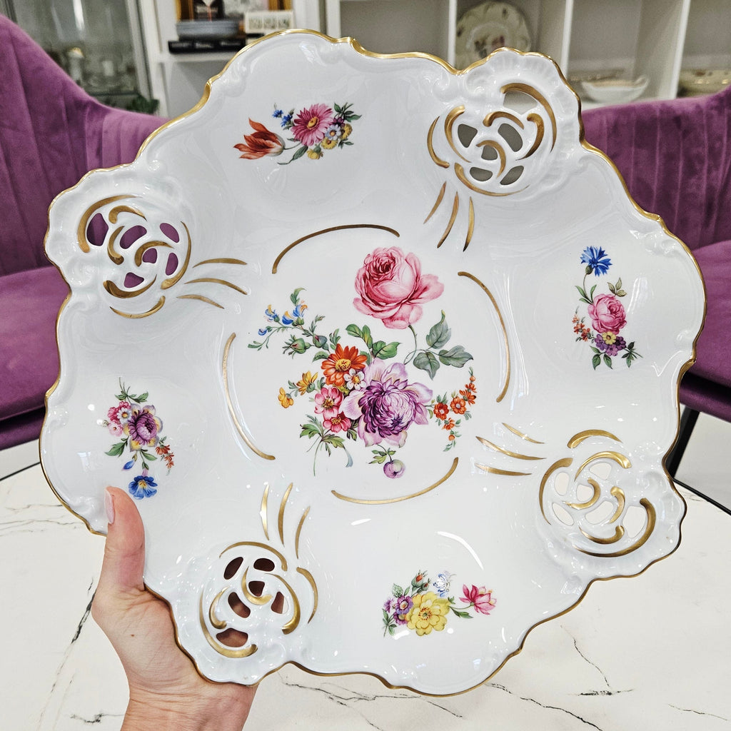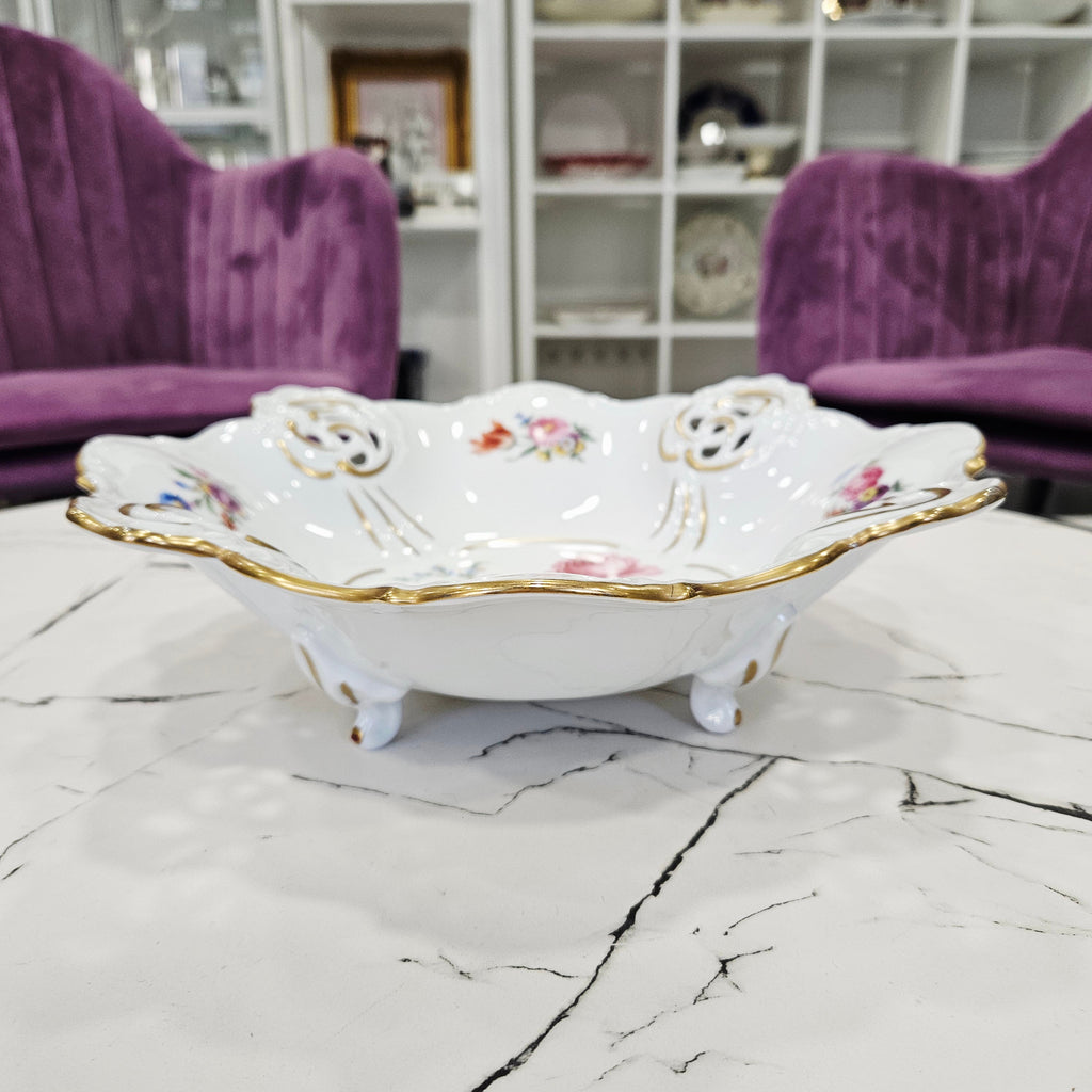 Große Weimarer Porzellanschale auf Beinen mit floralem Dekor und 24K Golddekor (32cm.)