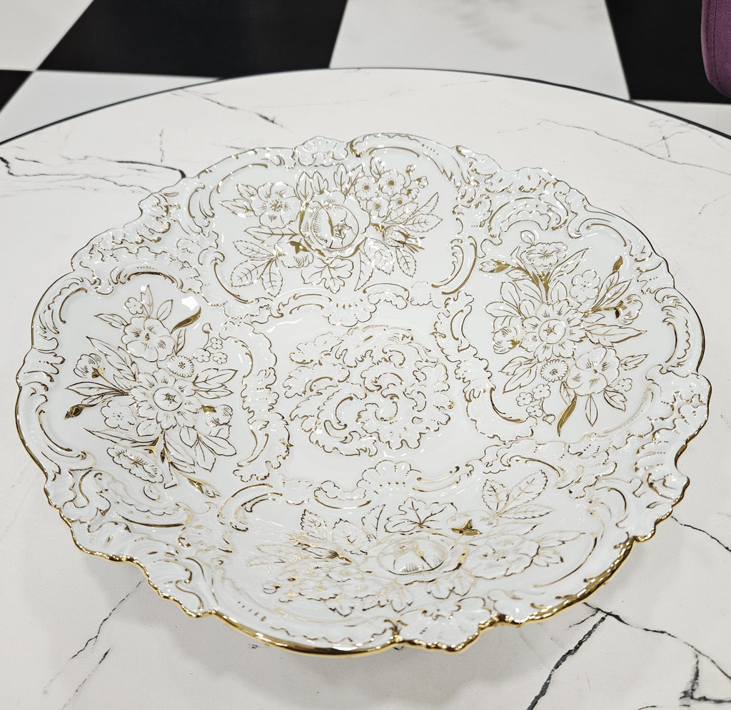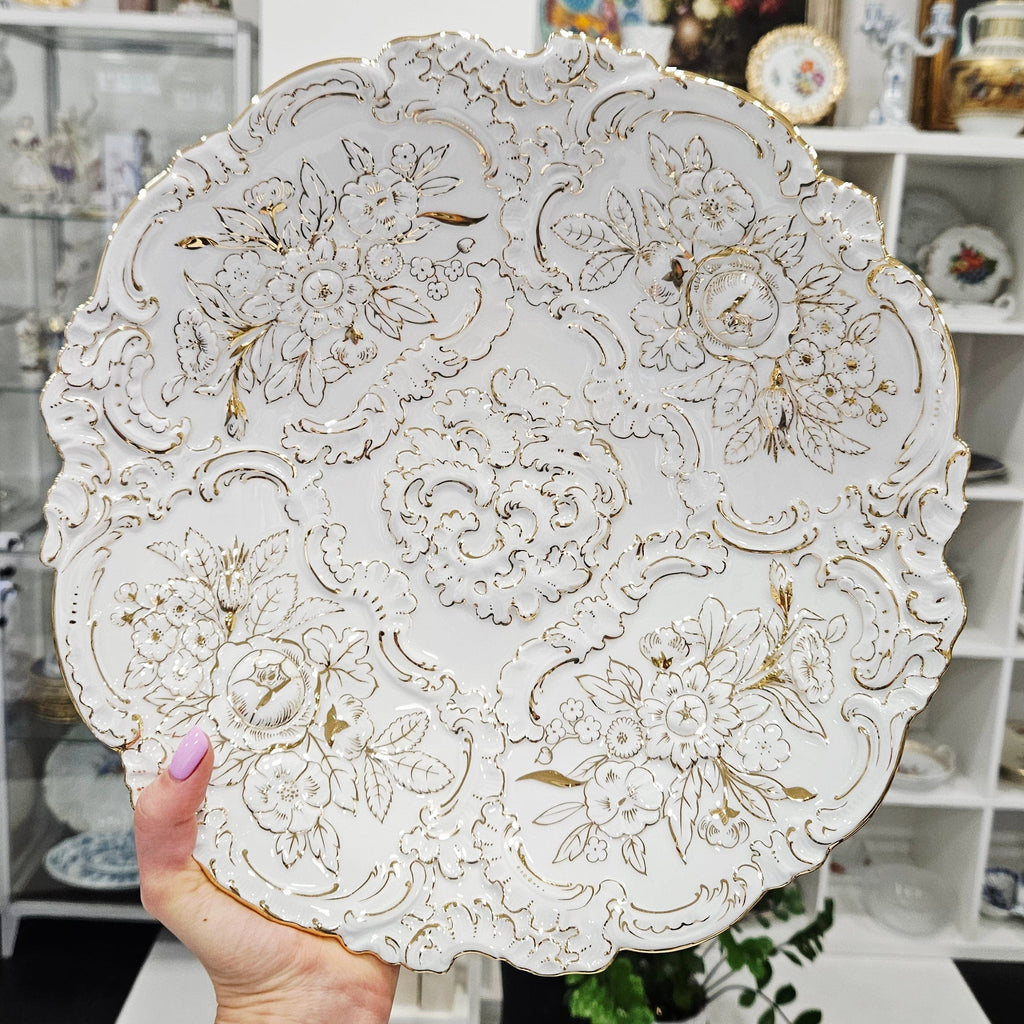 Großer Teller aus königlichem Meissener Porzellan mit geprägtem Rand und goldenem Blumendekor (31,5cm.)