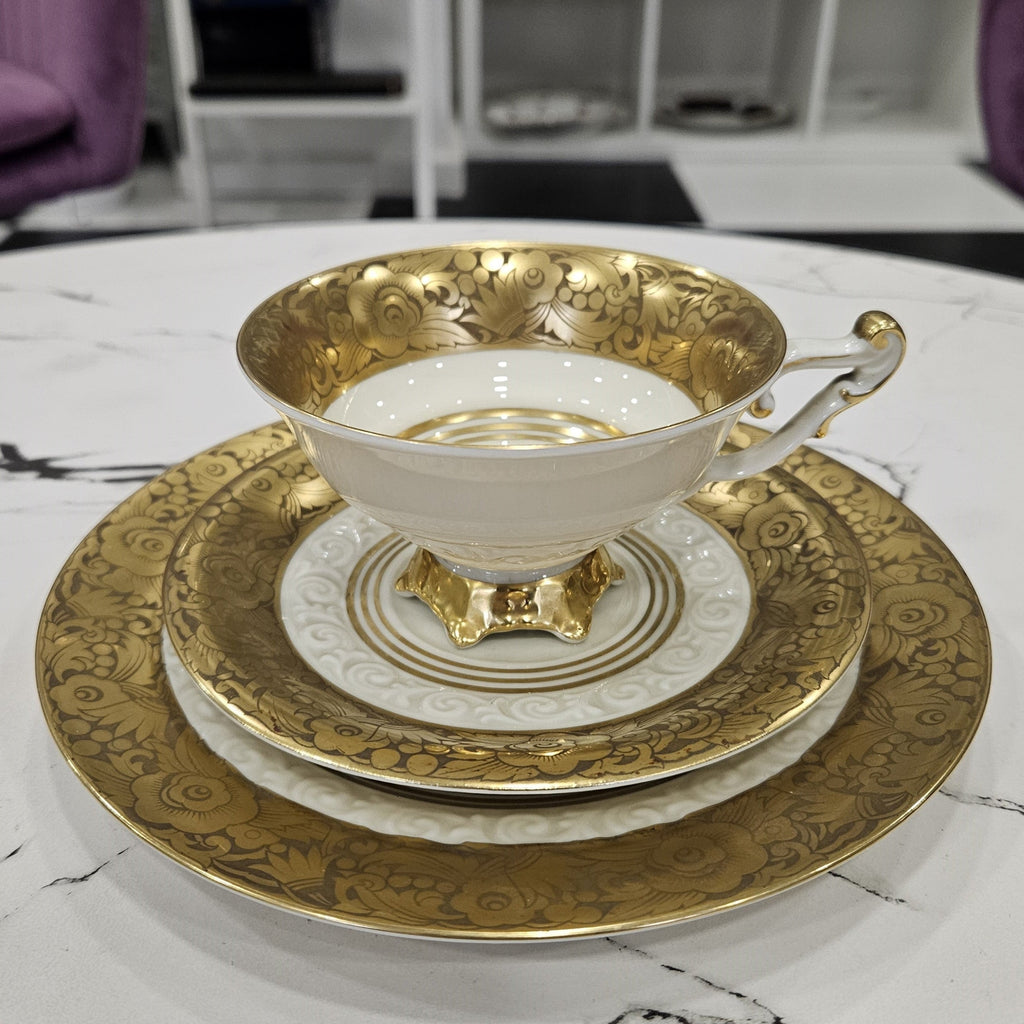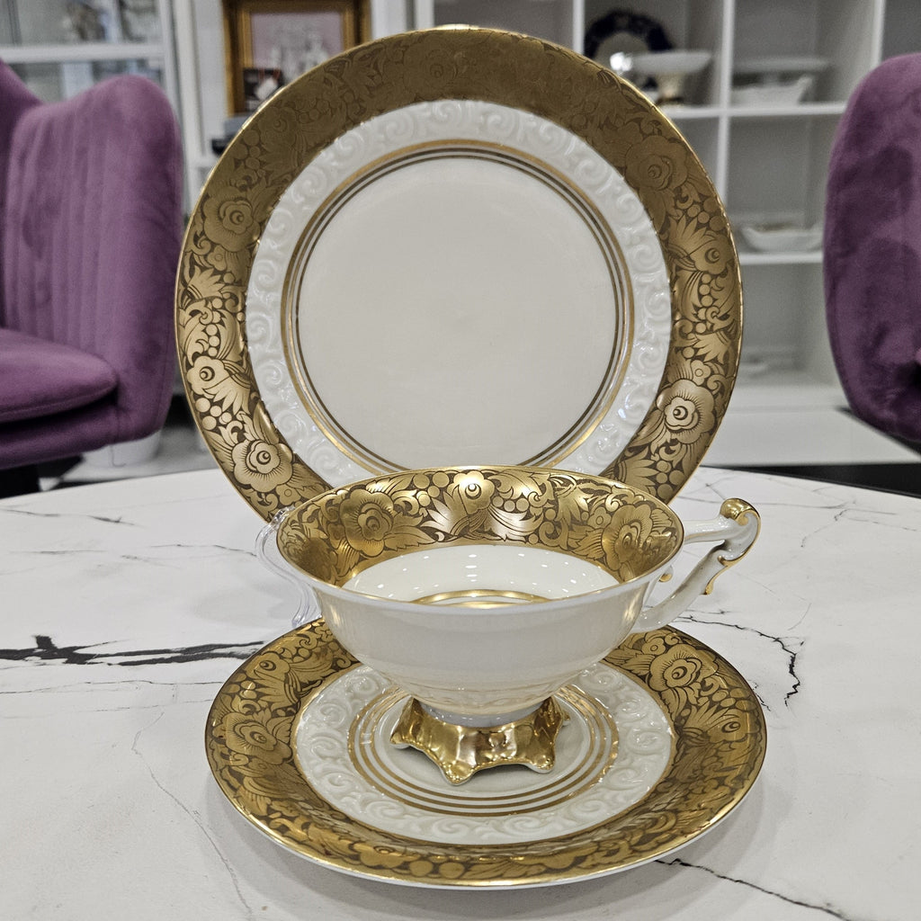 Seltenes, sammelwürdiges, luxuriöses, goldverziertes Weimarer Porzellan TRIO (1 Tasse + 2 Teller) (220ml.)