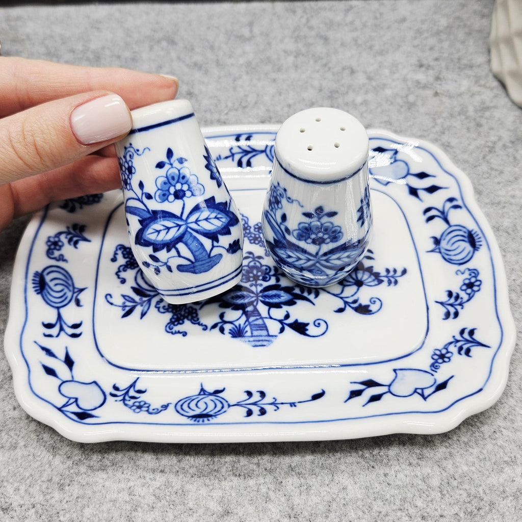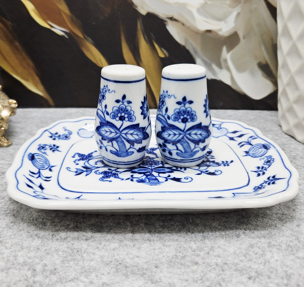 3er-Satz. Porzellan Salzstreuer, Pfefferstreuer, Tablett, dekoriert mit "Blau Zwiebelmuster".