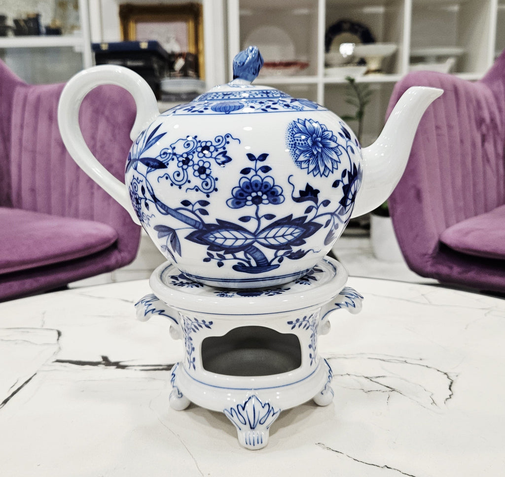 Satz von 2. "Hutschenreuther Porzellan Teekanne mit Stövchen. Blaues Zwiebelmuster