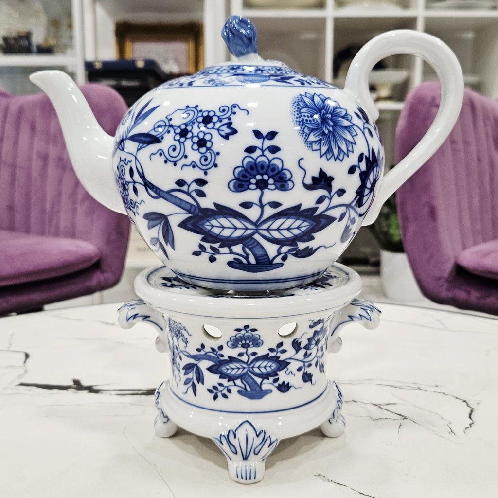 Satz von 2. "Hutschenreuther Porzellan Teekanne mit Stövchen. Blaues Zwiebelmuster