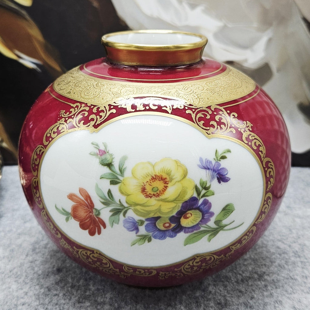 Lindner Bavaria Luxus Vase aus bordeauxfarbenem Porzellan mit goldenen Ornamenten