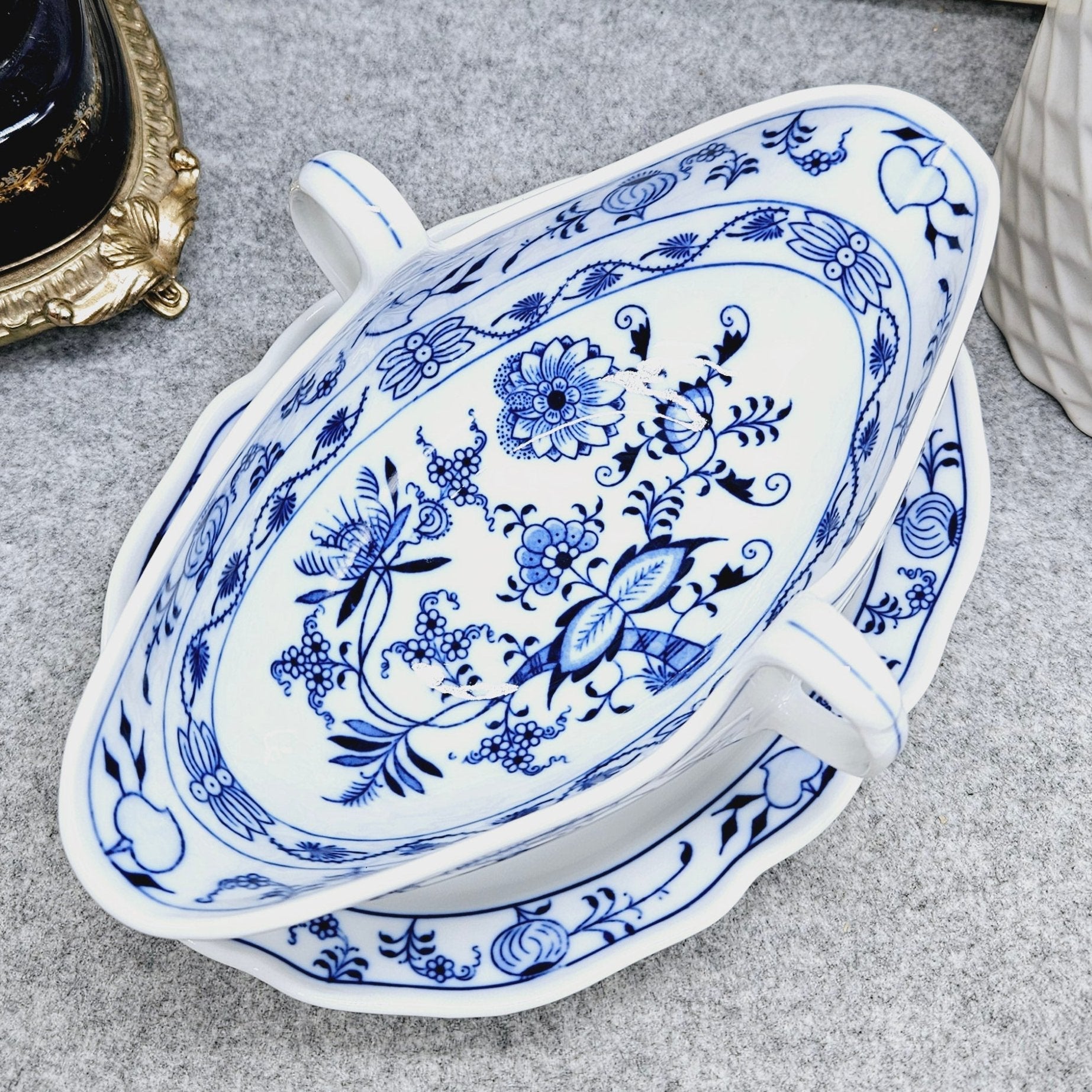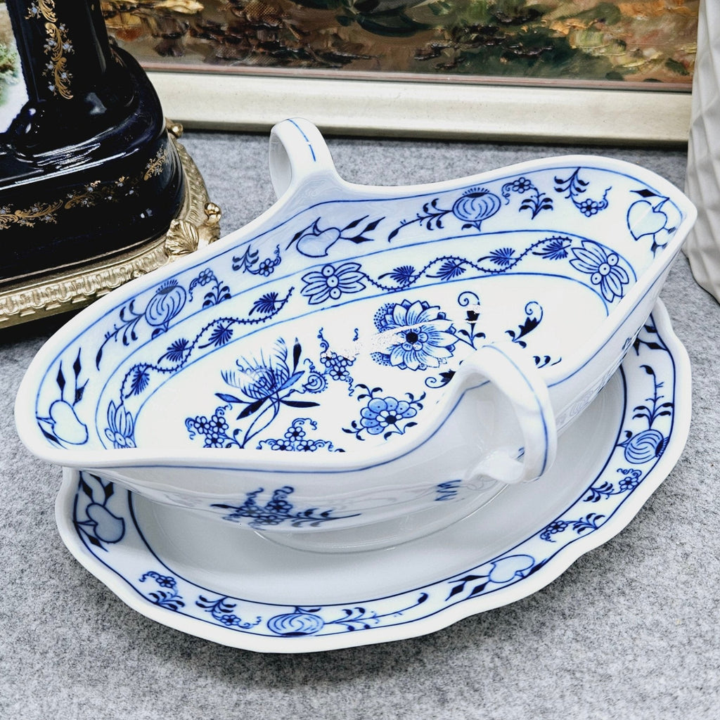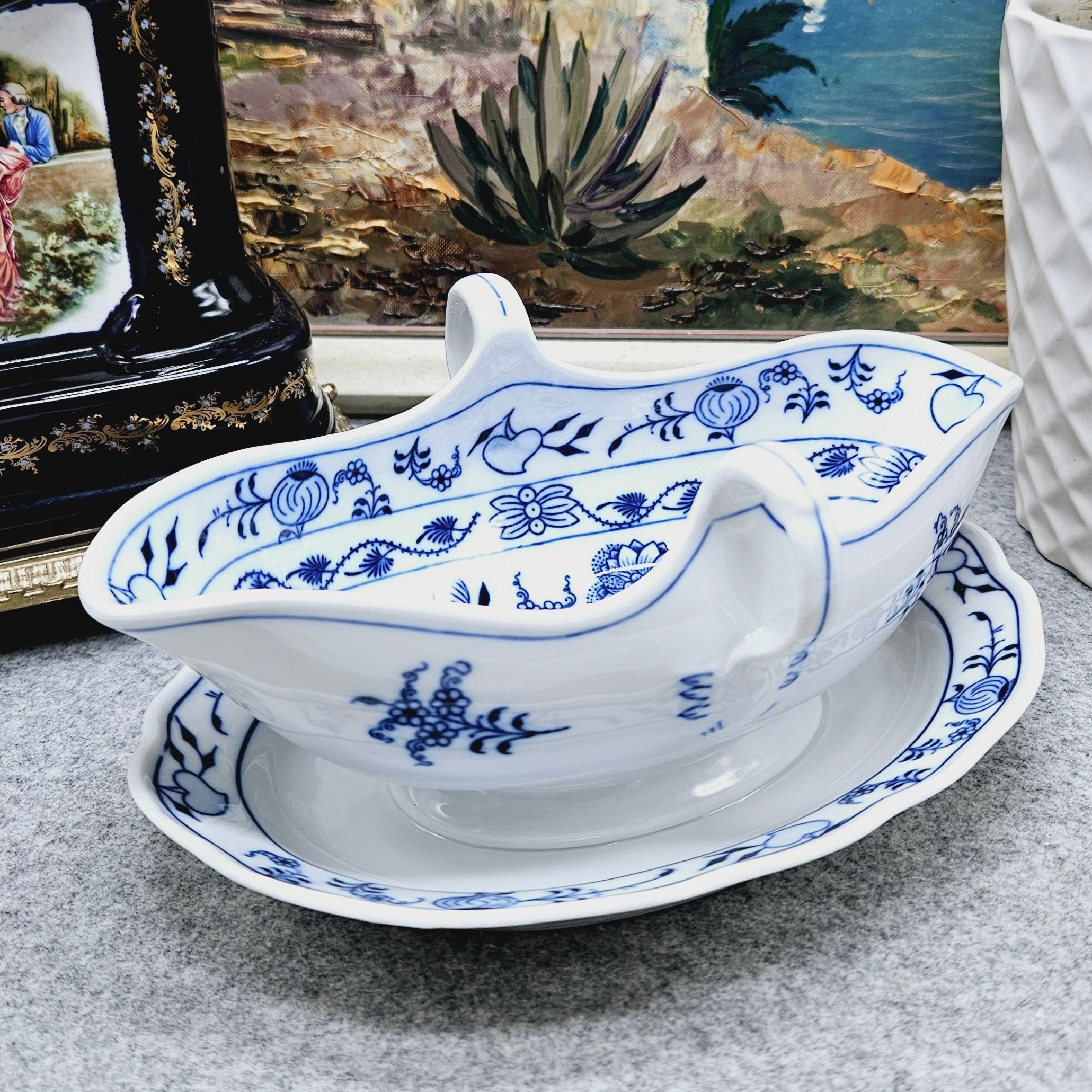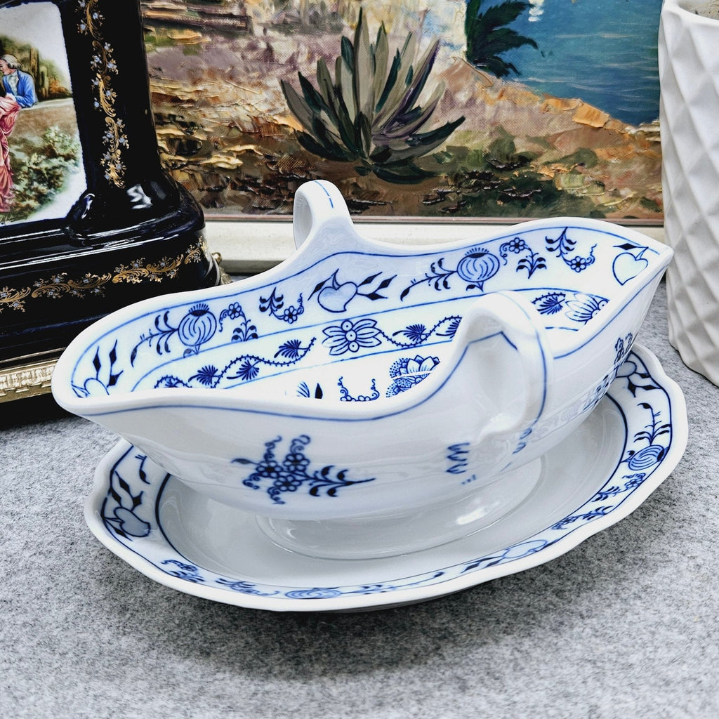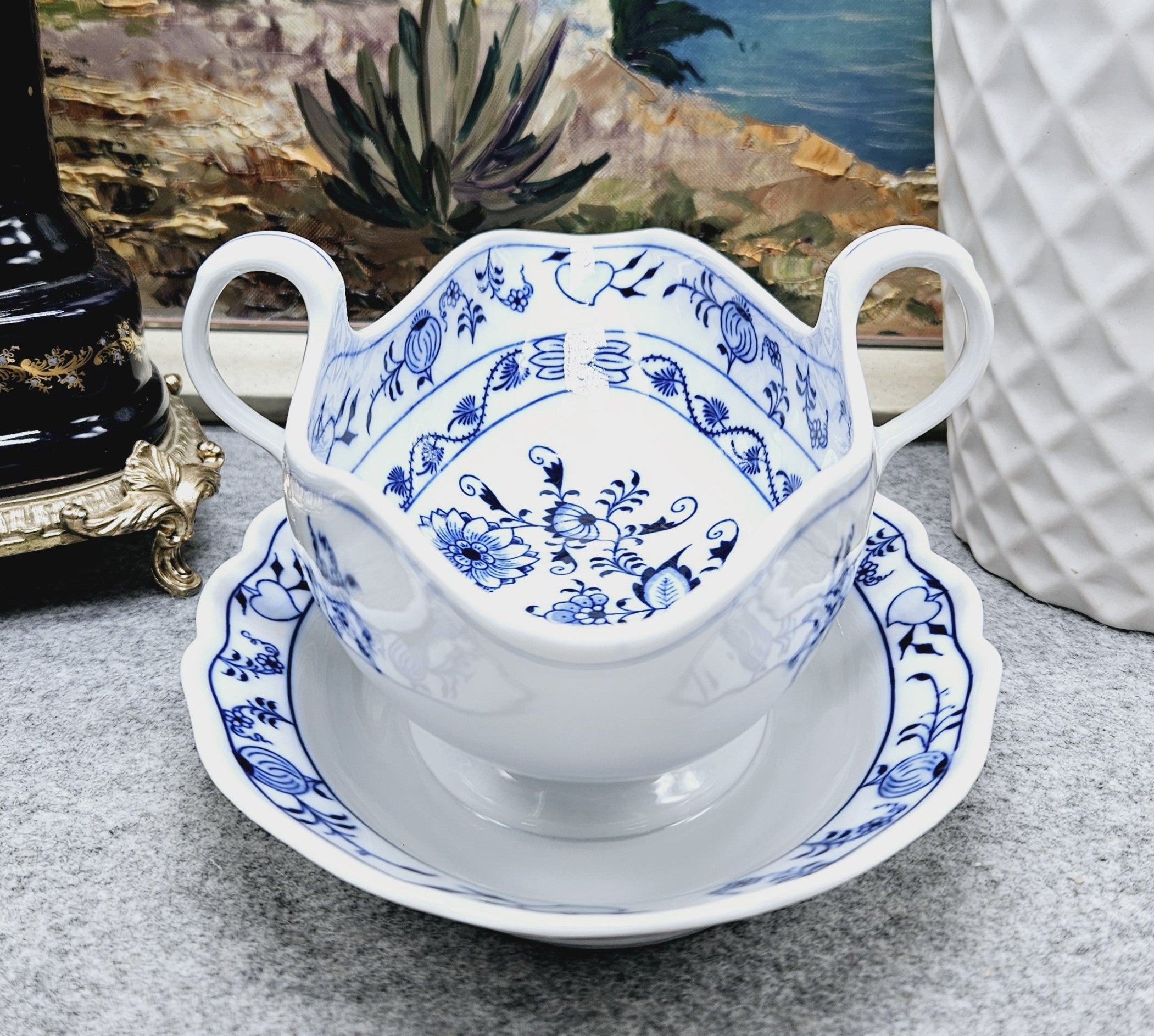 Das tschechoslowakische Porzellan-Zwiebelmuster (*blaues Zwiebelmuster*) ist ein klassisches Porzellandekor, das auf das 18. Jahrhundert. Es stammt ursprünglich aus der Manufaktur Meissen in Deutschland, wurde aber in der Tschechoslowakei sehr beliebt und weit verbreitet. Das Muster zeigt stilisierte Blumen, Früchte und Pflanzen, die in ihrer Komposition an Zwiebeln erinnern, obwohl sie in Wirklichkeit Granatäpfel und Pfirsiche darstellen. Traditionell sind die Motive in Blau auf weißem Porzellan gehalten. Das Porzellan mit Zwiebelmuster wird wegen seiner Eleganz und seines historischen Erbes geschätzt und ist auch heute noch bei Sammlern und Innenarchitekten beliebt.