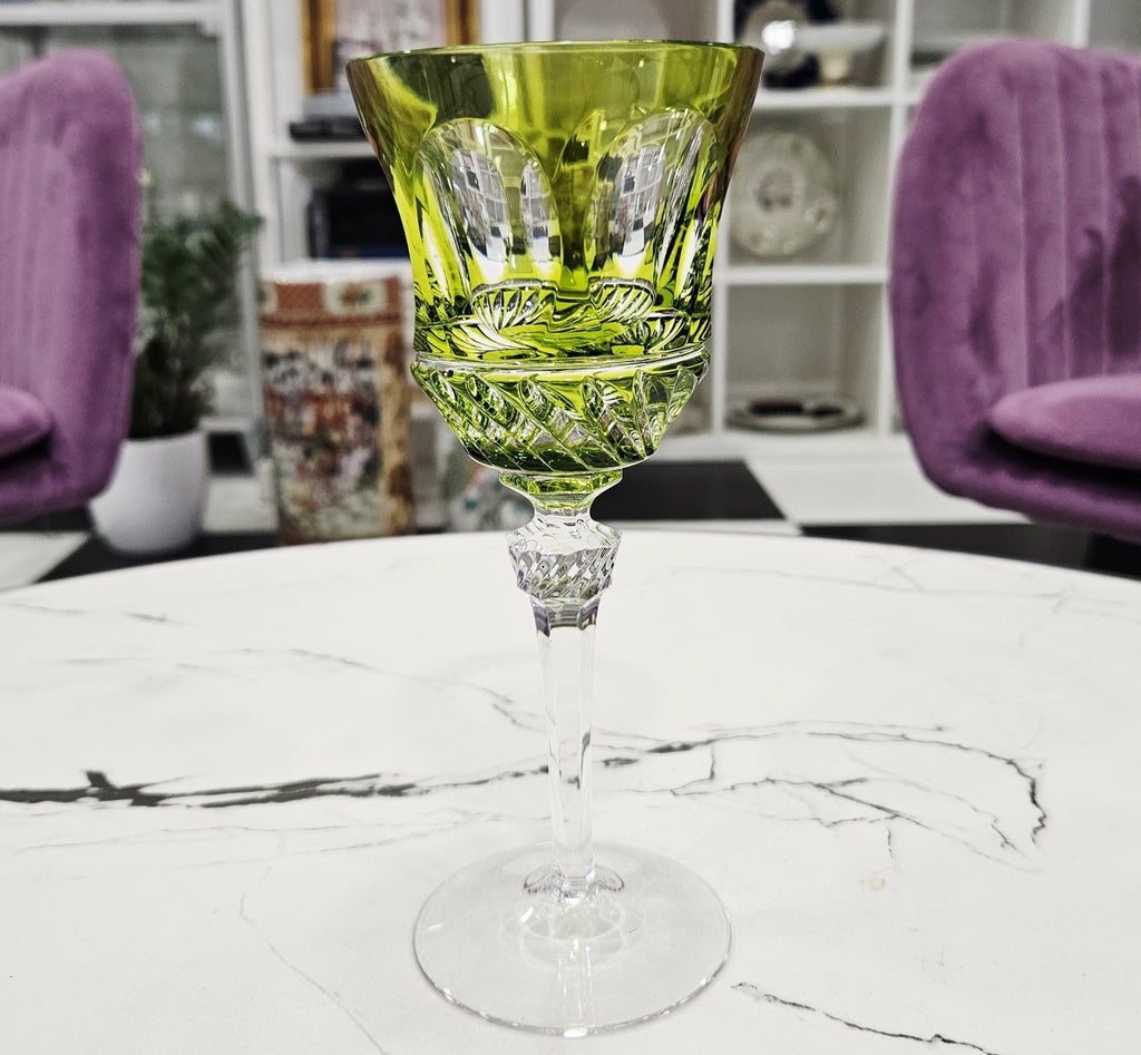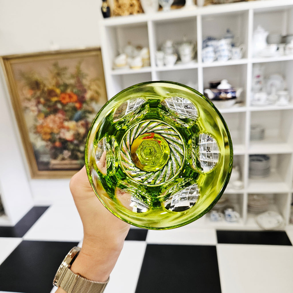 Dieser raffinierte Kelch in antikem hellgrünem Kristall ist ein wahres Schmuckstück im klassischen Stil. Er ist aus handgeschliffenem Kristall gefertigt und mit komplizierten Mustern verziert, die das Licht spielerisch reflektieren und ein exquisites Funkeln erzeugen. Der anmutige, transparente Stiel und die zart profilierte Form des Kelches unterstreichen seine Eleganz. Perfekt für Sammlungen und luxuriöse Tischdekorationen.