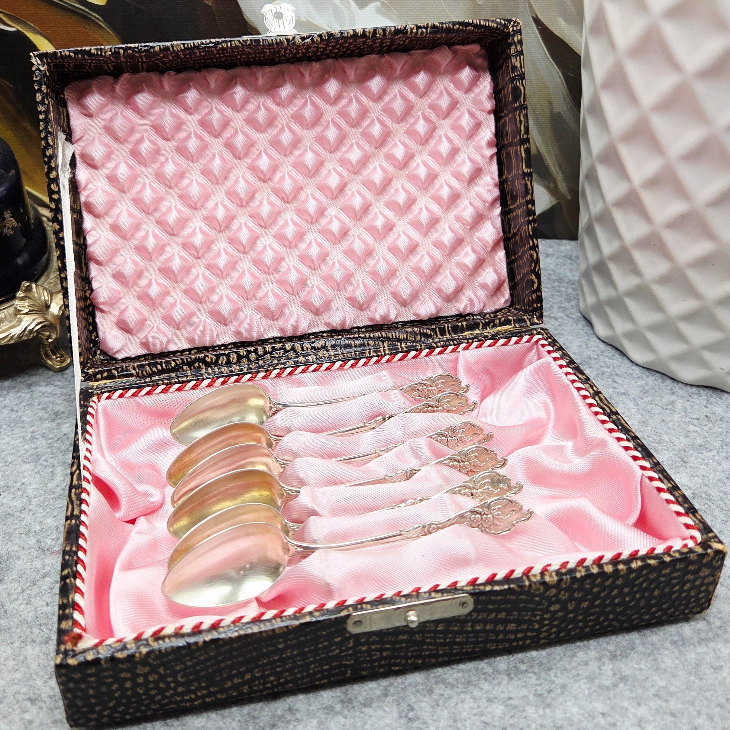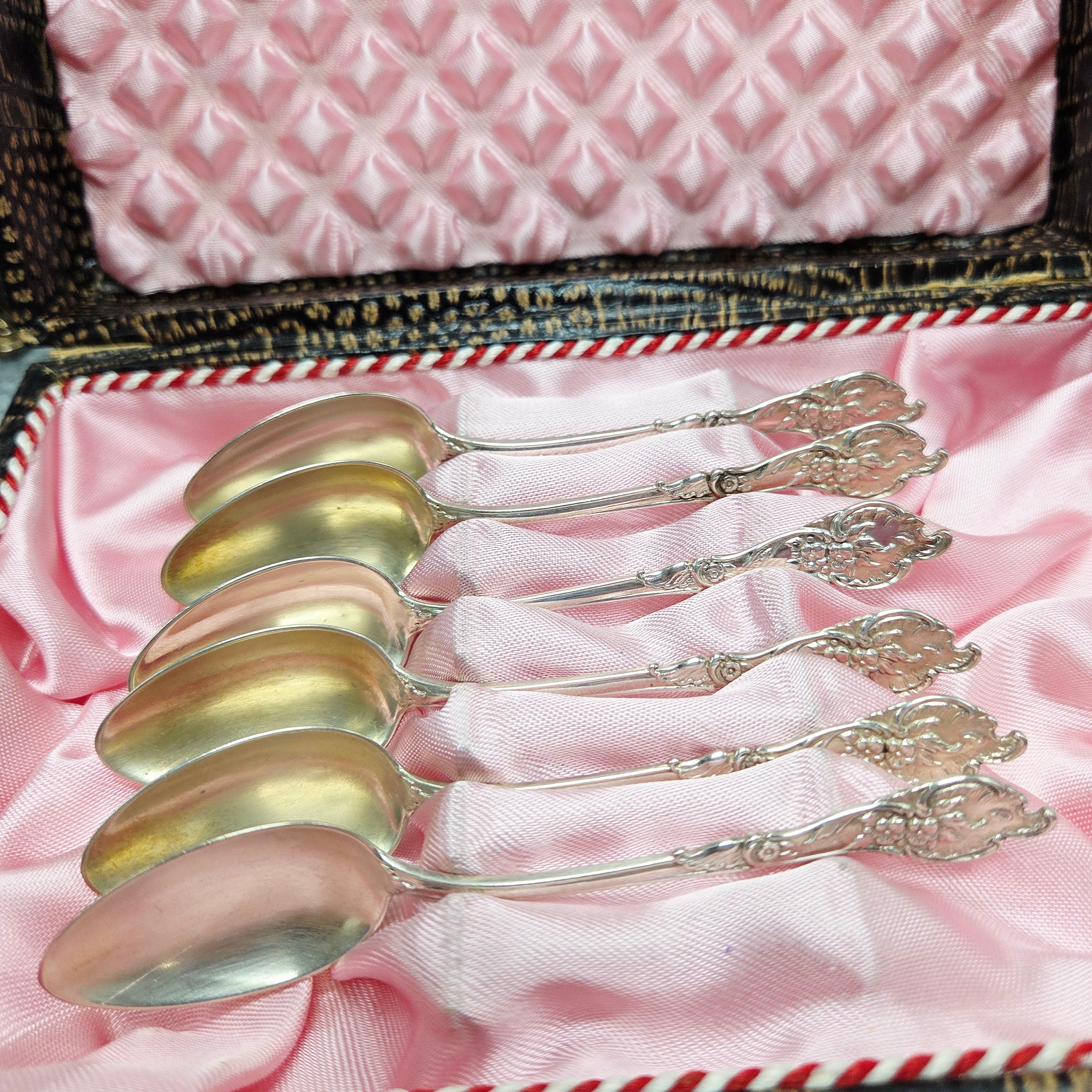 Die Löffel haben einen weichen, warmen Farbton, der typisch für natürlich gealtertes Silber ist und dem Set seine Authentizität und seinen historischen Charme verleiht. Das Set wird in seiner Originalschachtel mit zartrosa Innenfutter aufbewahrt, die nicht nur das Silber schützt, sondern auch die Repräsentativität des Sets unterstreicht.