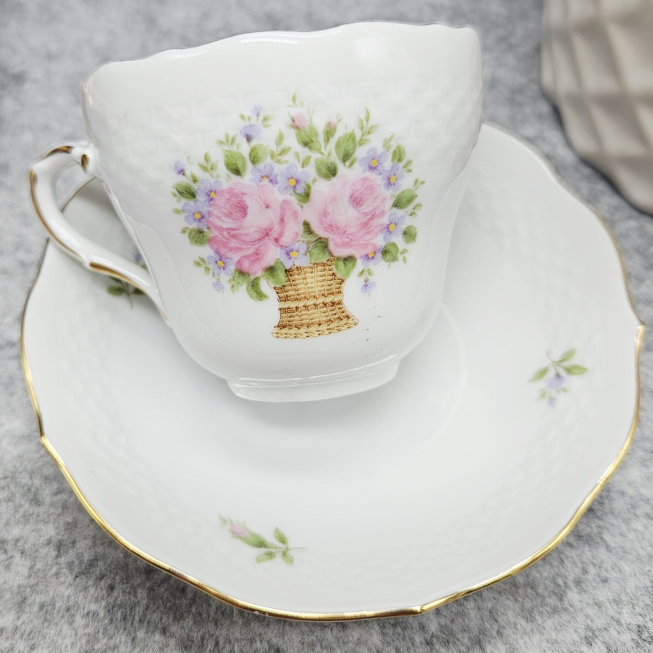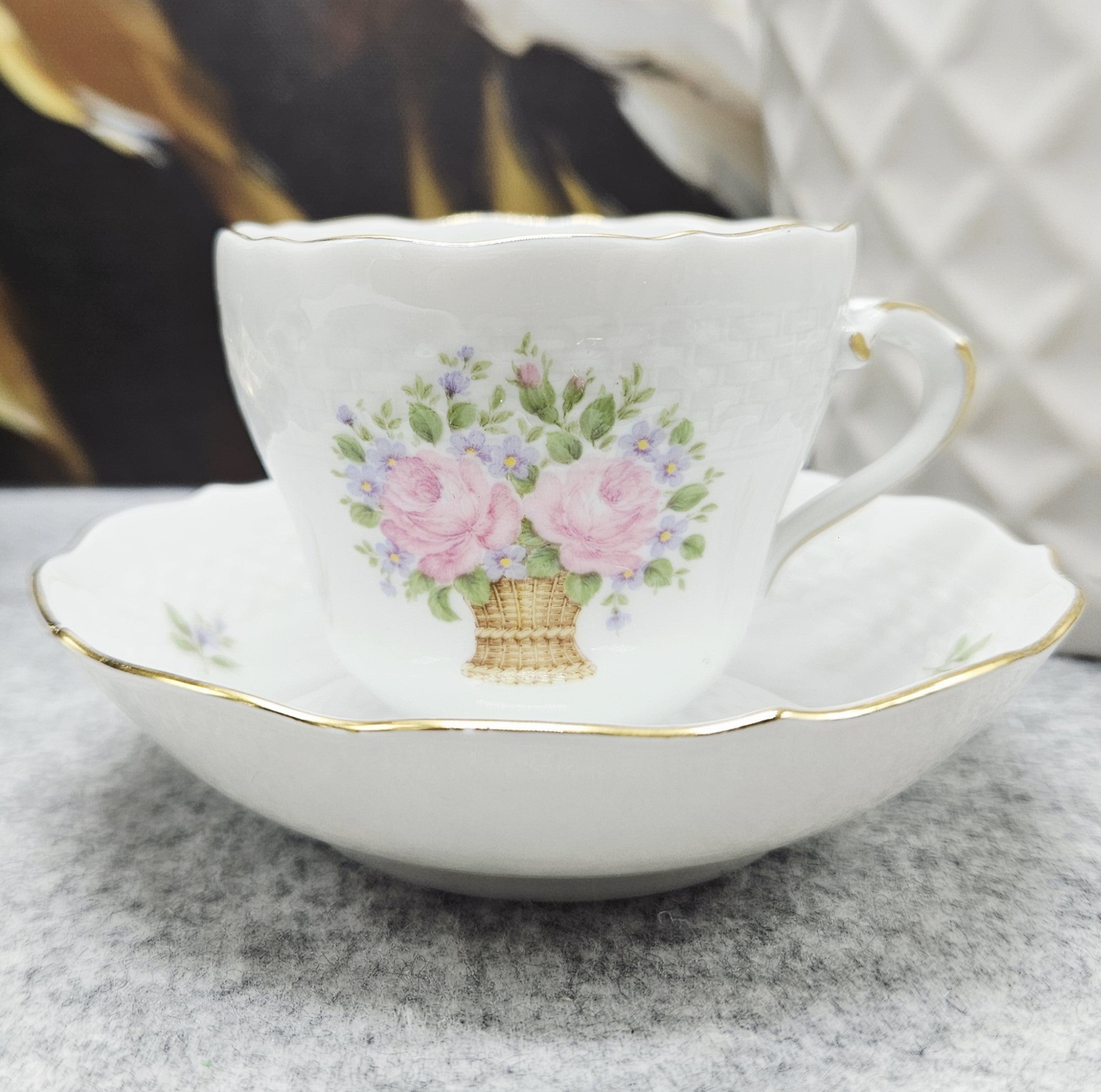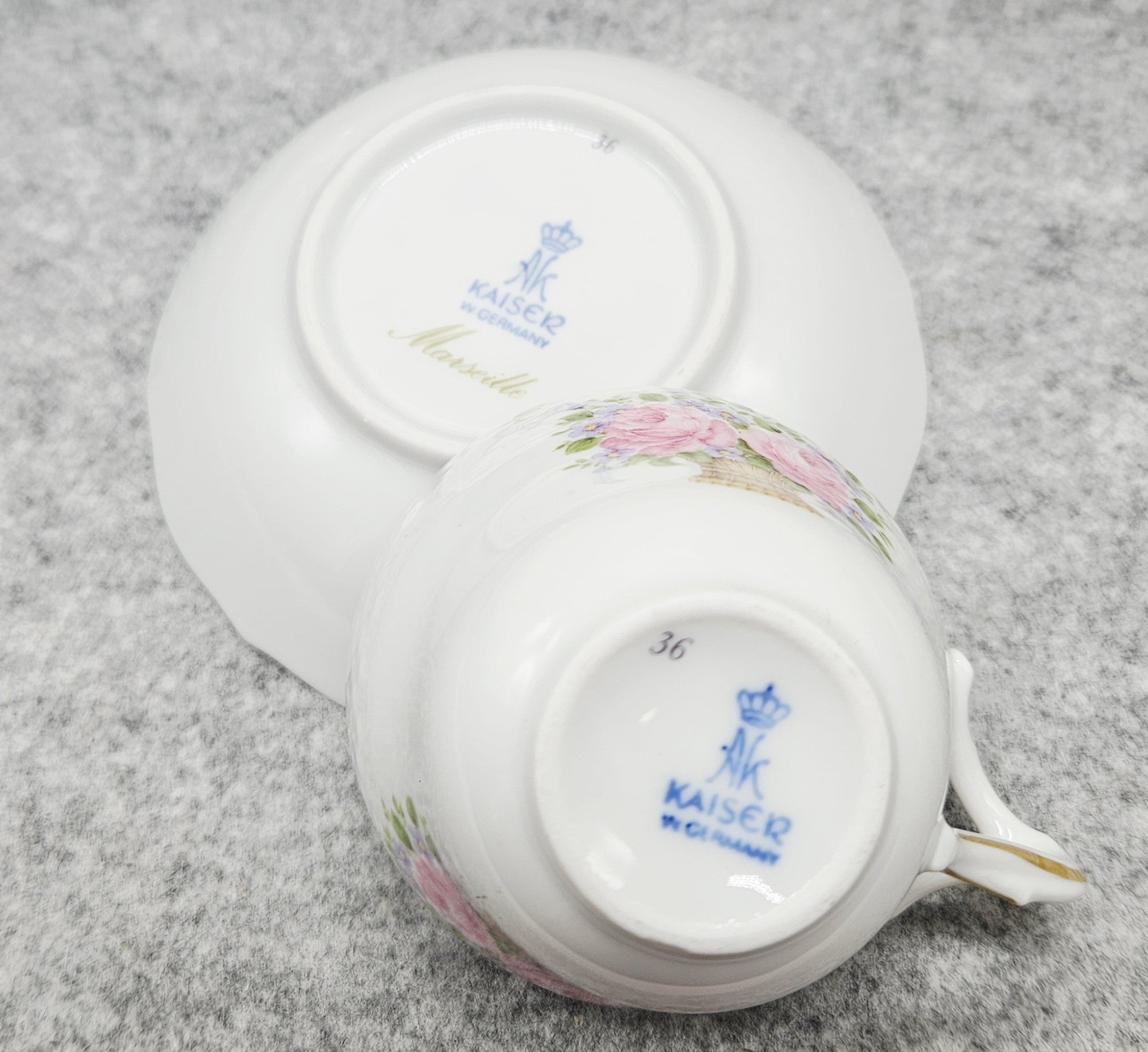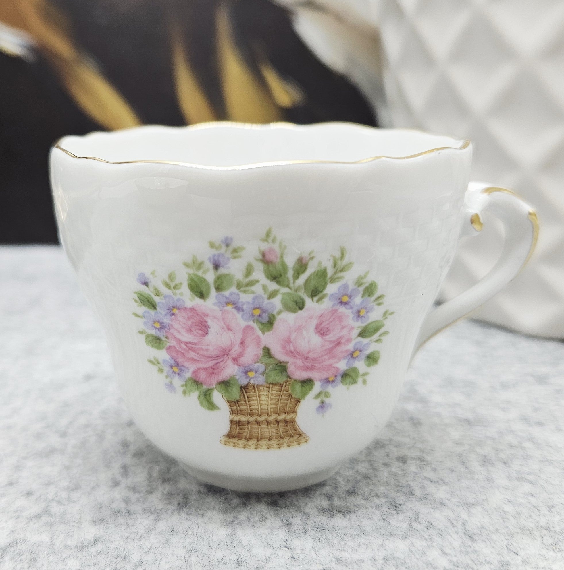 Diese Tasse aus weißem Porzellan von Ak Kaiser W Germany ist mit einem Gartenblumenarrangement, einem reich verzierten Henkel und einem geprägten Ornamentband verziert. Die vergoldeten Ränder der Tasse verleihen ihr einen Hauch von Luxus und Eleganz.