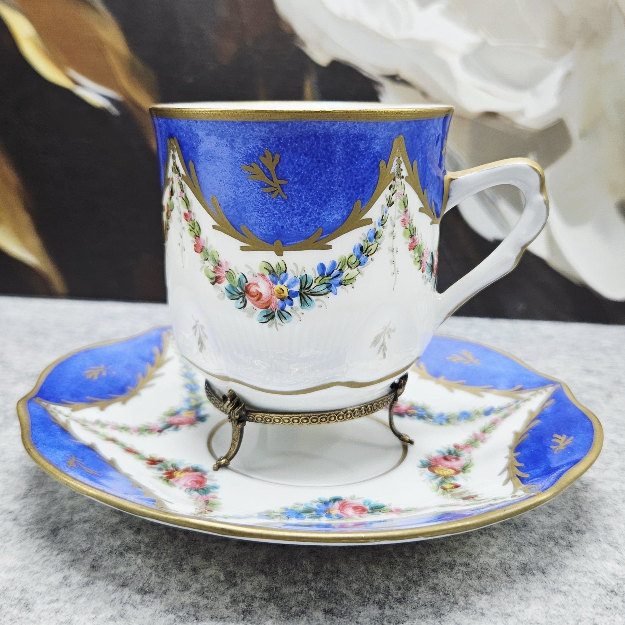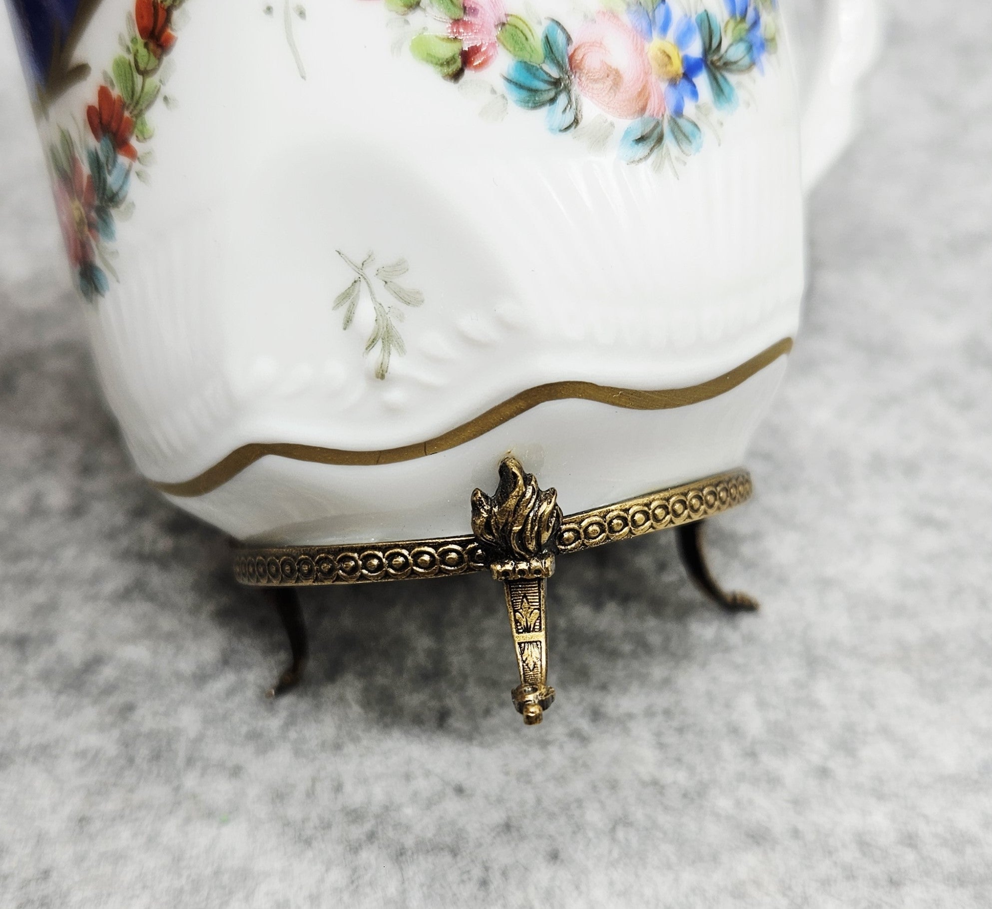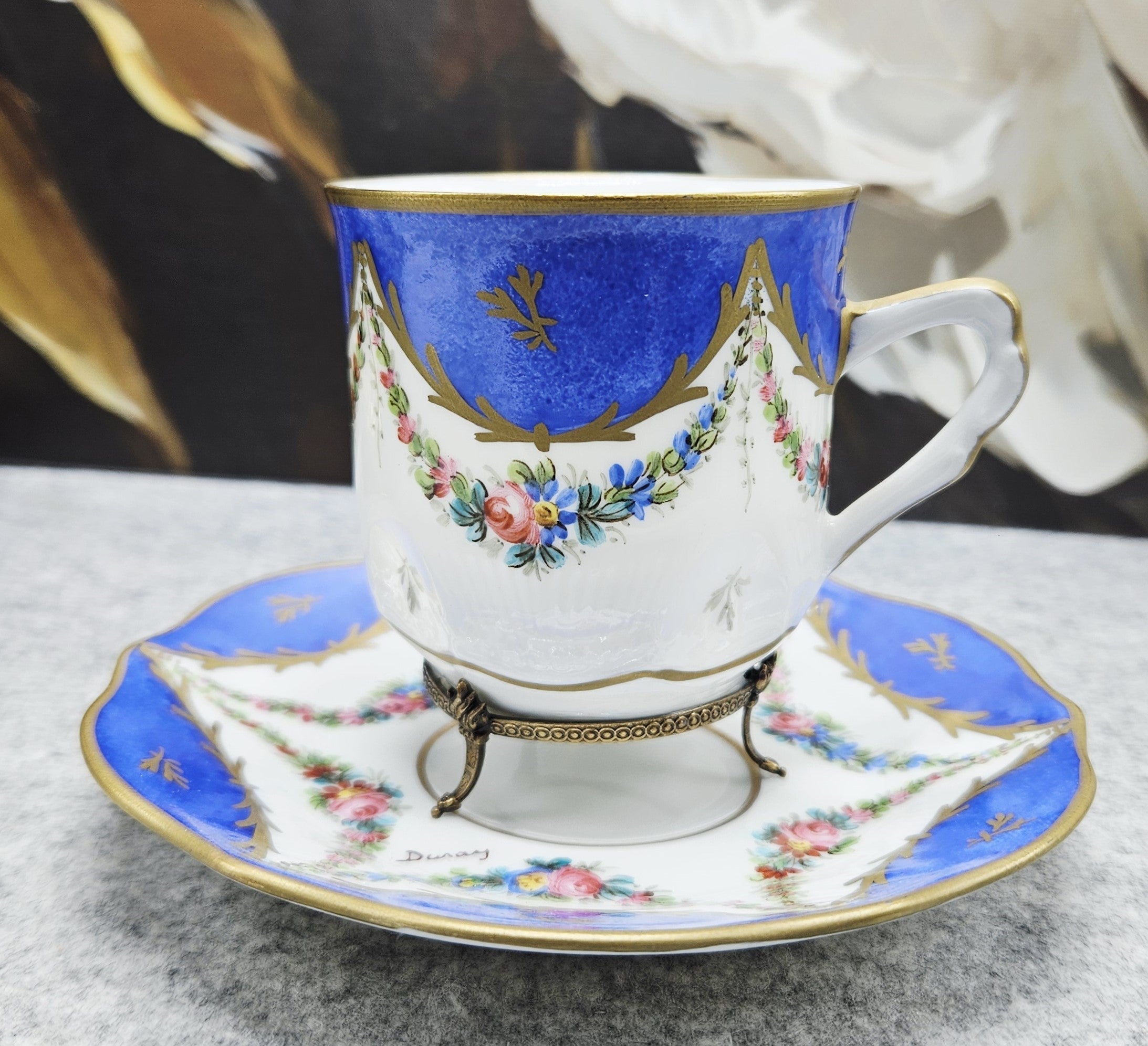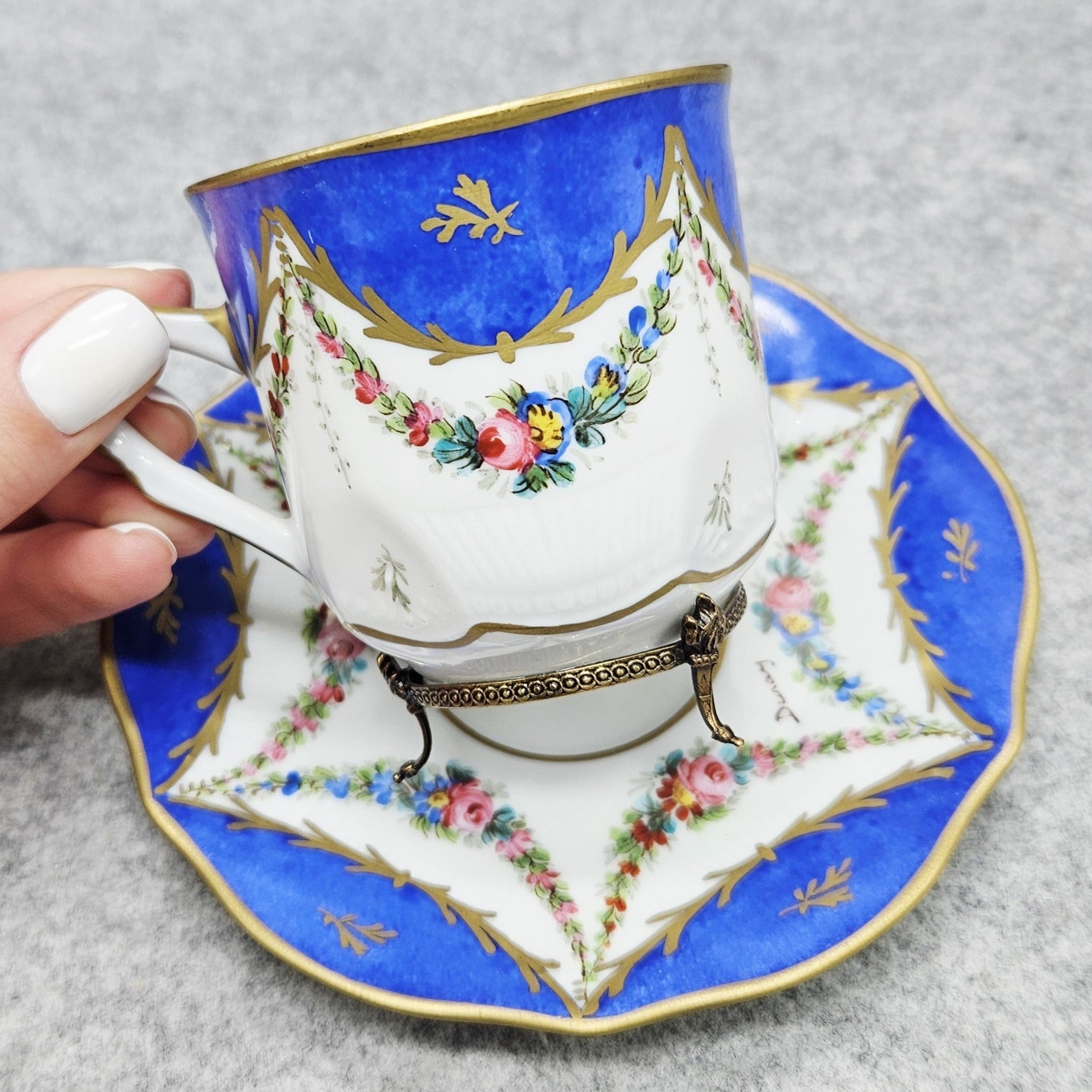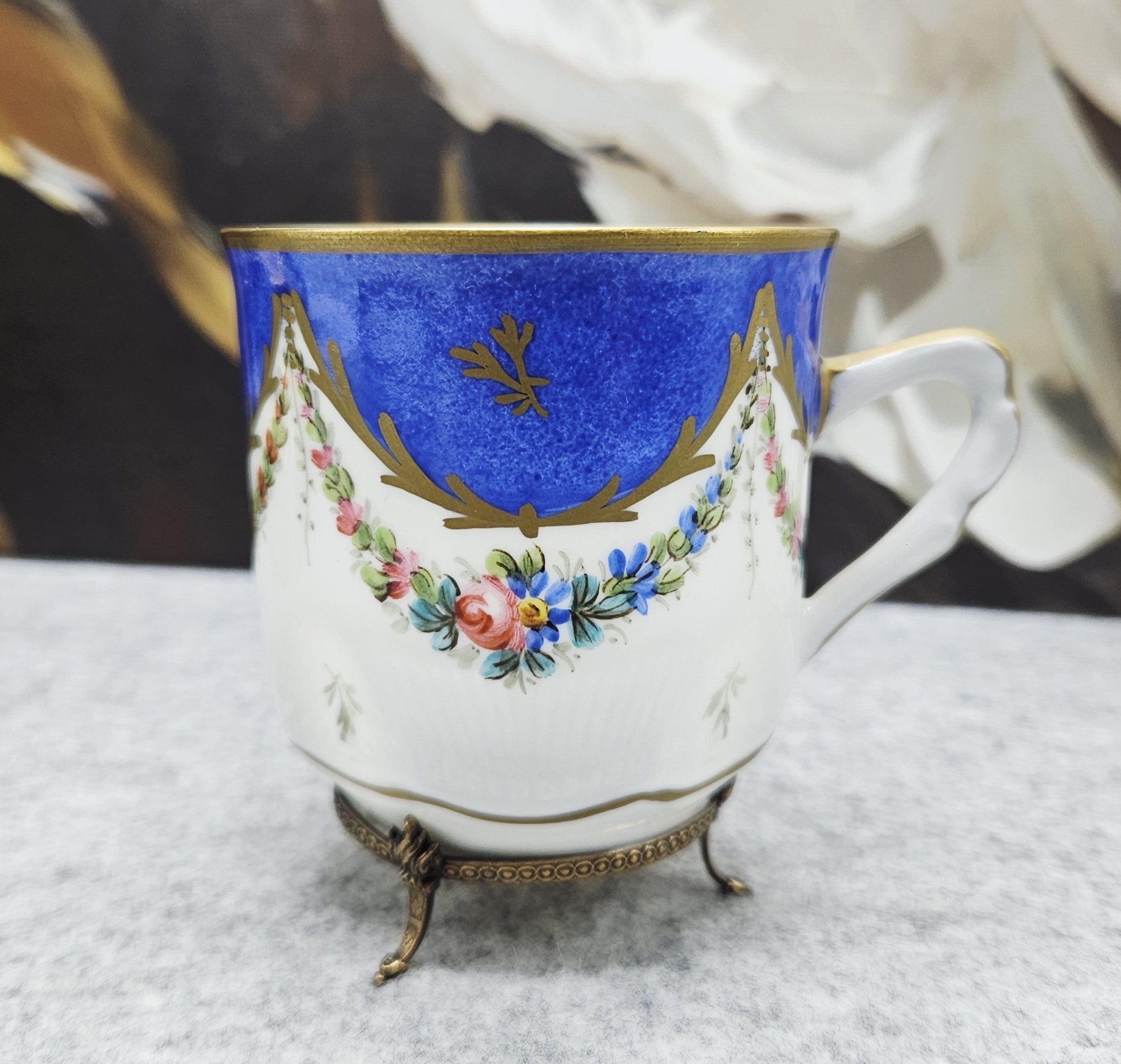 • Die Tasse hat einen Metallständer (wahrscheinlich Messing oder Bronze) mit kleinen Füßen. Dies verleiht ihm einen zusätzlichen Hauch von Luxus und Exklusivität - solche Rahmen sind typisch für französische Boudoir-Interieurs.