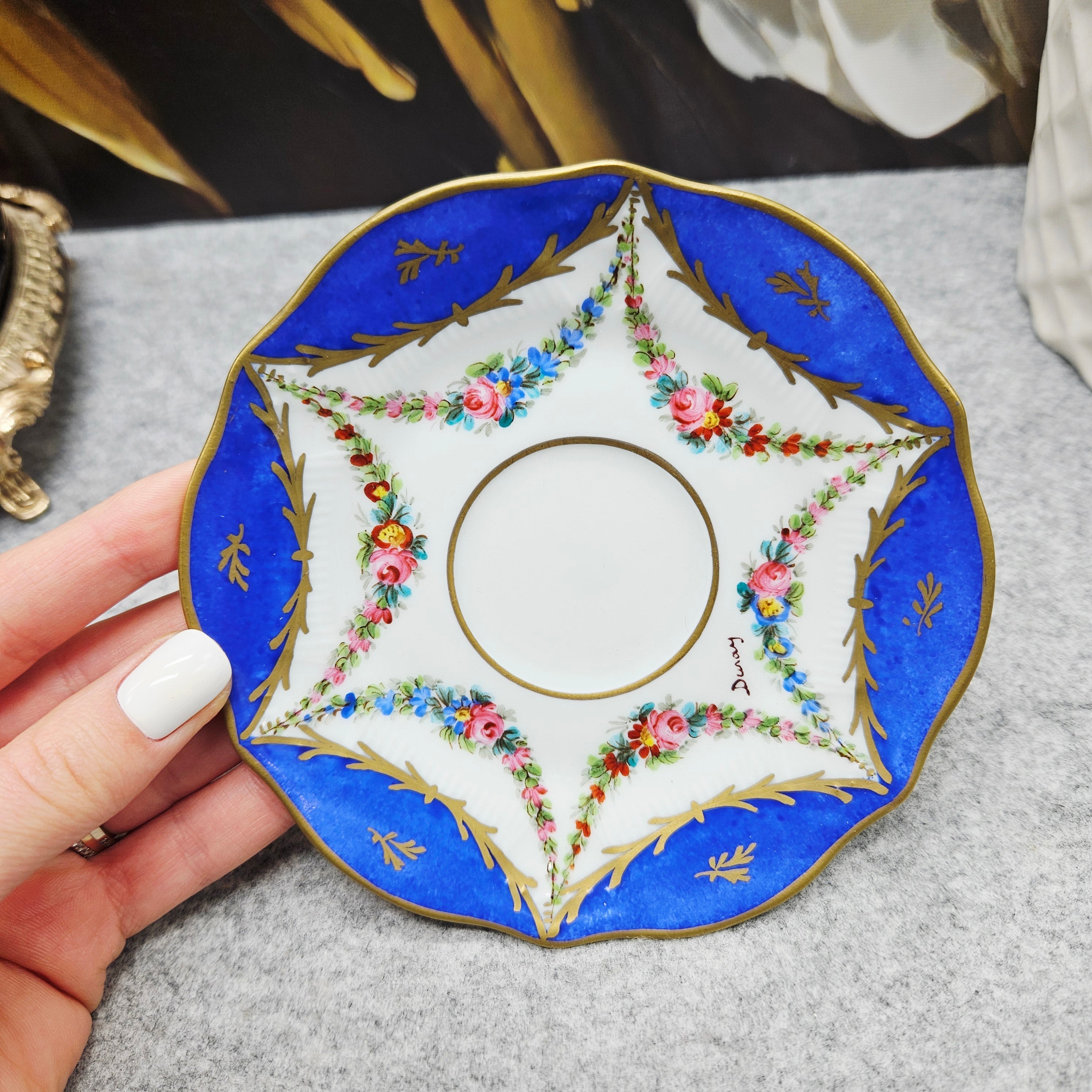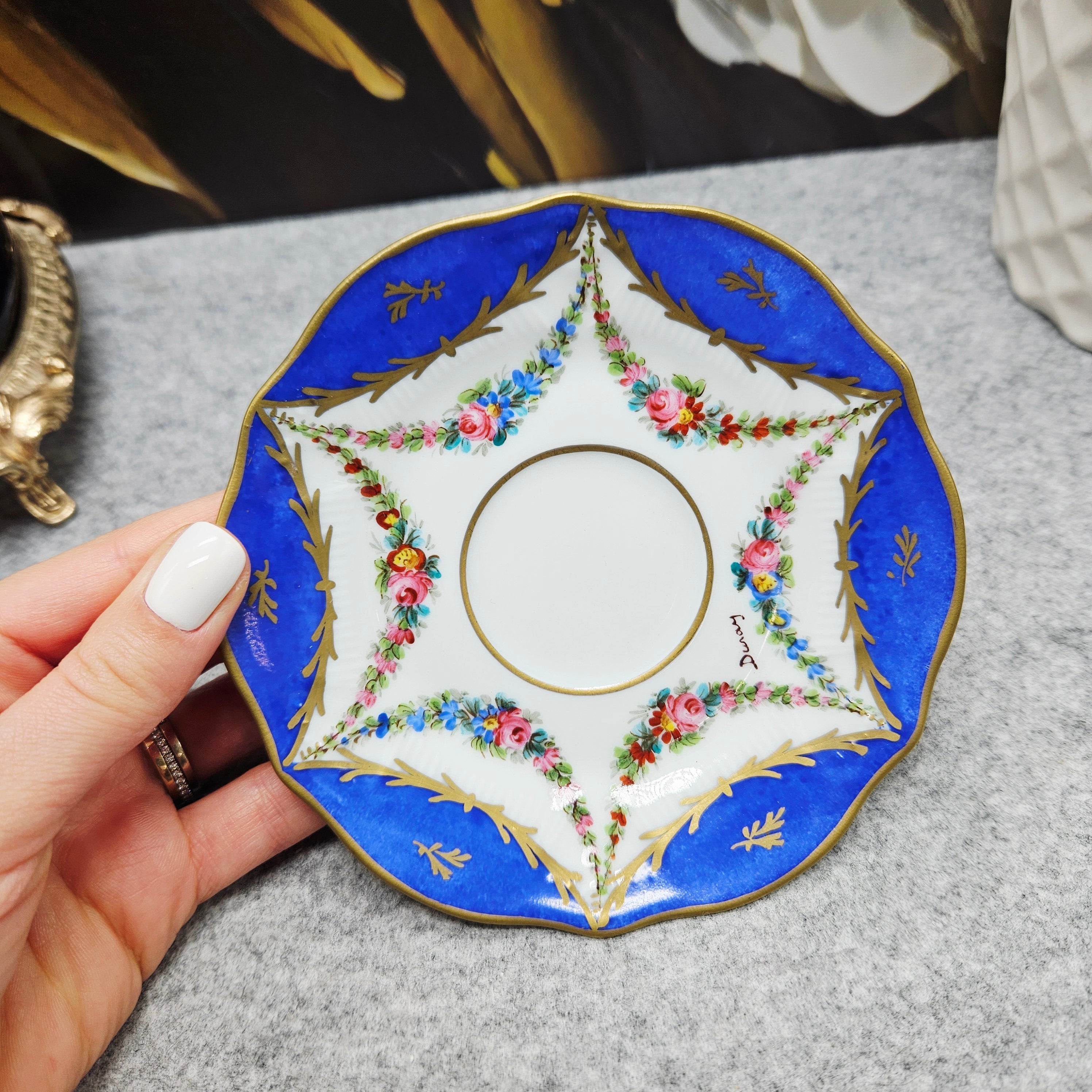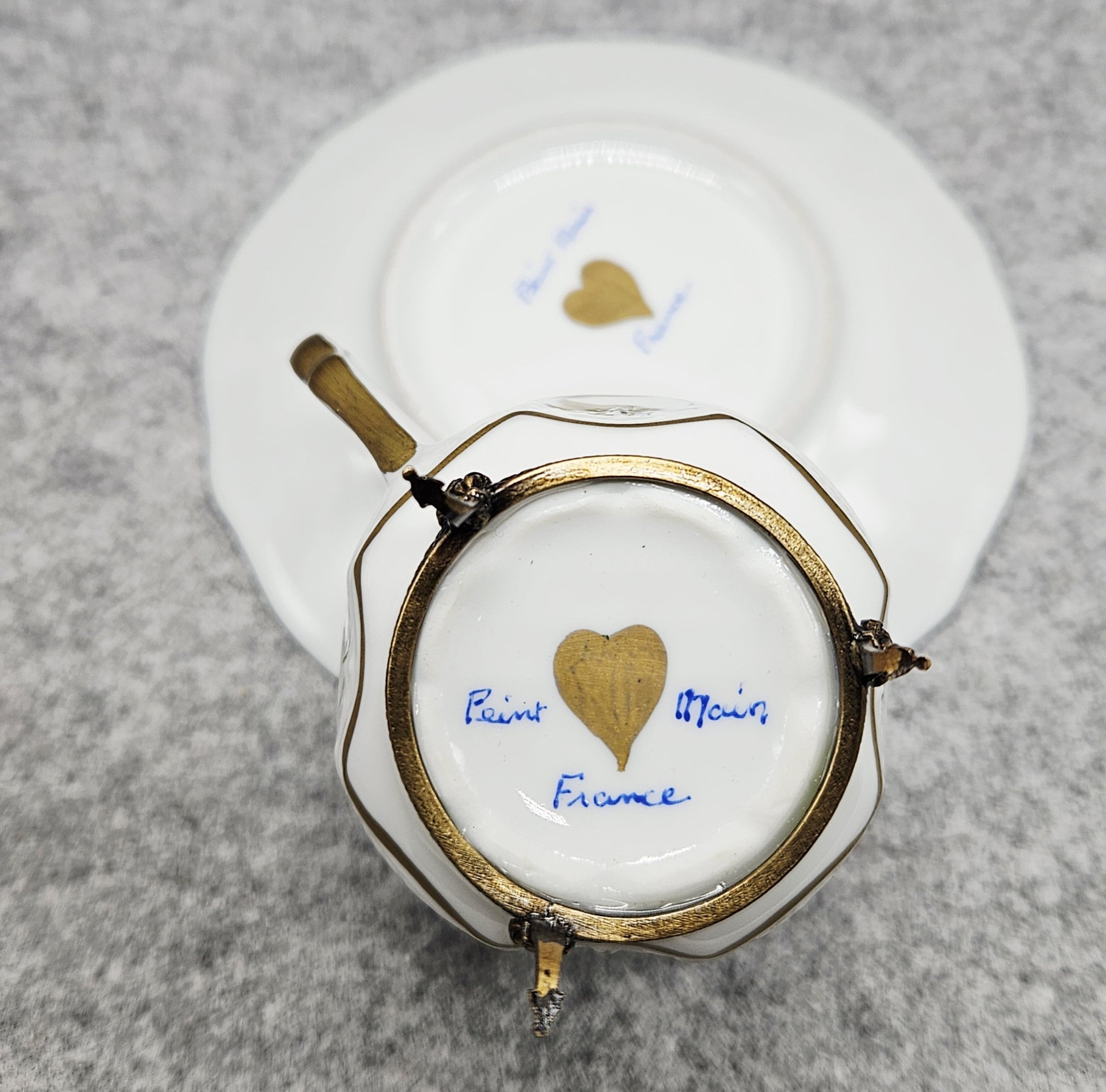 Der Boden der Tasse und der Untertasse ist handschriftlich mit der Aufschrift "Peint Main - France" und einem goldenen Herz versehen. Dies bestätigt, dass es sich bei der Verzierung um die Handarbeit eines Meisters handelt.