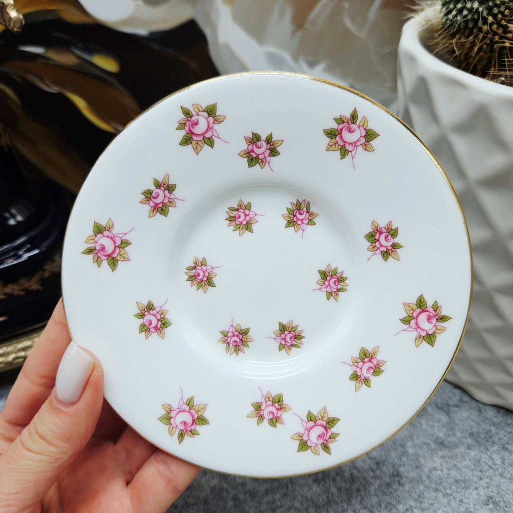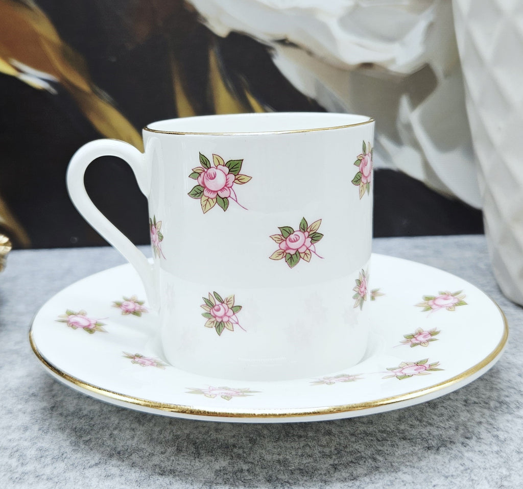 Die elegante Aynsley-Porzellantasse mit Untertasse ist der Inbegriff der edlen englischen Klassik. Auf dem weißen Knochenporzellan sind zarte rosa Blüten mit grünem Rand anmutig arrangiert, was einen romantischen und raffinierten Eindruck vermittelt. Der Goldrand der Tasse und der Untertasse unterstreicht auf subtile Weise die Zartheit der Form, während die geraden, zylindrischen Linien der Tasse eine moderne Eleganz verleihen.