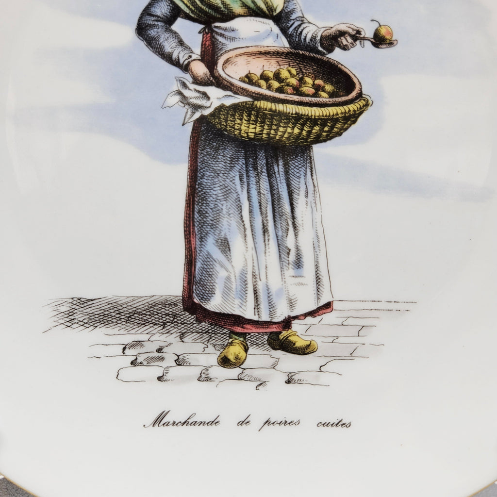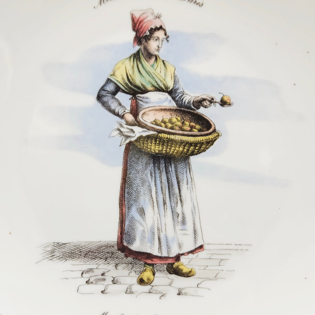 Sammelteller aus der Serie "Métiers du Vieux Paris" (Berufe des alten Paris) mit der Darstellung einer Marchande de poires cuites, einer Verkäuferin von pochierten Birnen in den Straßen von Paris im 19.